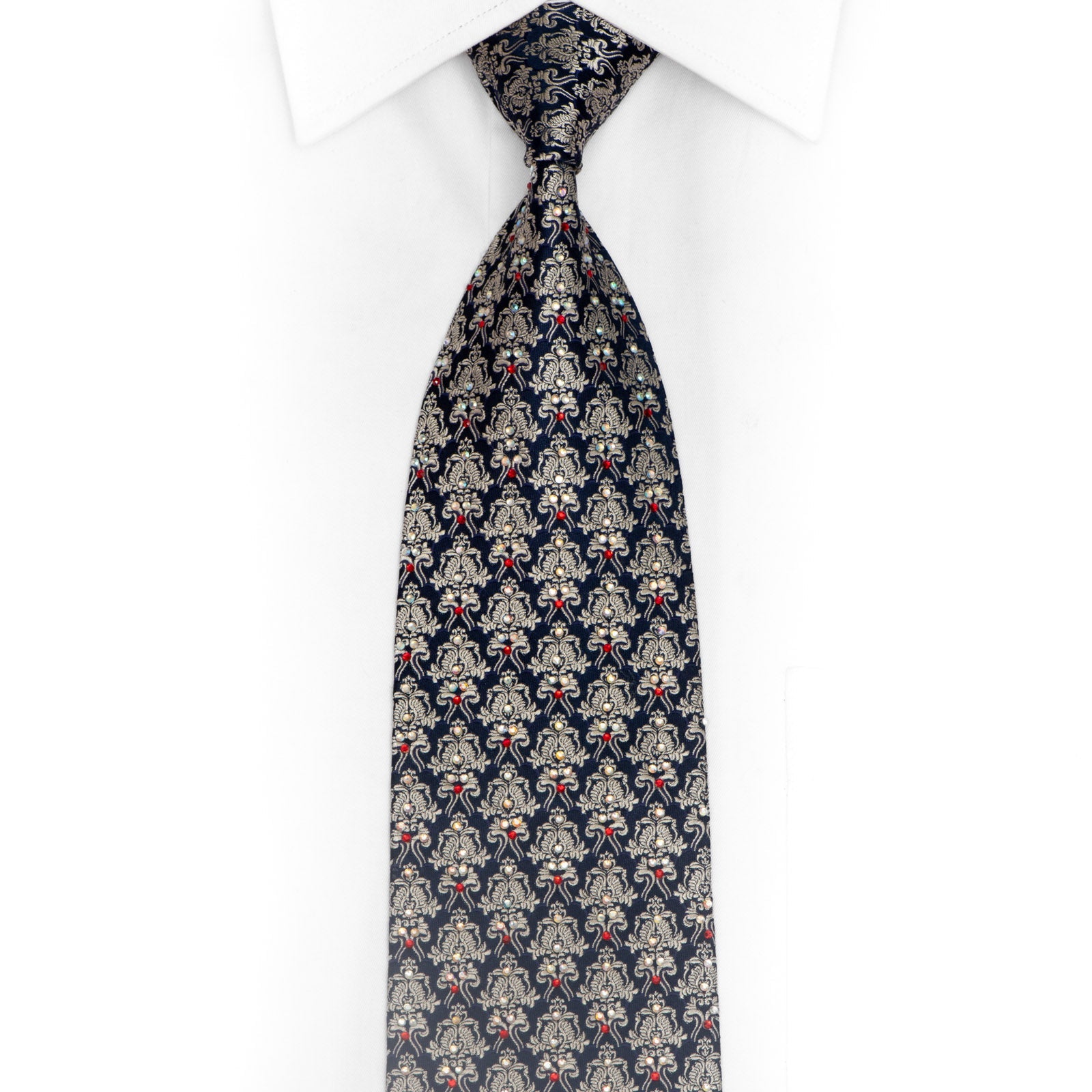 Looking for a stylish and luxurious accessory? This Gold Cartouche On Navy Blue Rhinestone Silk Necktie is the perfect choice.