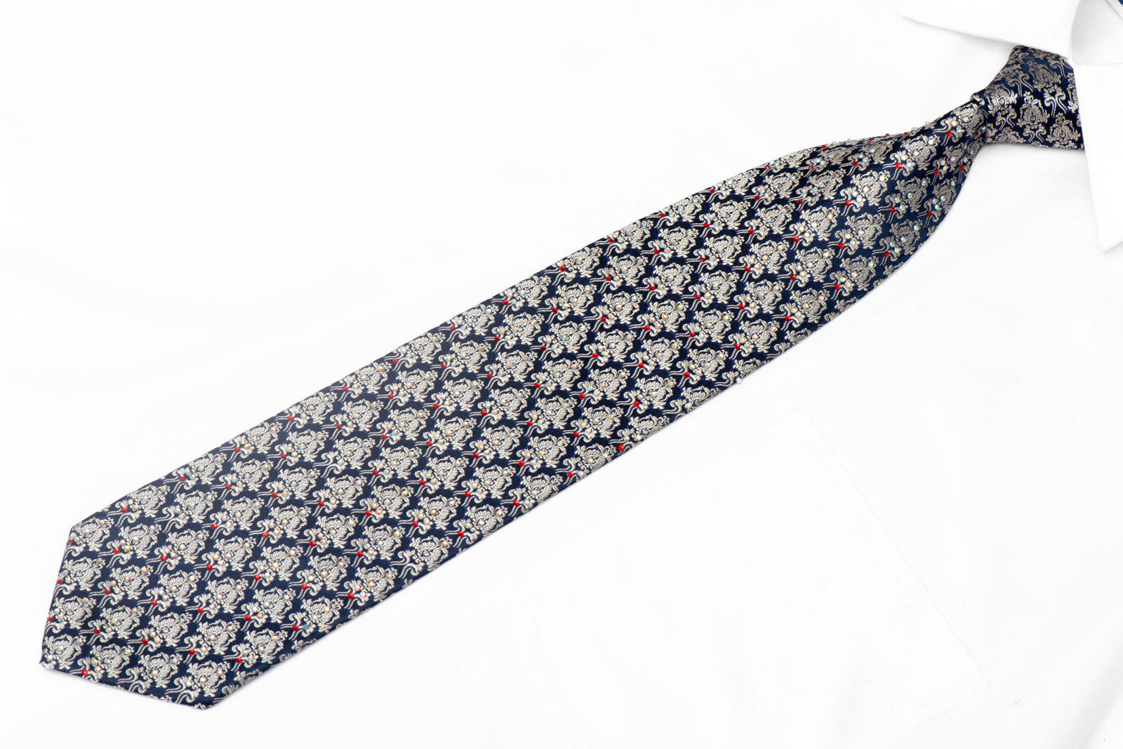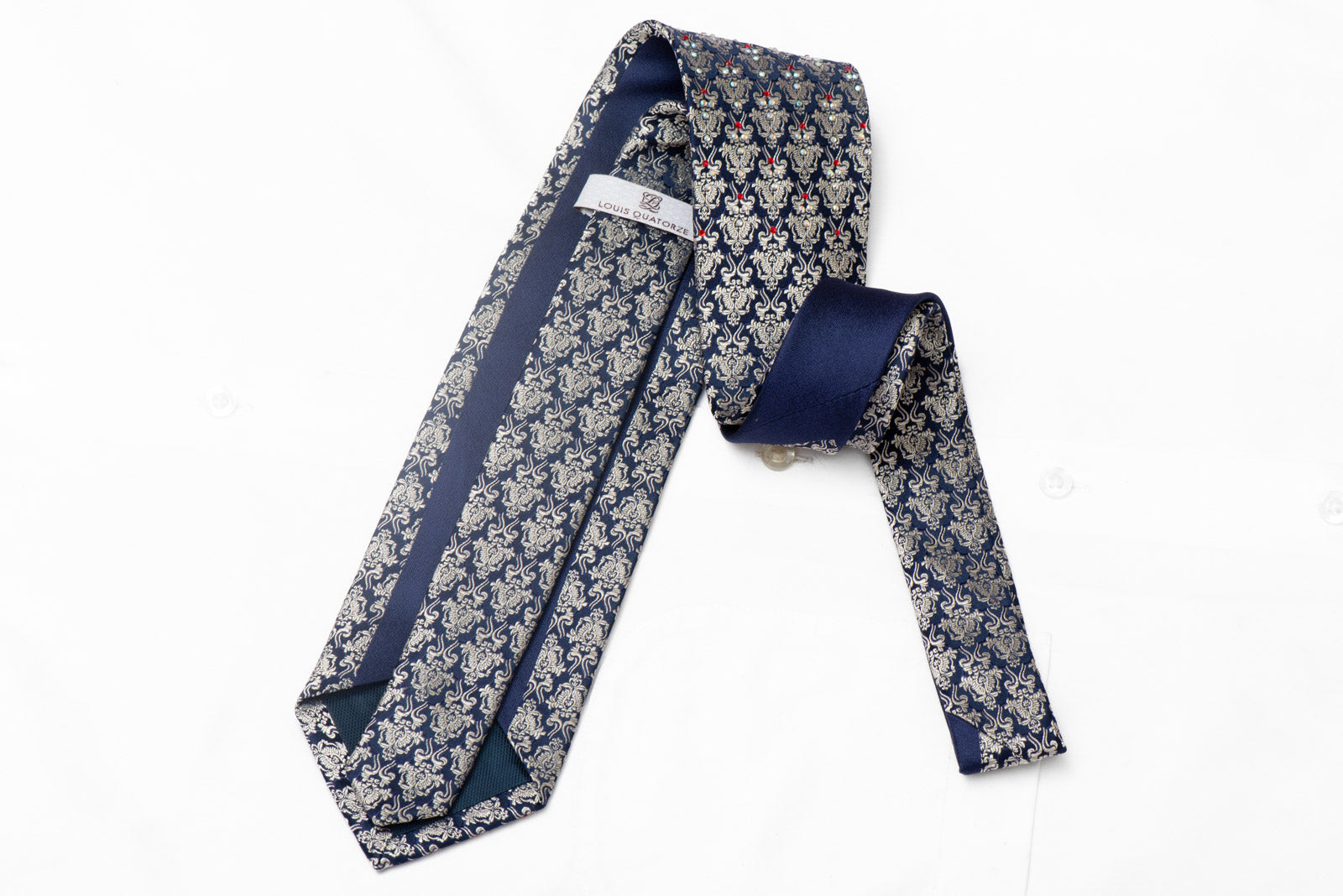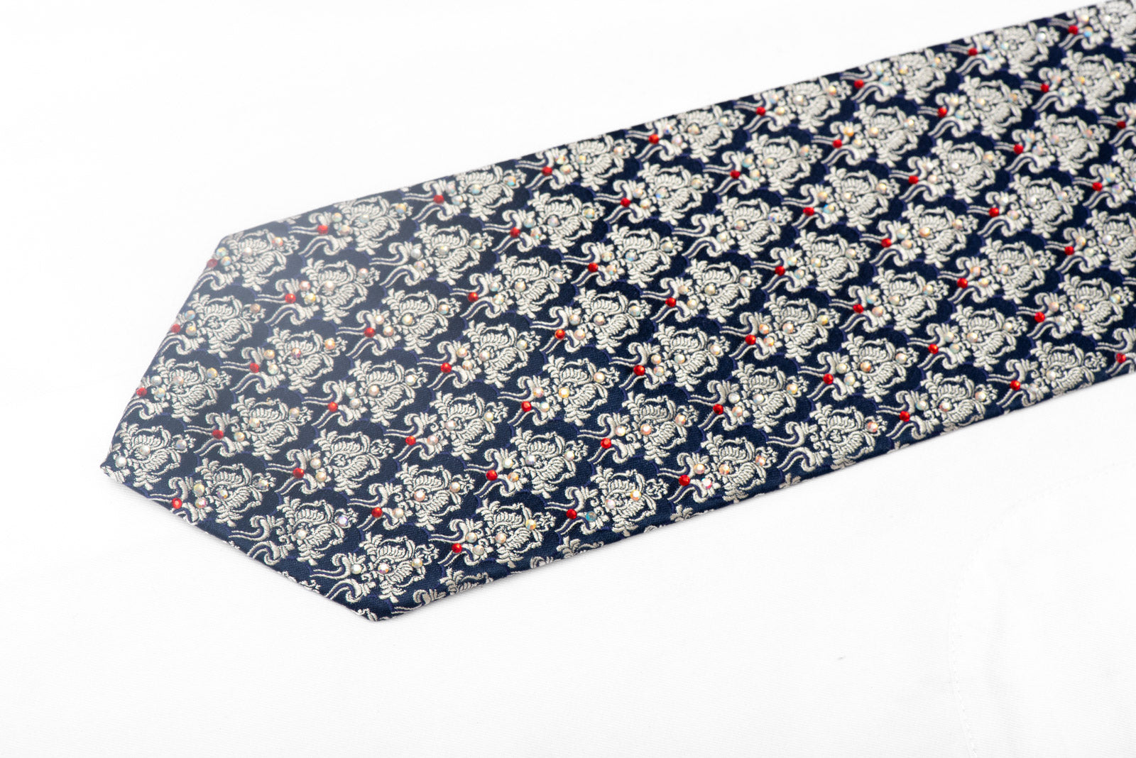 Gold Cartouche On Navy Blue Rhinestone Silk Necktie - 1