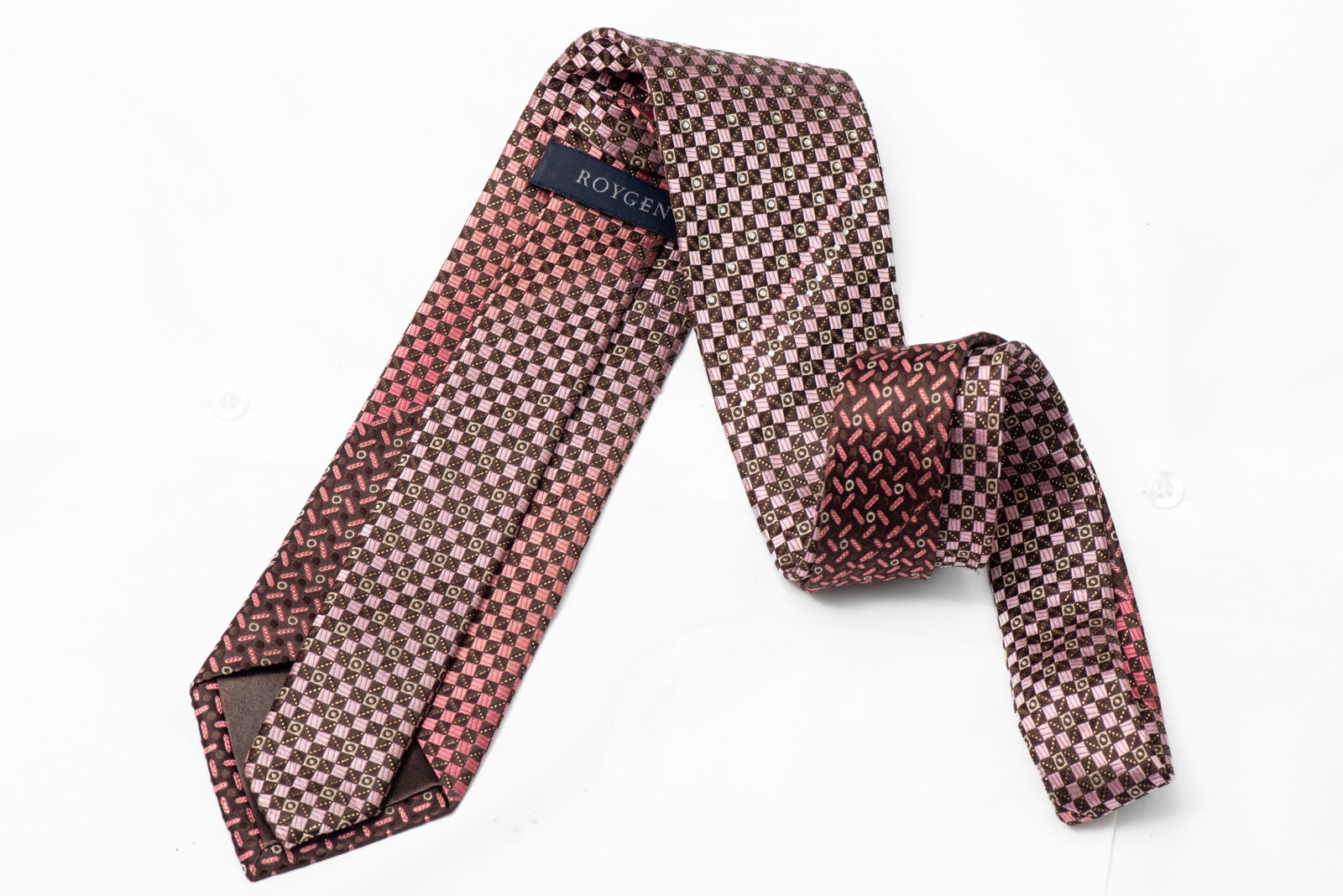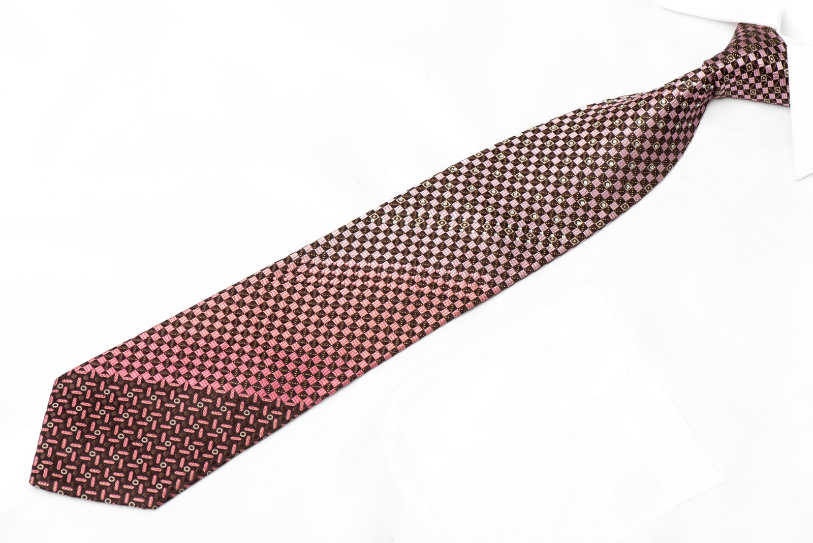 Brown Pink Checkered Rhinestone Silk Tie With Silver