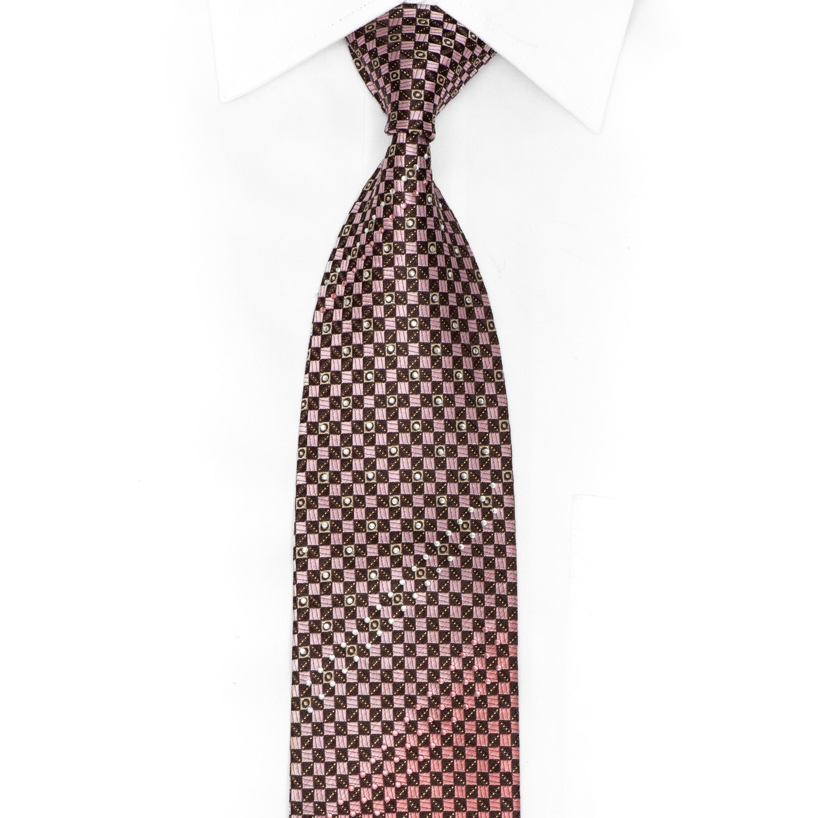 Brown Pink Checkered Rhinestone Silk Tie With Silver Sparkles
