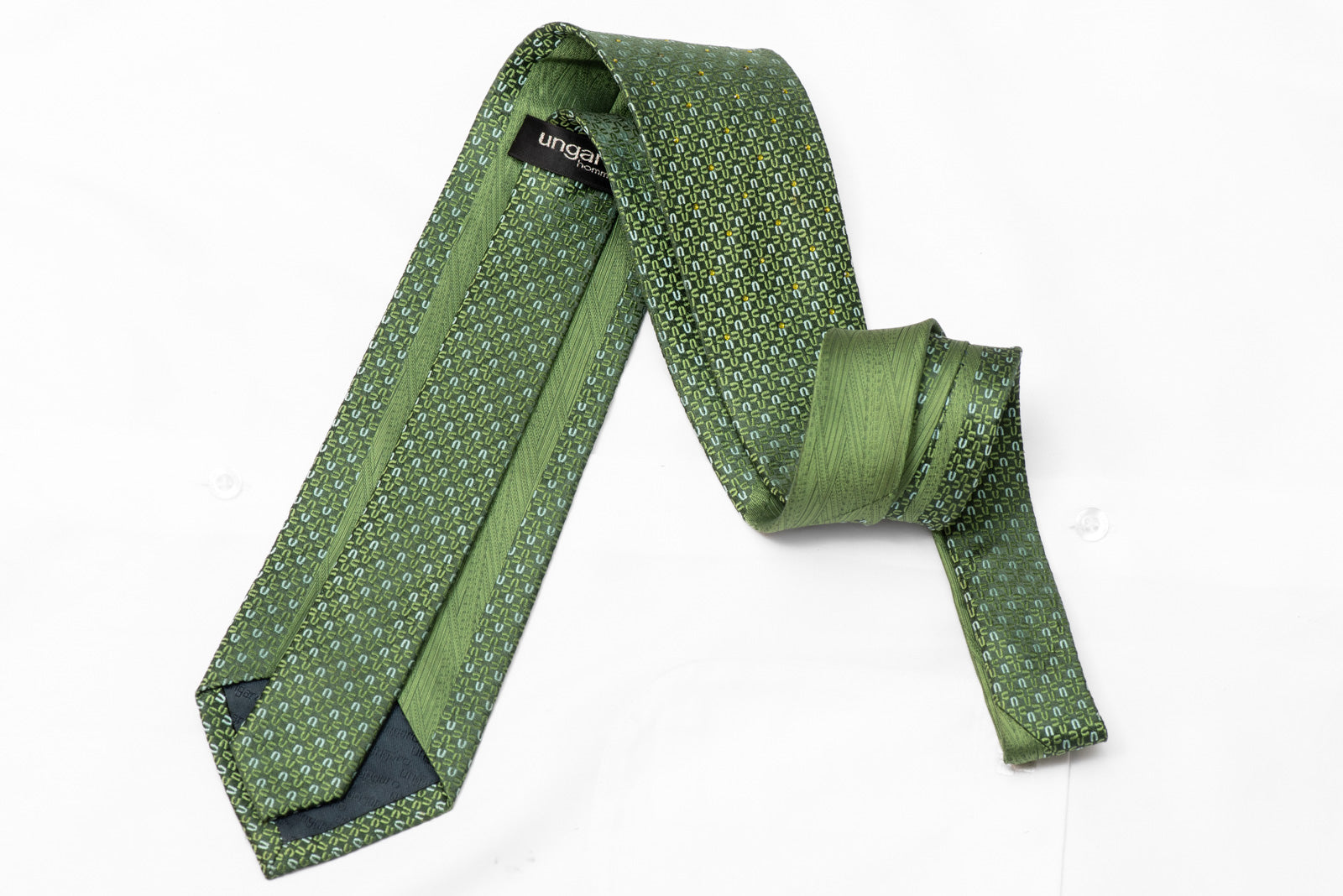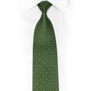 Elevate your ensemble with this exquisite silk tie featuring a refined geometric pattern set against a rich green backdrop, accented subtly by sparkling rhinestones.
