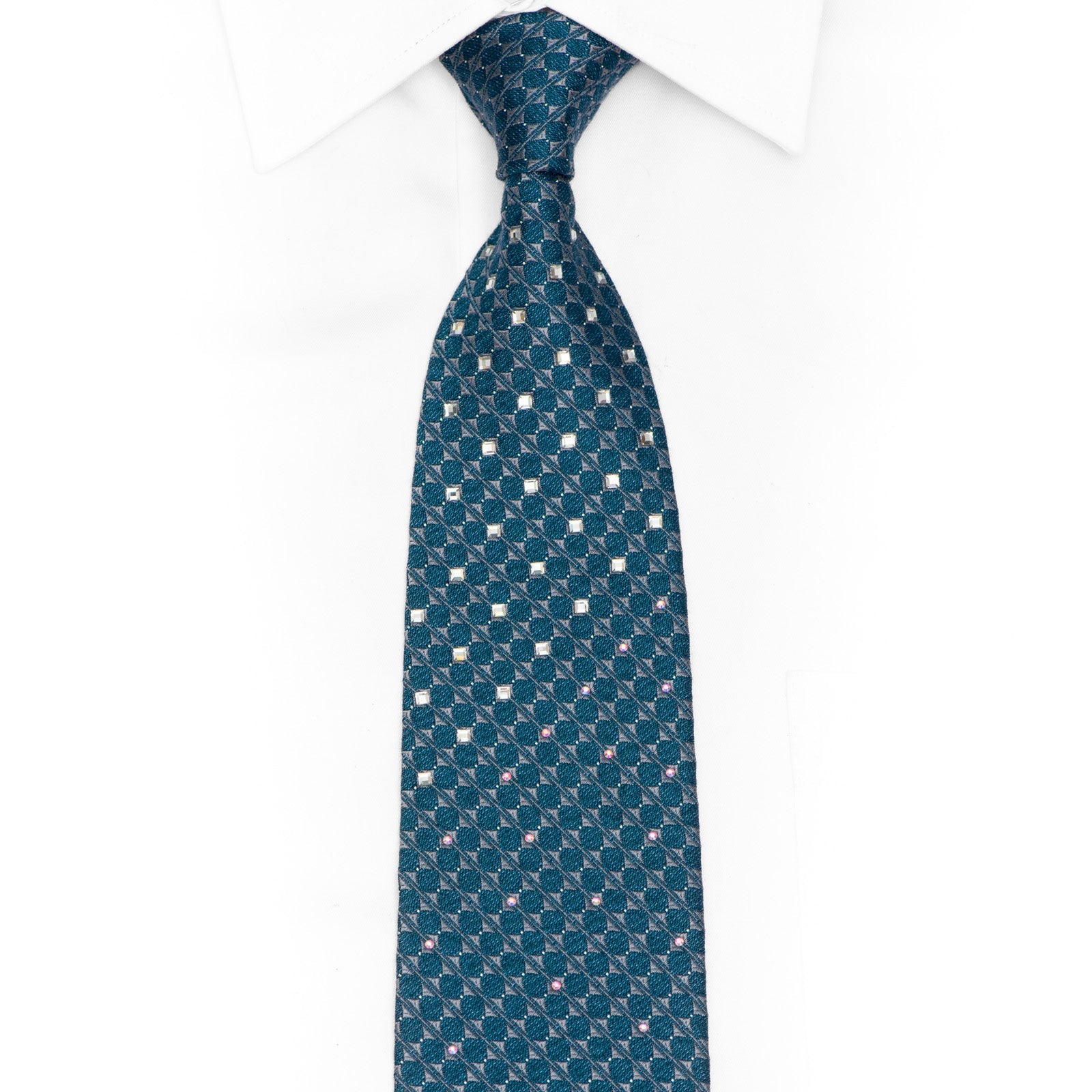 Elevate your attire with this teal silk necktie, adorned with a geometric pattern and shimmering rhinestones for a refined, polished look.