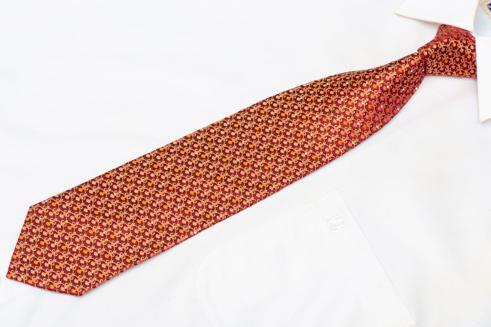 Gold Cartouche On Burgundy Rhinestone Silk Necktie With Gold Sparkles