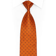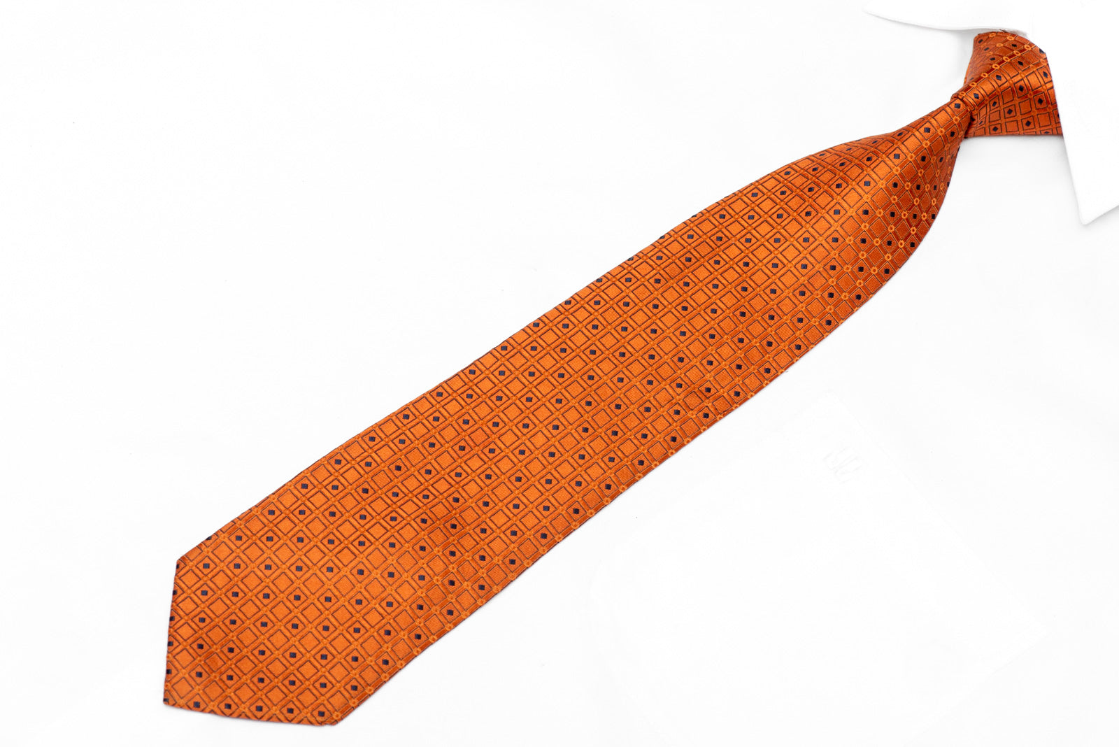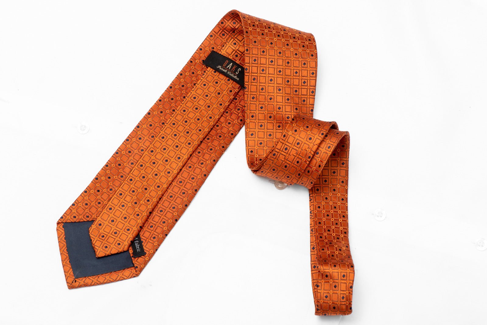Elevate your formal wardrobe with this striking silk tie, where deep navy geometric squares create a bold contrast against a vibrant orange base. The refined pattern strikes the perfect balance between contemporary design and timeless elegance, making it an ideal choice for business meetings, special occasions, or anyone seeking to make a confident style statement. Crafted from premium silk, this tie drapes beautifully and adds instant sophistication to any ensemble.