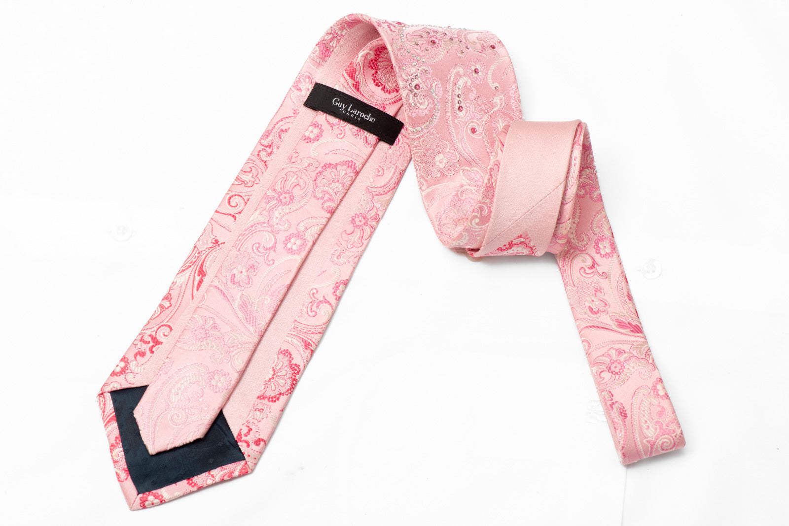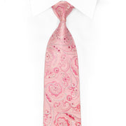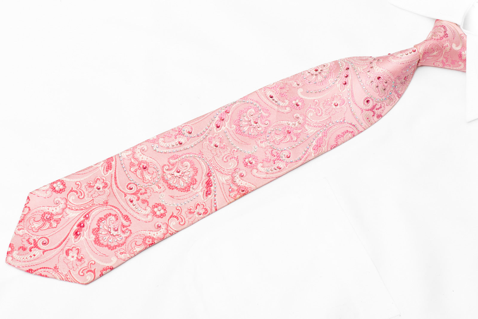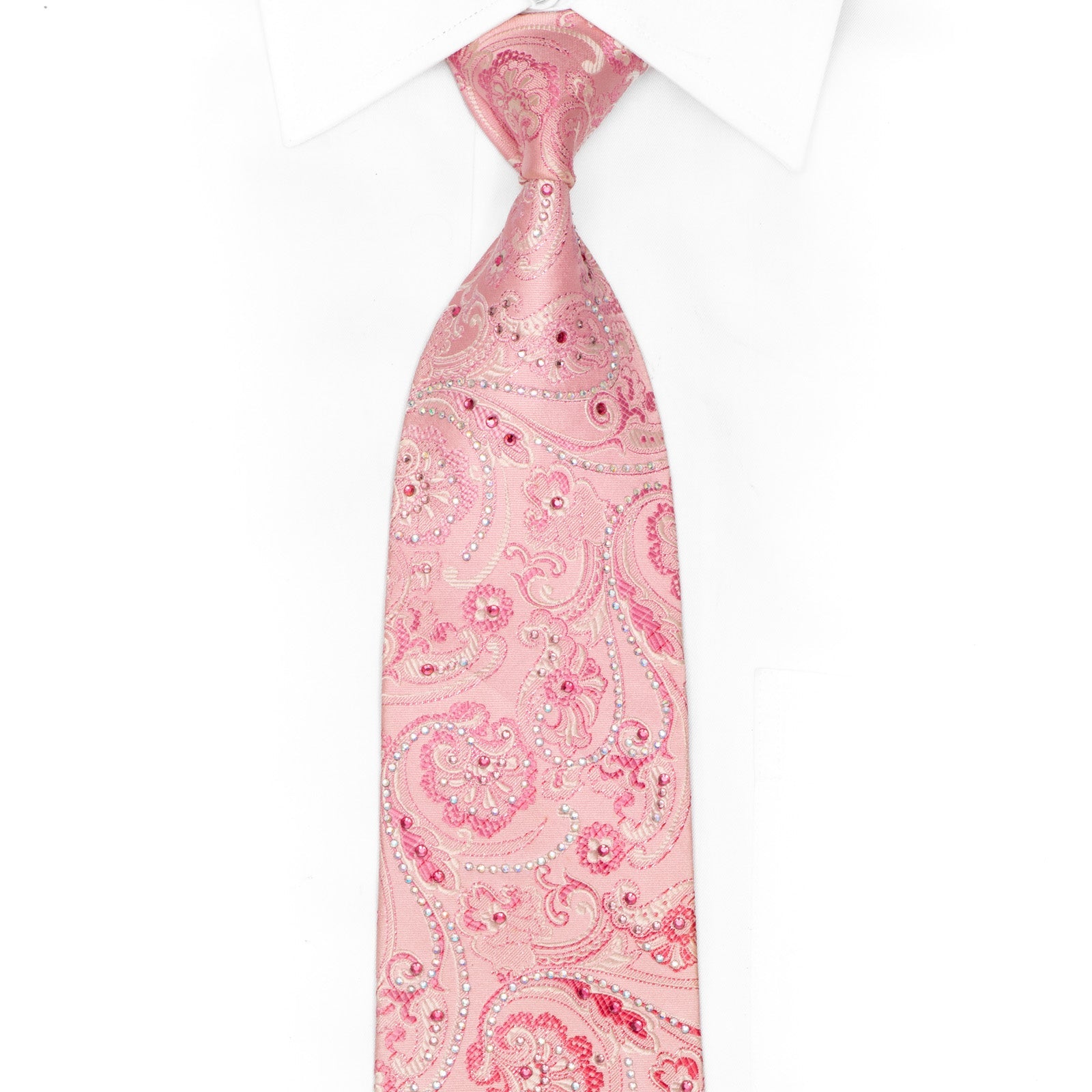 Elevate your style with this silk necktie featuring a paisley pattern on a soft pink background, accented by dazzling pink rhinestones for a sparkling finish.