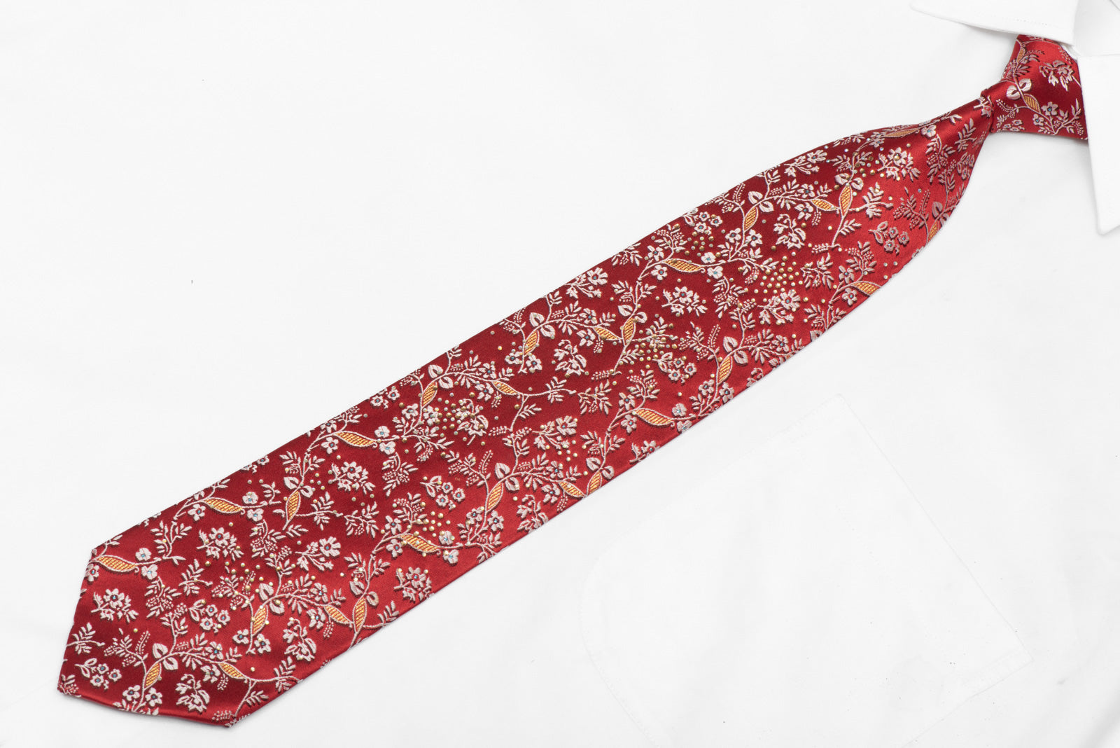 This stylish silk tie features a beautiful silver floral design on a red background, accented with rhinestones and a touch of gold, blue and silver sparkles.