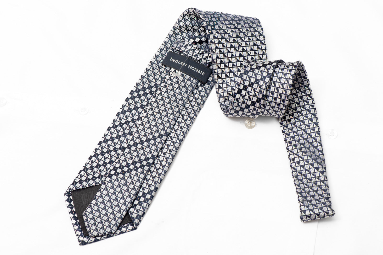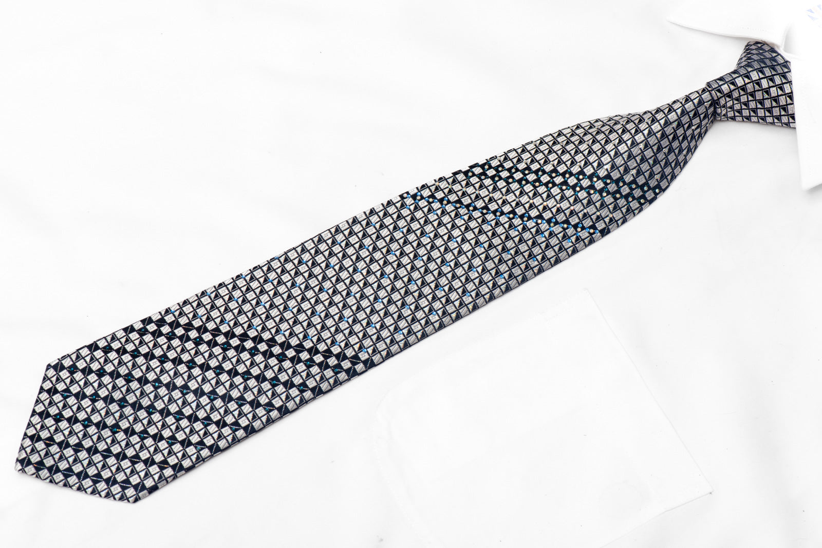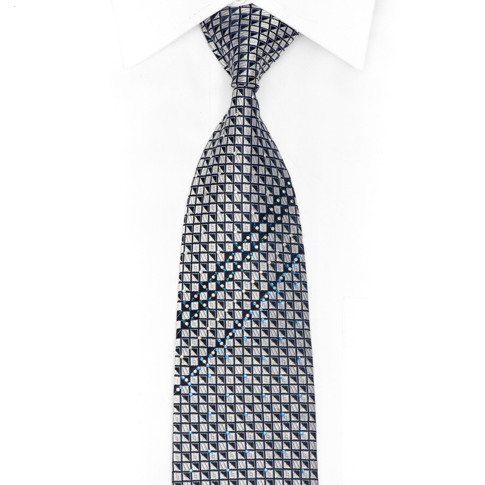 Elevate your style with this navy blue necktie, featuring a striking silver geometric checkered pattern adorned with radiant rhinestones and shimmering silver sparkles for a confident, polished look.