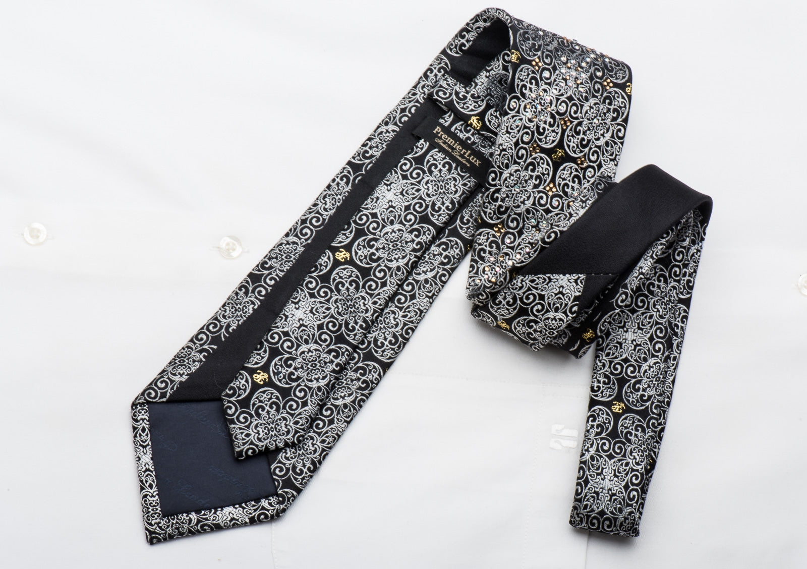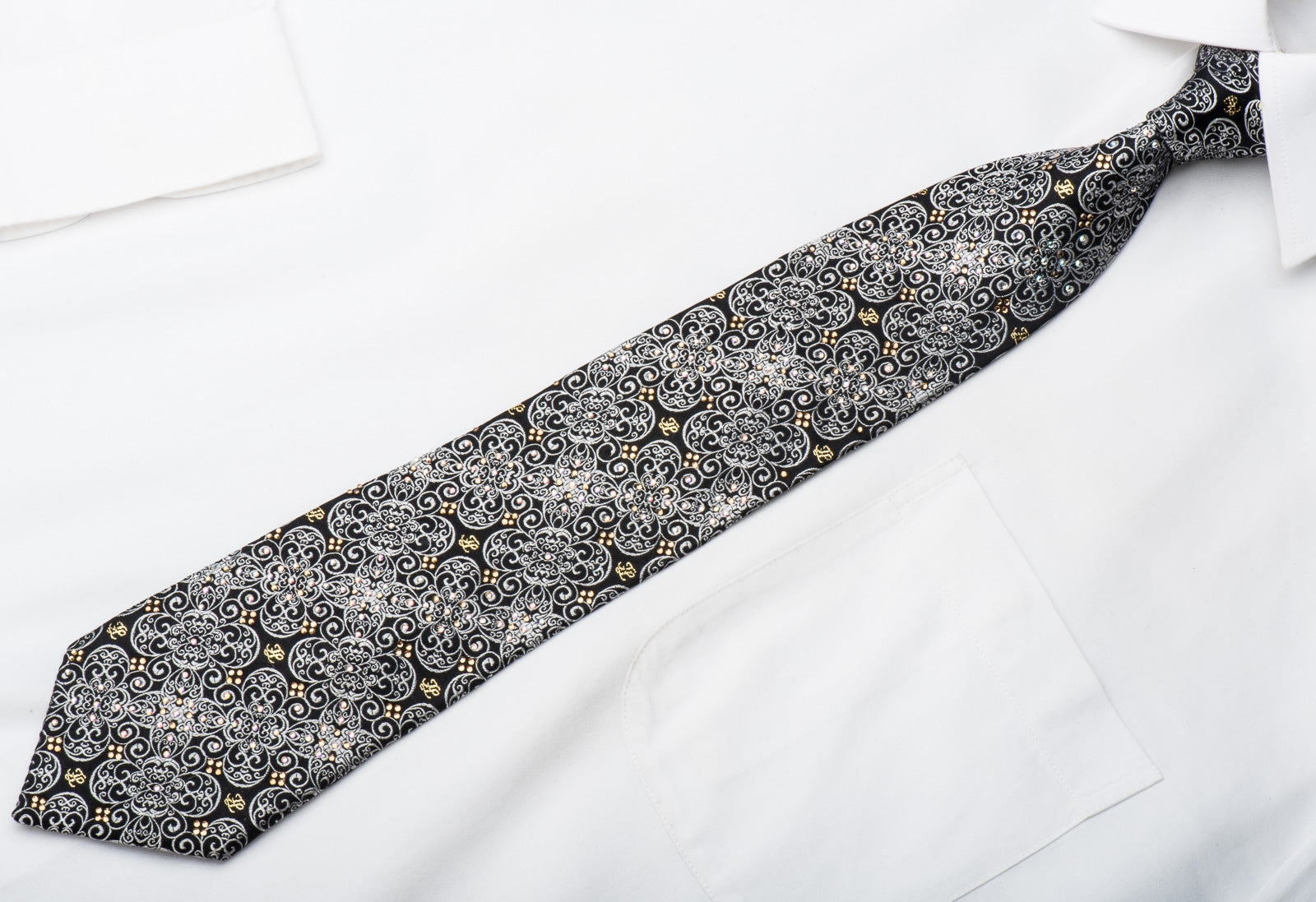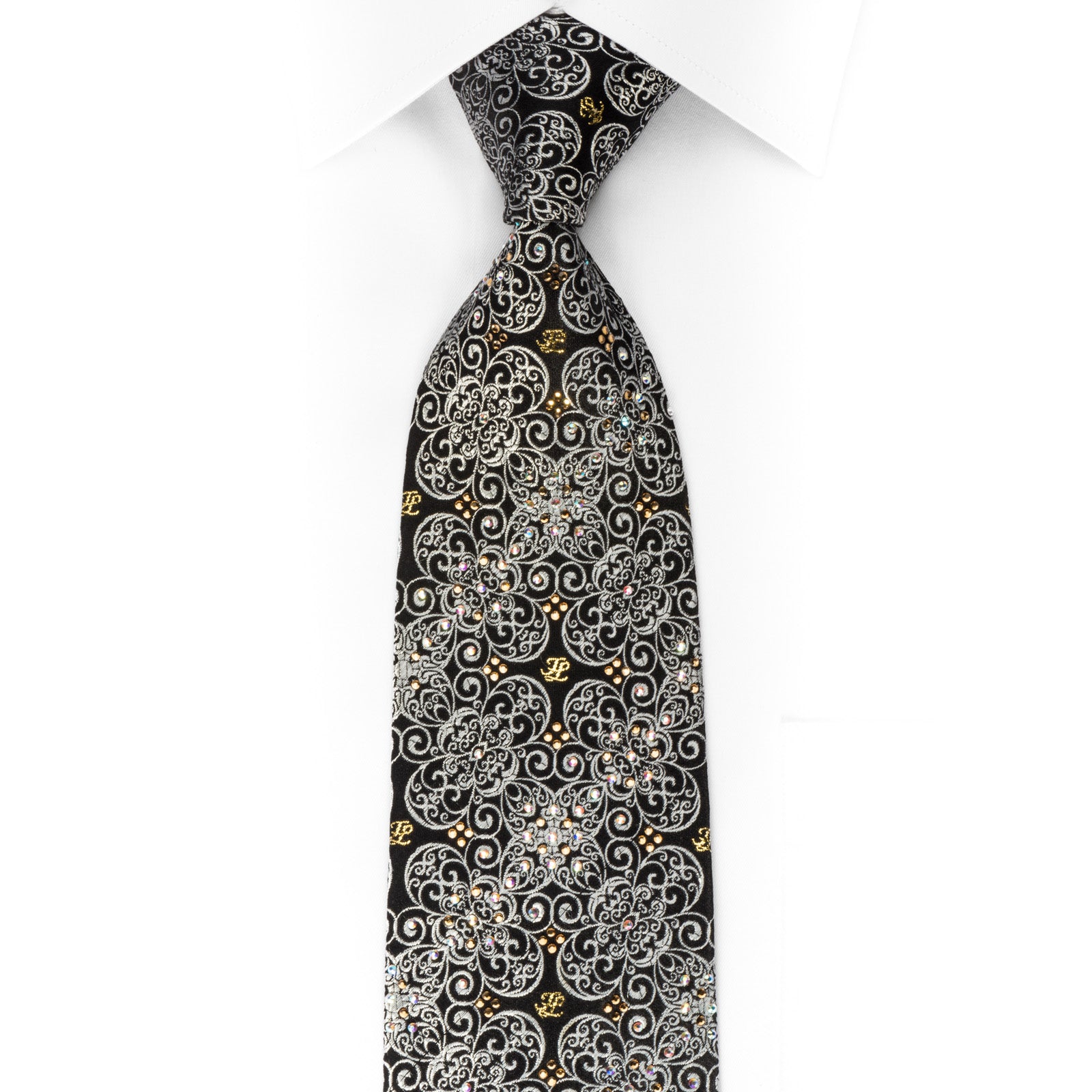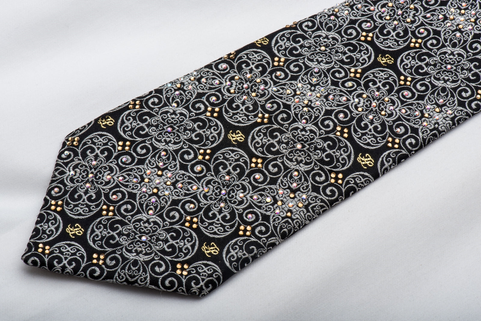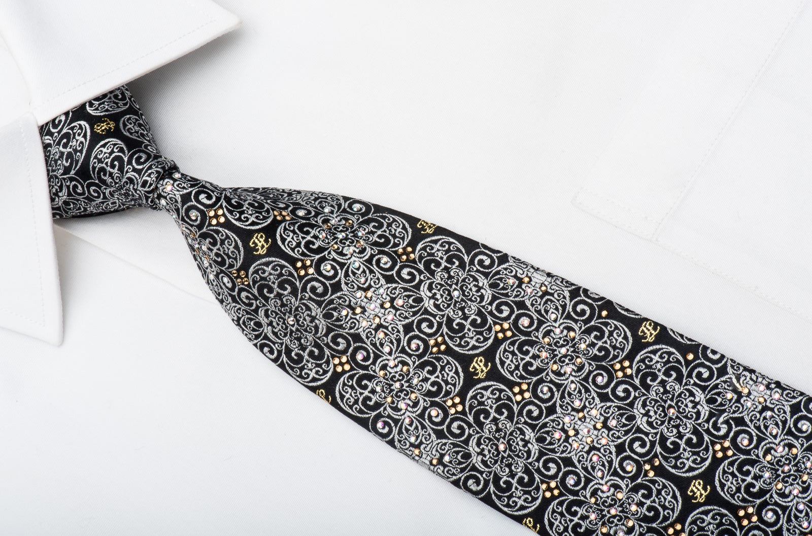 This stunning necktie is handcrafted with the finest silk and features a gorgeous silver Filigree pattern against the black silk background, adorned with shimmering clear gold and Crystal AB Rhinestones.