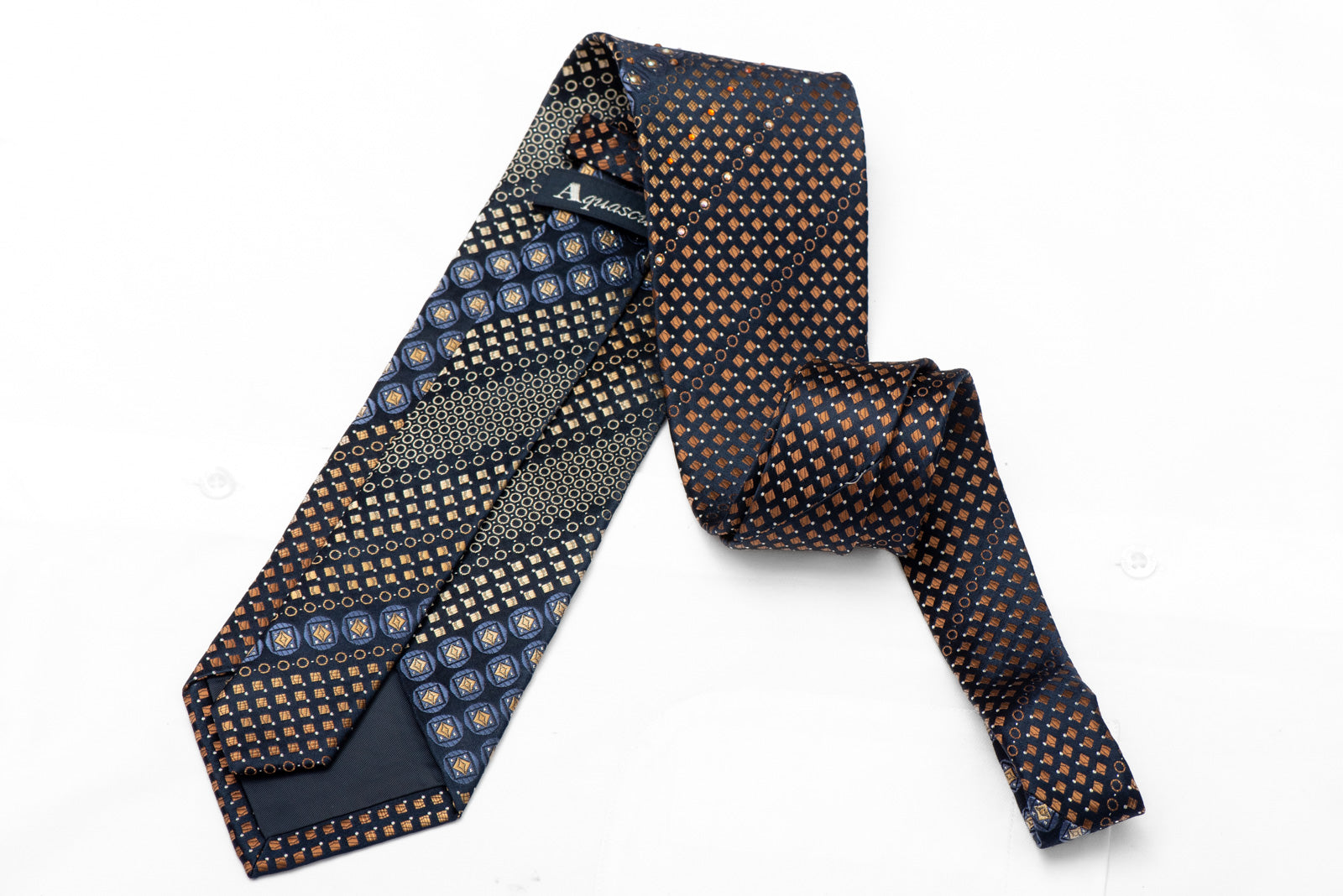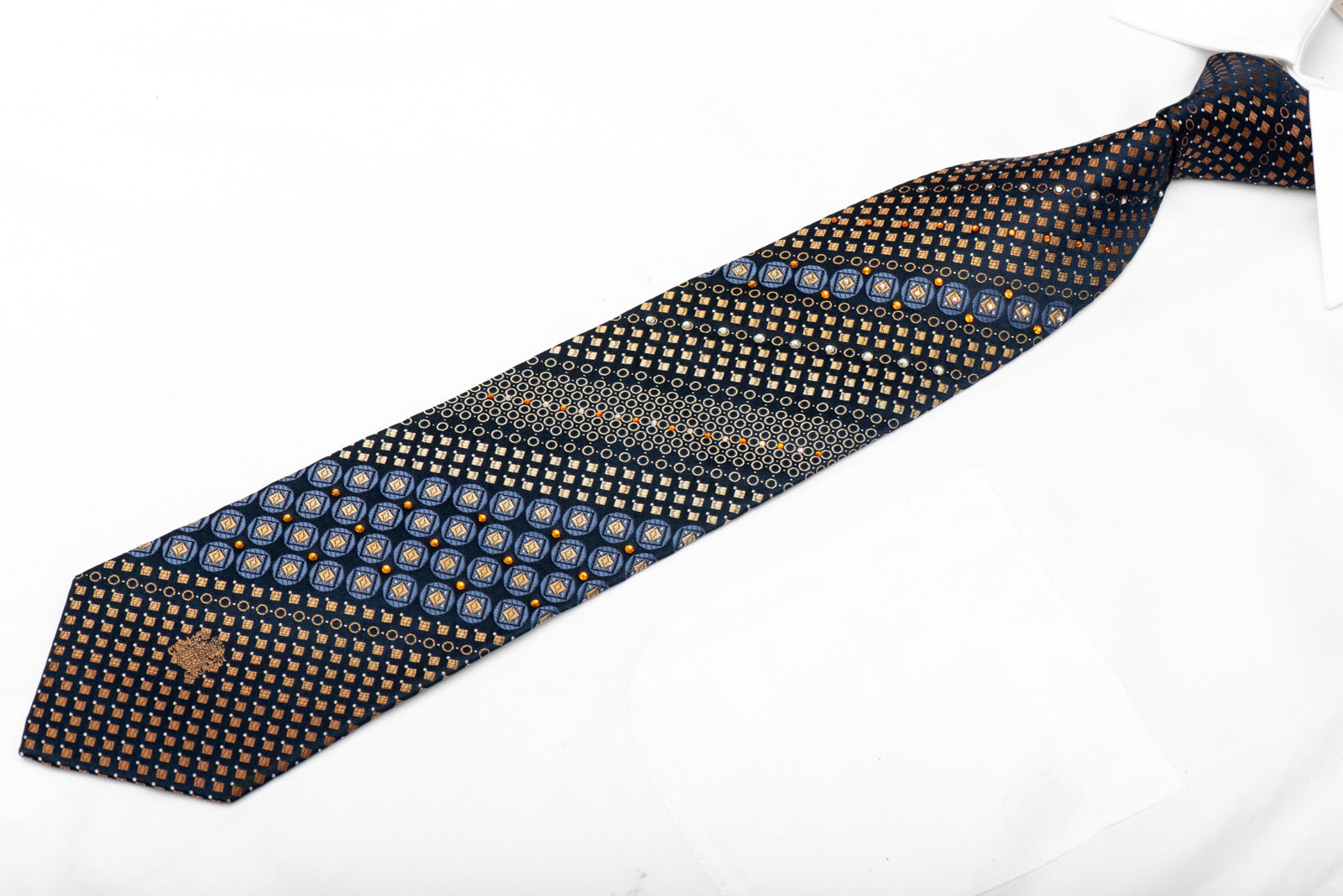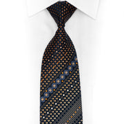 Elevate your formal wardrobe with this striking silk tie featuring a sophisticated navy base adorned with brown and blue geometric patterns. Shimmering rhinestones and silver sparkles catch the light beautifully, adding an extra touch of elegance and personality to any suit. Perfect for weddings, special events, or when you want to make a confident statement, this premium tie combines classic style with modern flair. The luxurious silk fabric drapes beautifully and feels wonderful against your neck, ensuring you look and feel your best throughout the day.