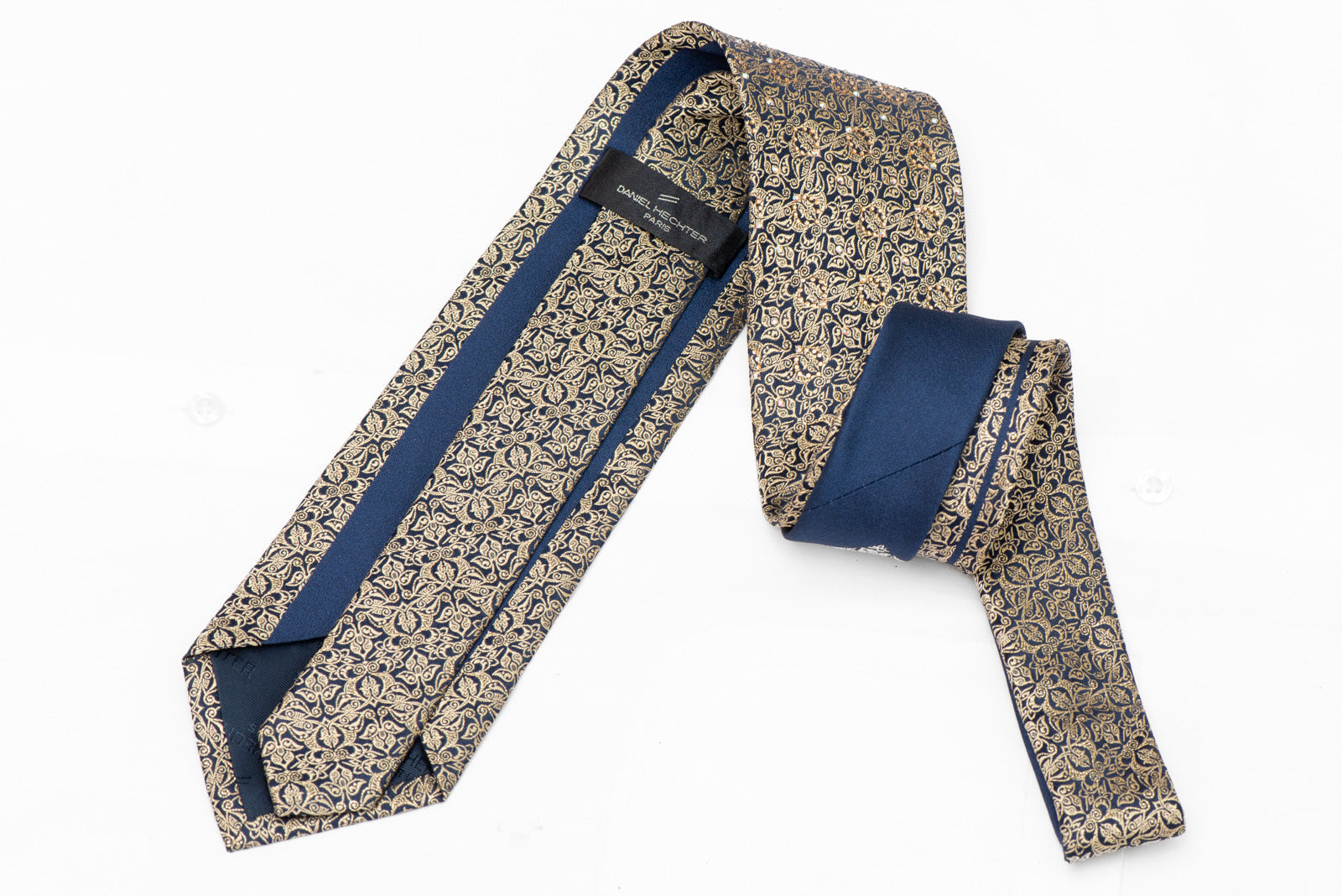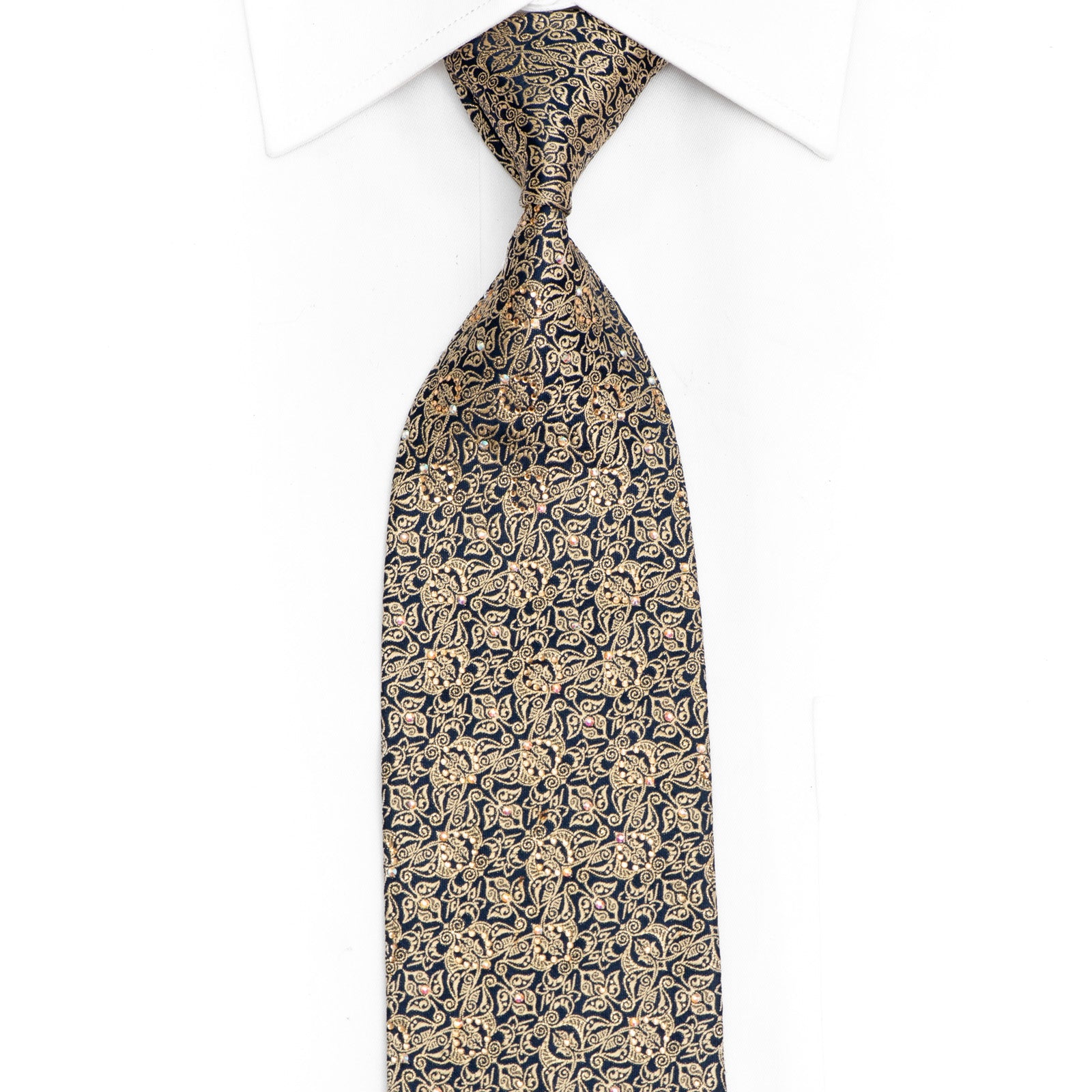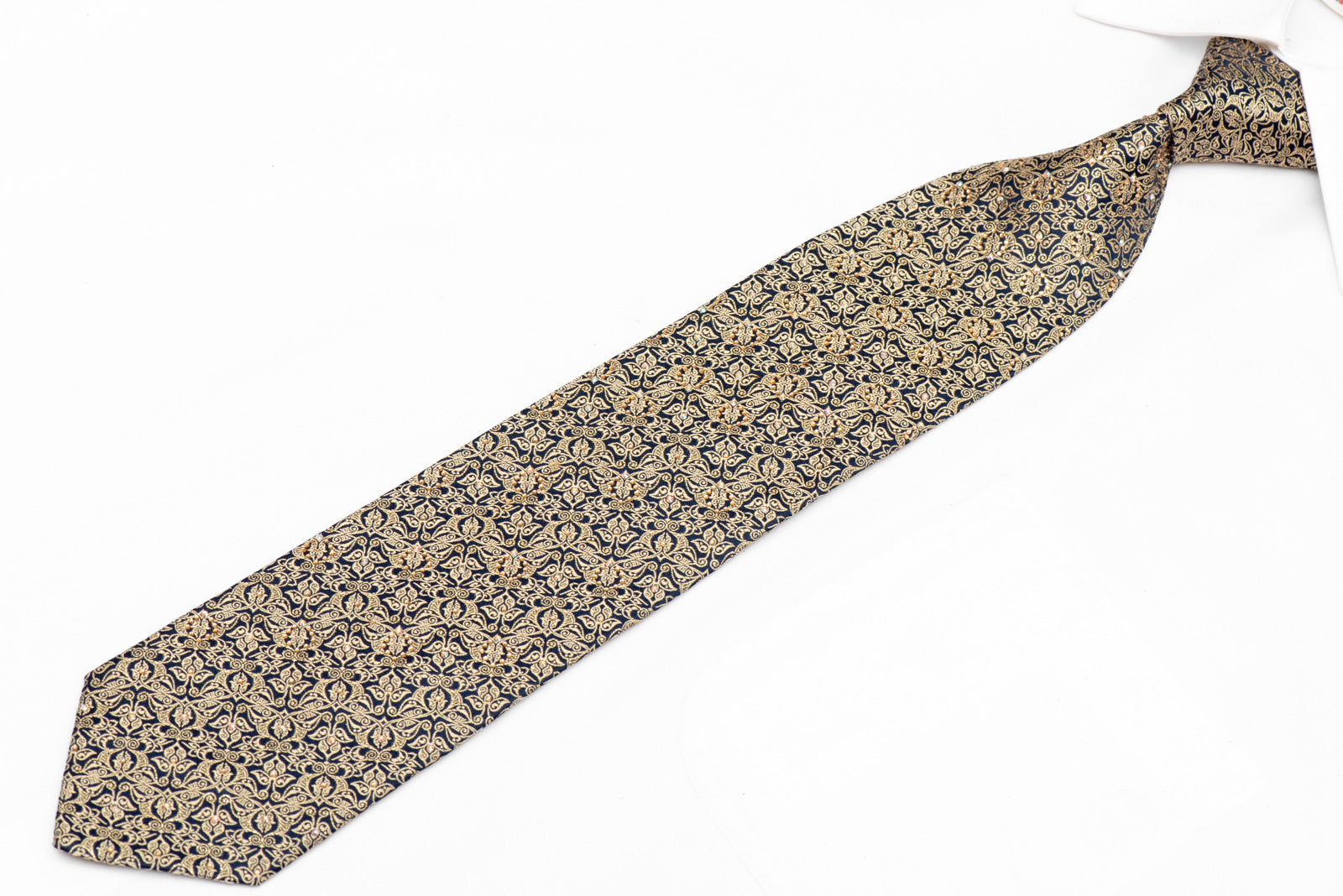 Gold Ornate Design On Navy Rhinestone Crystal Tie With Gold Sparkles