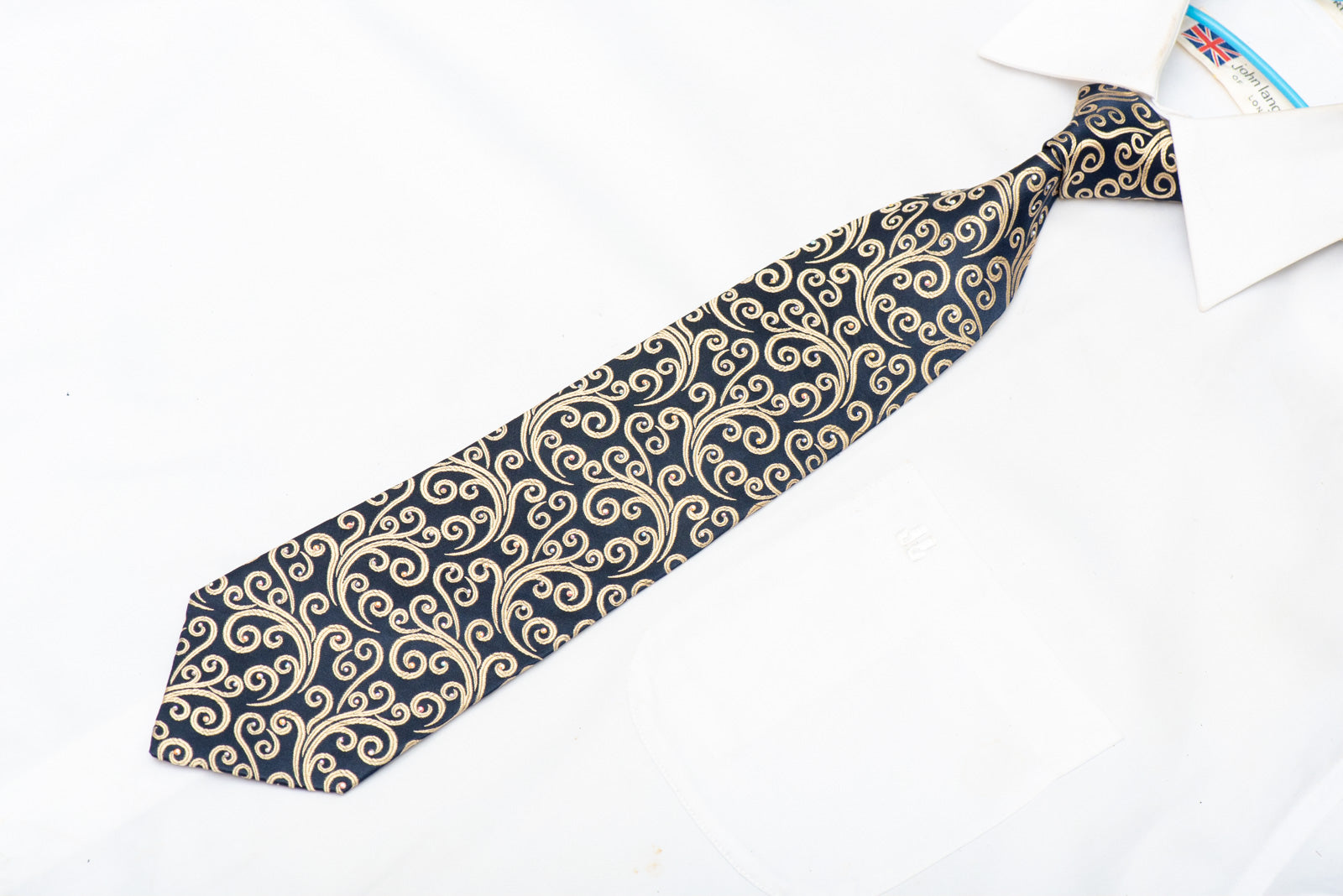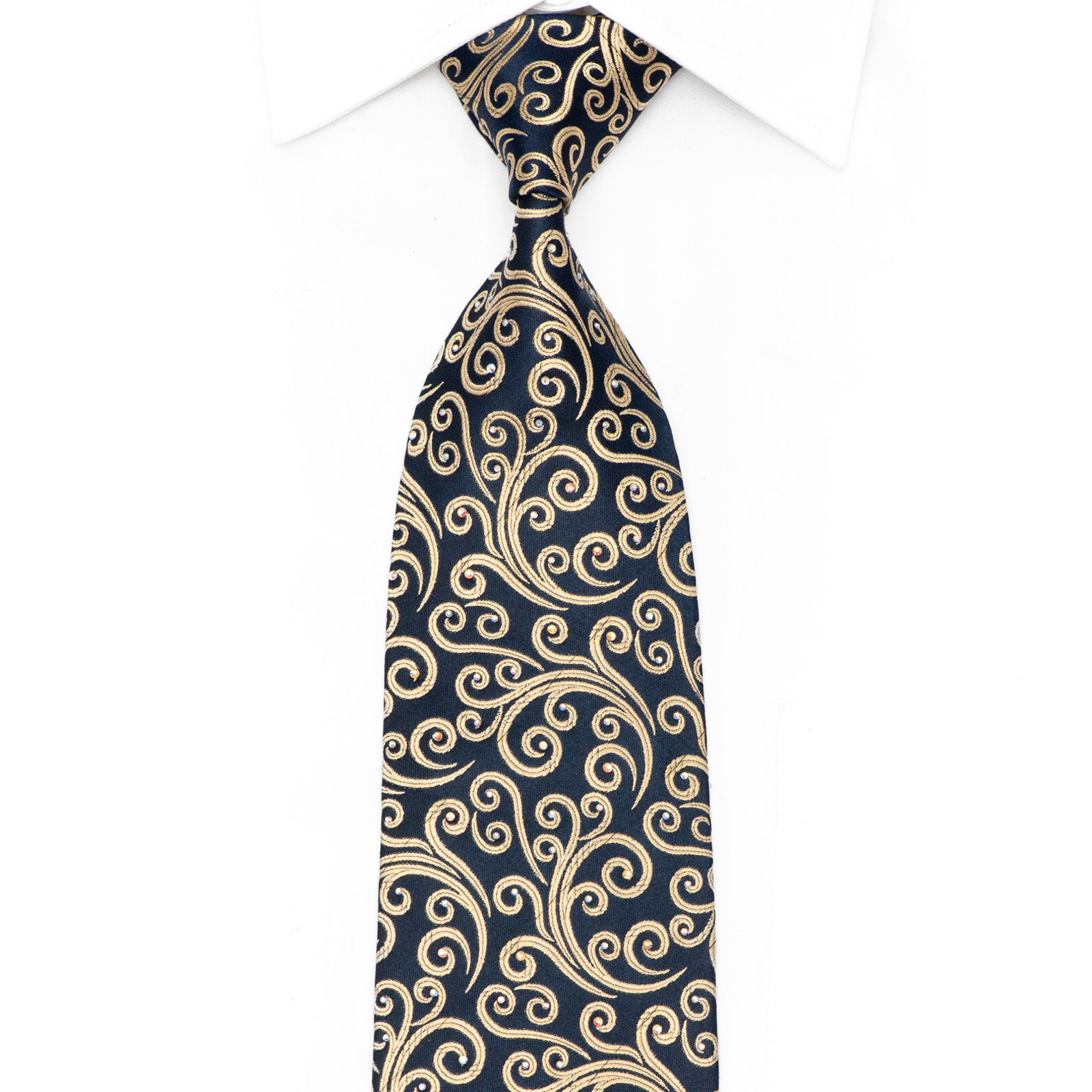 Elevate your formal wardrobe with this stunning navy blue necktie, adorned with intricate gold scroll patterns and shimmering rhinestones that catch the light beautifully. The luxurious gold sparkles add a touch of sophistication and elegance to any suit, making it perfect for weddings, galas, or special occasions. This eye-catching accessory combines classic style with modern glamour, ensuring you stand out with confidence and refinement.