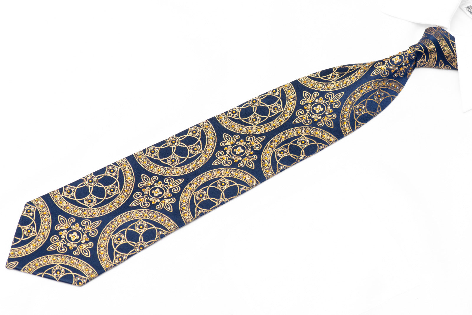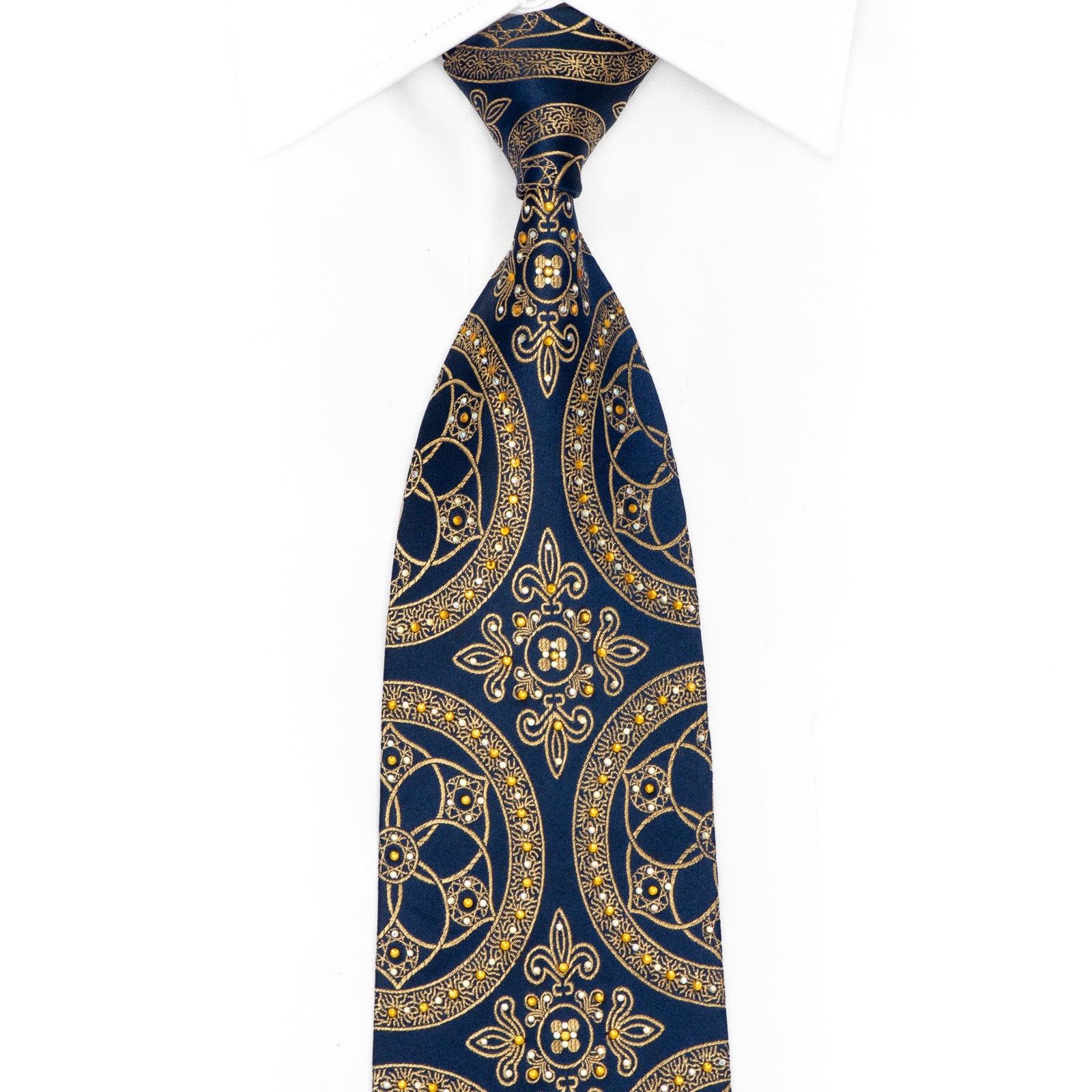 Make a bold statement with this exquisite silk tie showcasing an ornate gold design against a sophisticated navy blue canvas. Embellished with gleaming rhinestones and golden sparkles, this accessory transforms any formal outfit into something truly memorable. Whether you're attending a wedding, celebration, or important event, this tie brings together luxury and artistry in one stunning piece. The premium silk construction ensures a refined drape, while the radiant embellishments add just the right touch of glamour to help you shine with confidence and style.