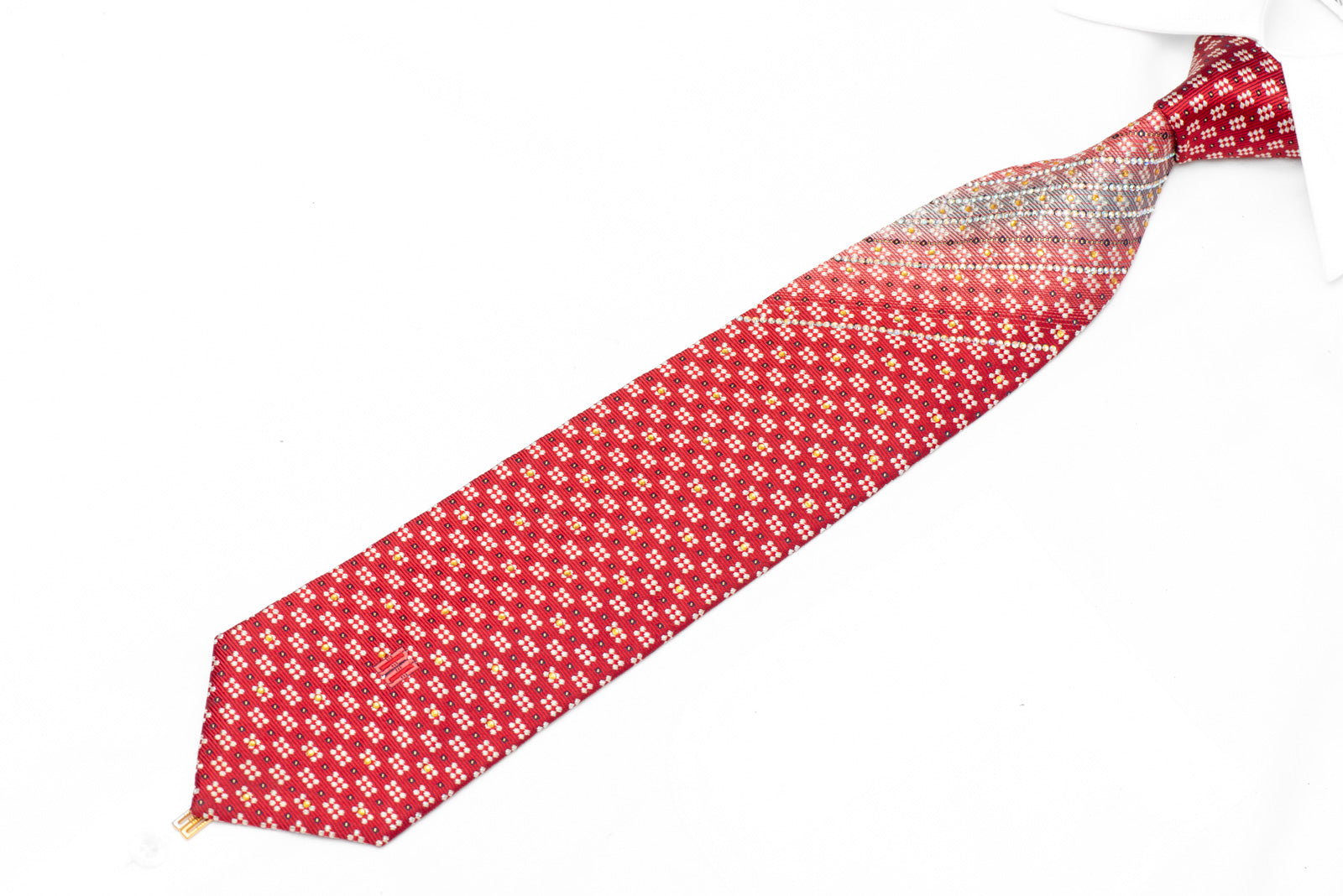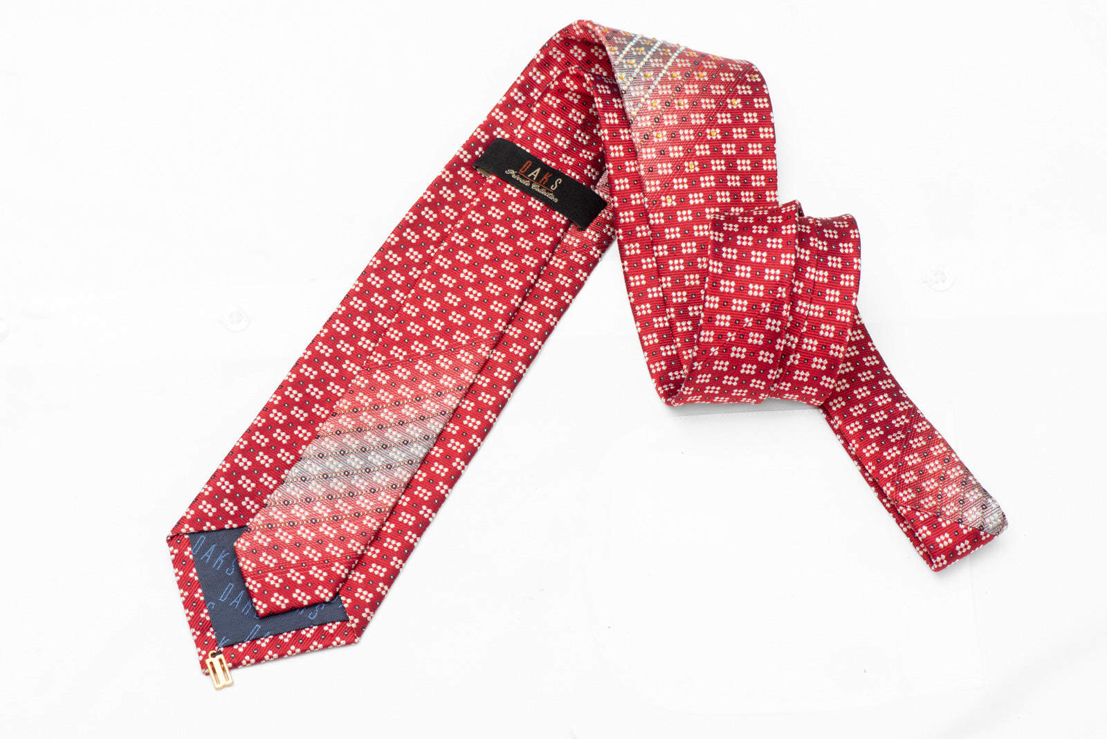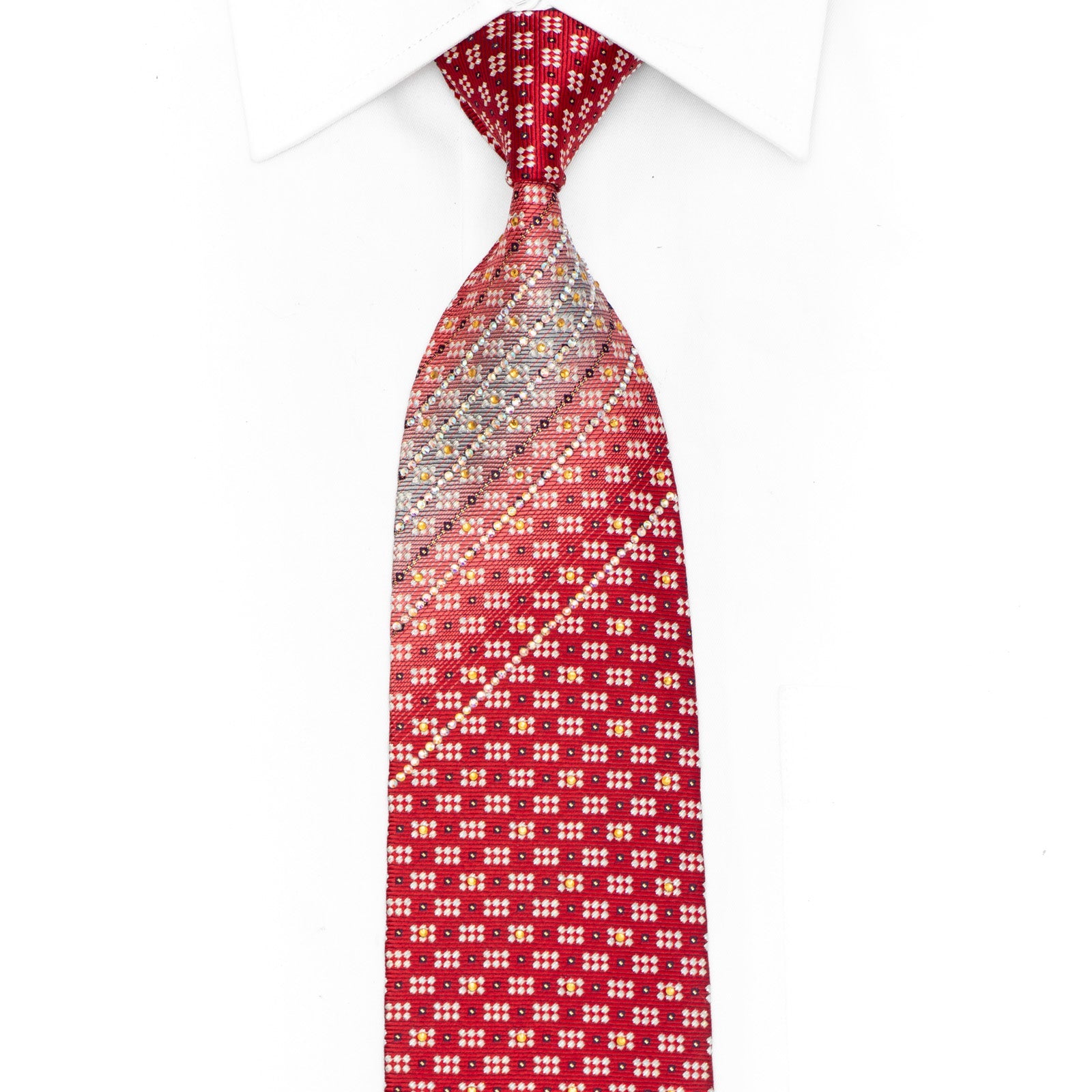 Elevate your formal wardrobe with this striking silk tie featuring bold geometric patterns in silver against a rich red backdrop. Adorned with shimmering rhinestones and silver sparkles, this accessory brings sophisticated glamour to any occasion. The luxurious silk construction ensures a smooth drape and comfortable wear, while the eye-catching design makes a confident statement. Perfect for weddings, galas, or when you want to stand out with refined style and sparkle.