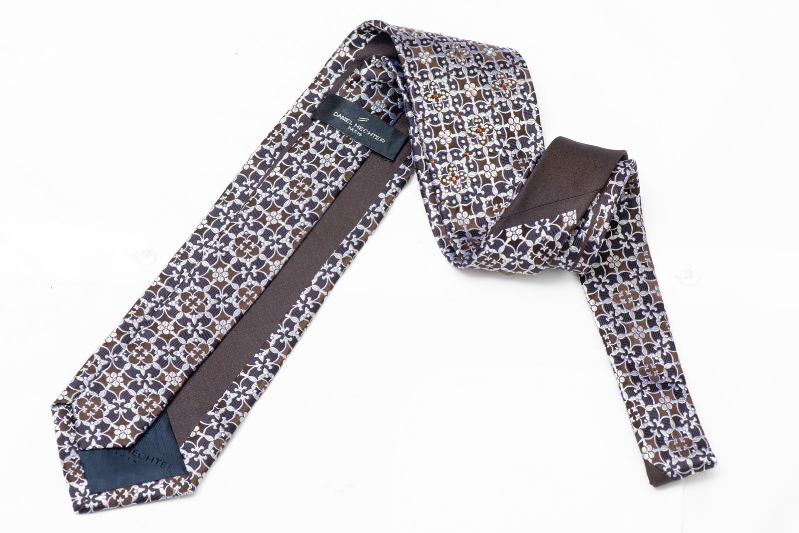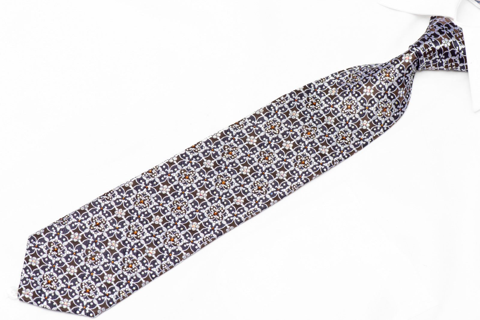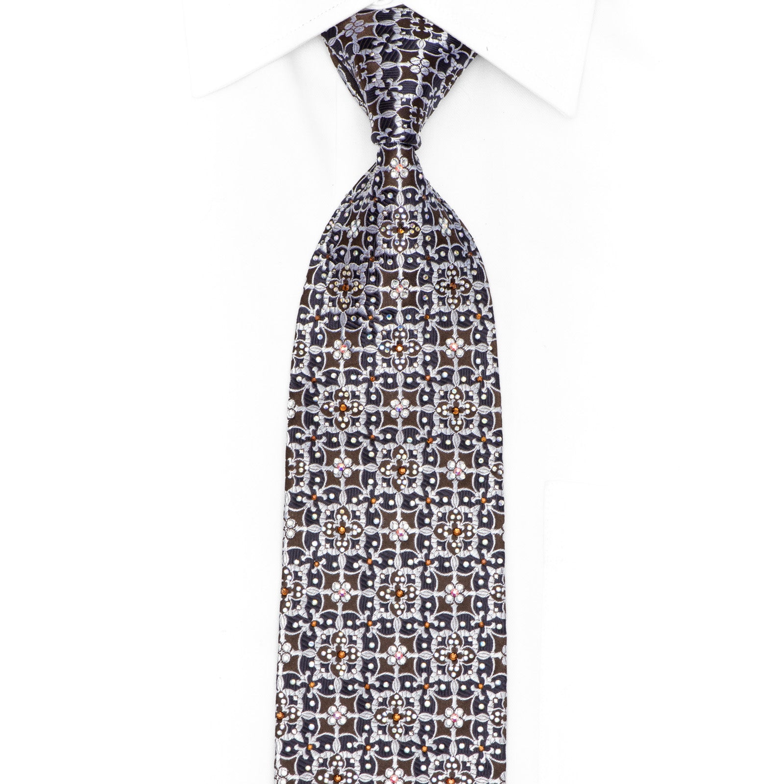 Elevate your formal wardrobe with this stunning silk necktie, featuring an intricate silver ornate pattern set against a rich navy backdrop. Adorned with shimmering rhinestones that catch the light beautifully, this tie brings sophistication and sparkle to any occasion. The luxurious silk construction ensures a smooth drape and comfortable wear throughout your day. Perfect for weddings, galas, or whenever you want to make a polished impression with a touch of glamour.