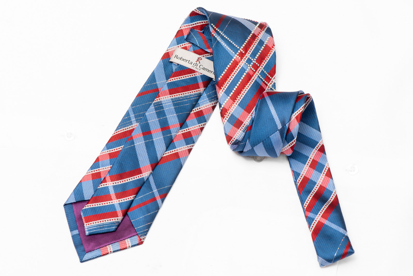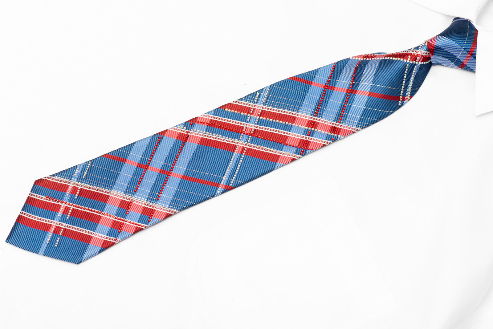 Material - SilkDesign - PlaidColor - Blue, Silver, RedLength - Classic (48 in.-60 in.)(145cm-153 cm)Width - Classic (3 1/4 in.-3 3/4 in.)(8 cm-9.5 cm)Special Features - Rhinestones, Silver Sparkles