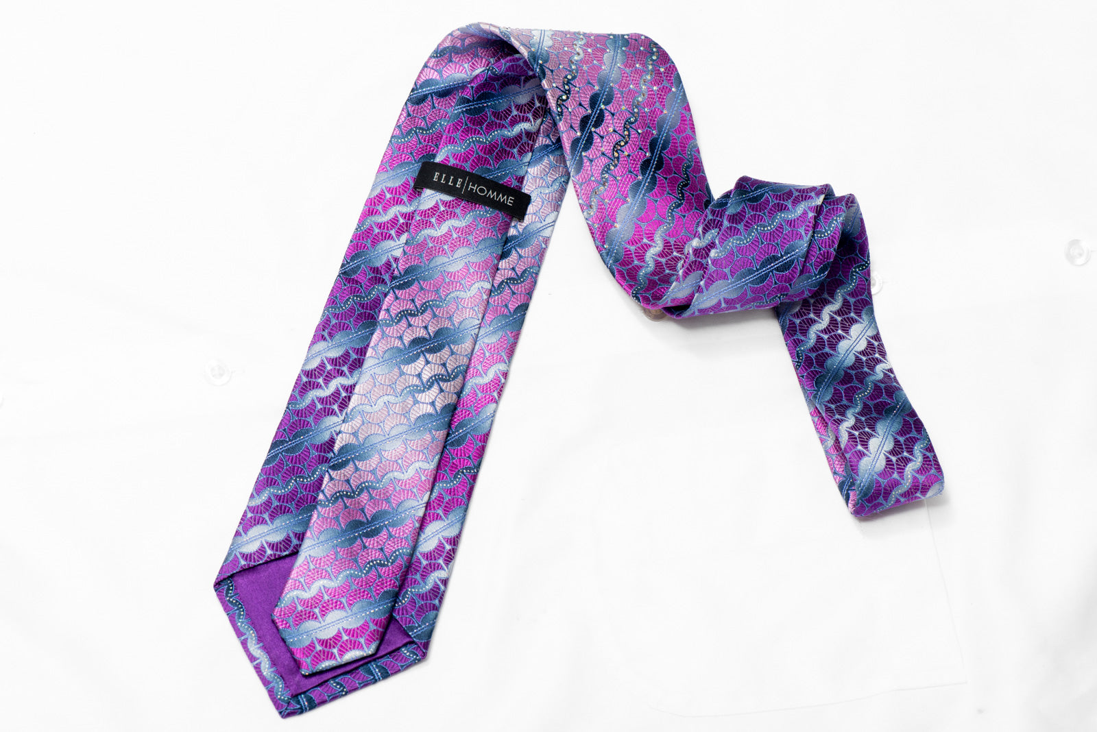 Add some sparkle to your wardrobe with this stunning handmade Rhinestone silk necktie. Featuring a pink and purple woven geometric design on a silver background, embellished with shimmering crystal AB Rhinestones and metallic sparkles. Elevate your style with this beautiful piece.
