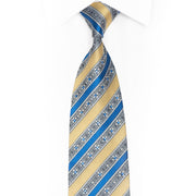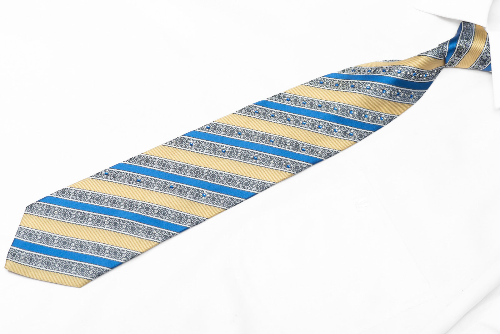 Gold Blue Silver Cartouche Striped Rhinestone Silk Necktie