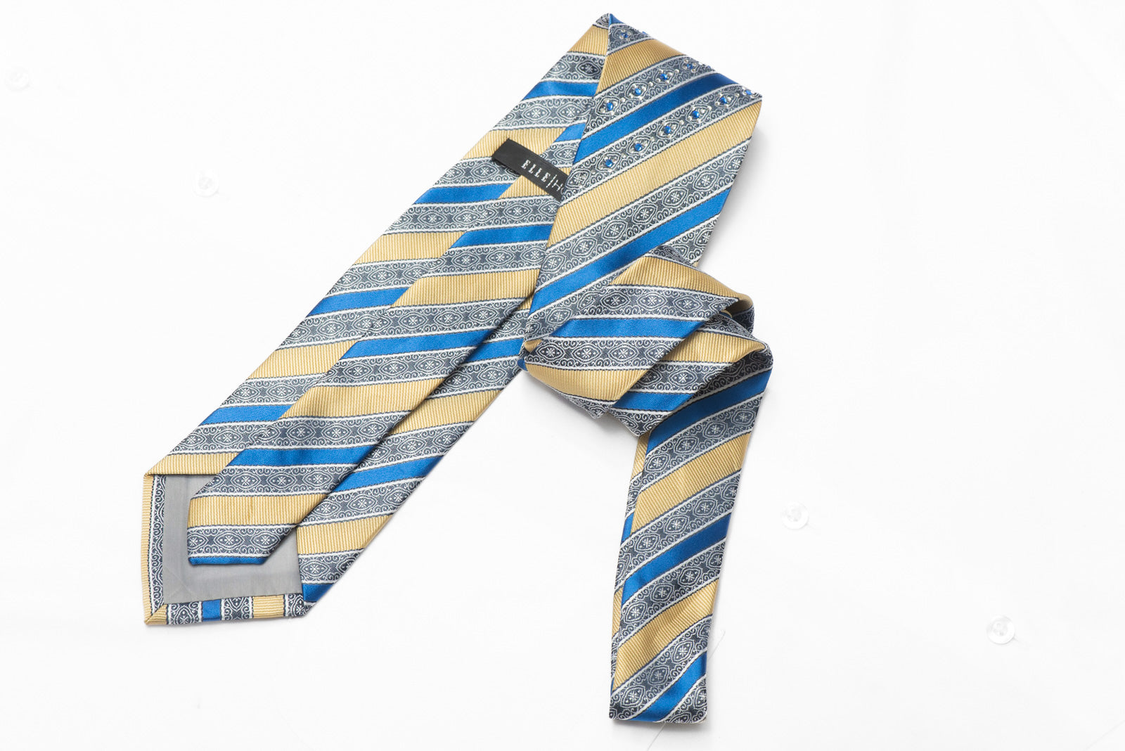 The Gold Blue Silver Cartouche Striped Rhinestone Silk Necktie is a stylish addition to any wardrobe. Perfect for both formal and casual occasions, this necktie is sure to make you stand out and feel confident.