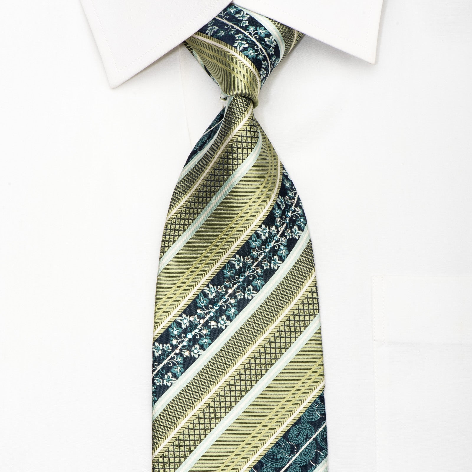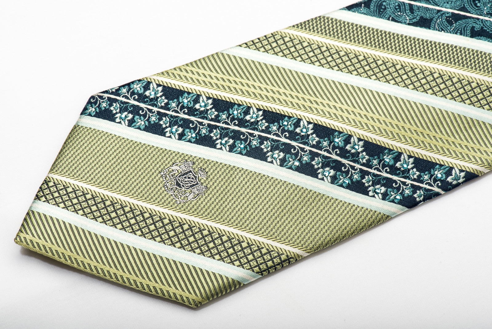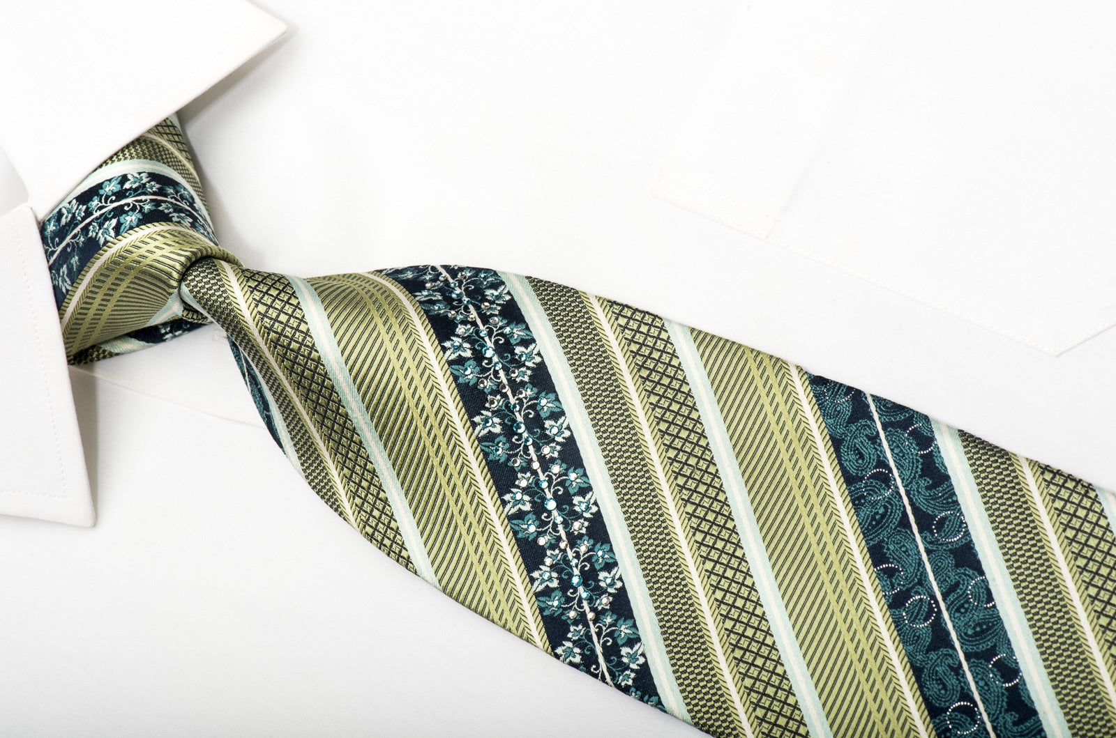 Louis Quatorze Men's Silk Necktie Bronze Striped On Blue Floral Sparkling With Swarovski Rhinestones