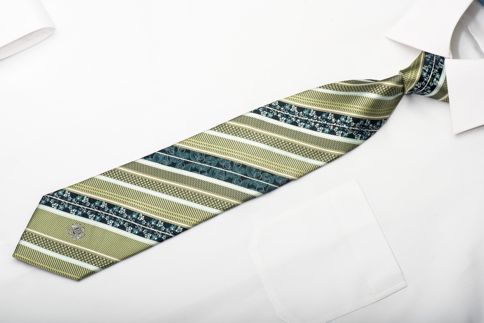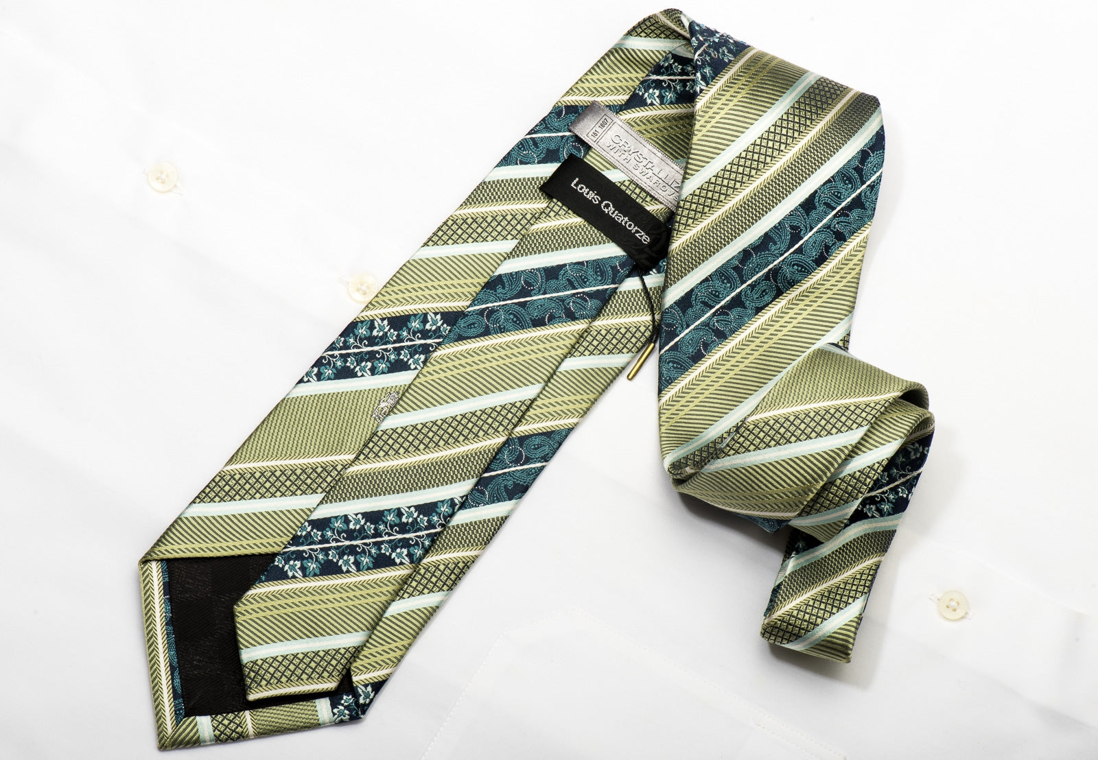 Stylish men's silk necktie perfect for every occasion handmade from the finest quality silk and designed by top brand name Louis Quatorze. Presenting an elegant bronze striped design on blue Floral silk, sparkling with clear white and blue Swarovski crystal Rhinestones with silver sparkles.