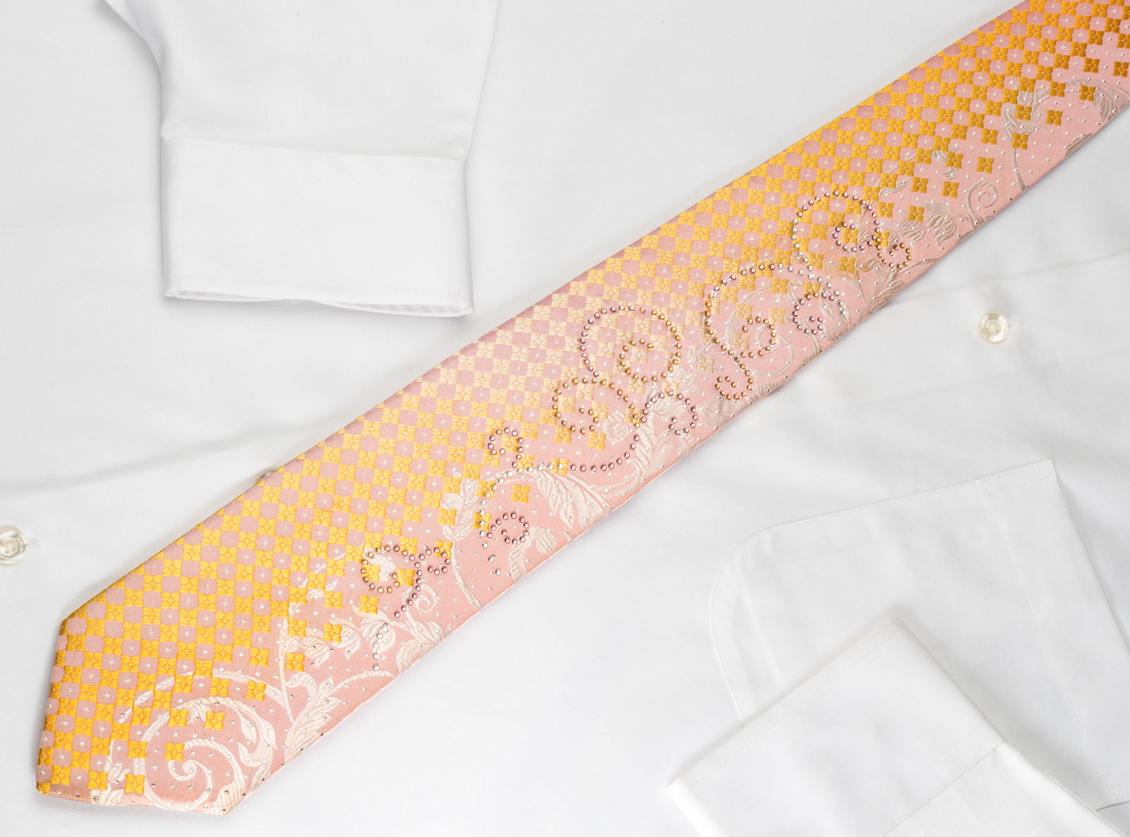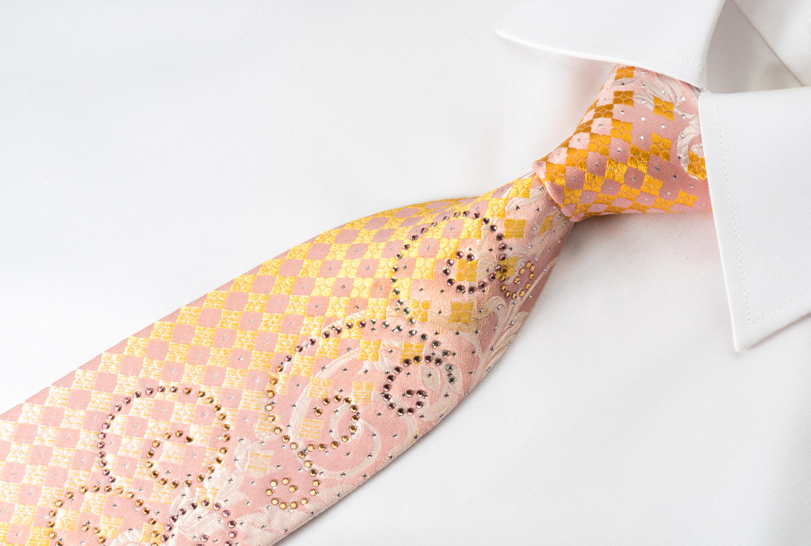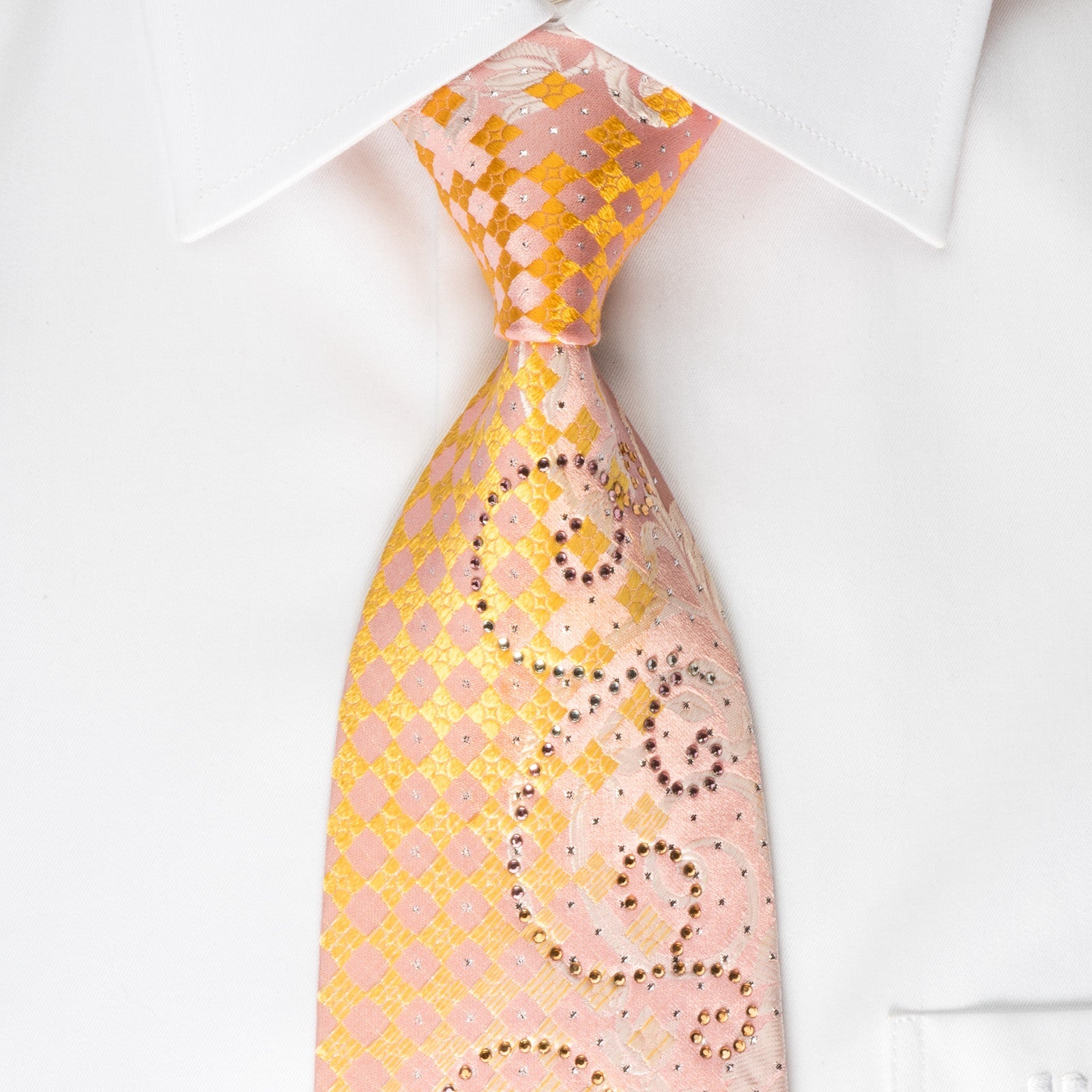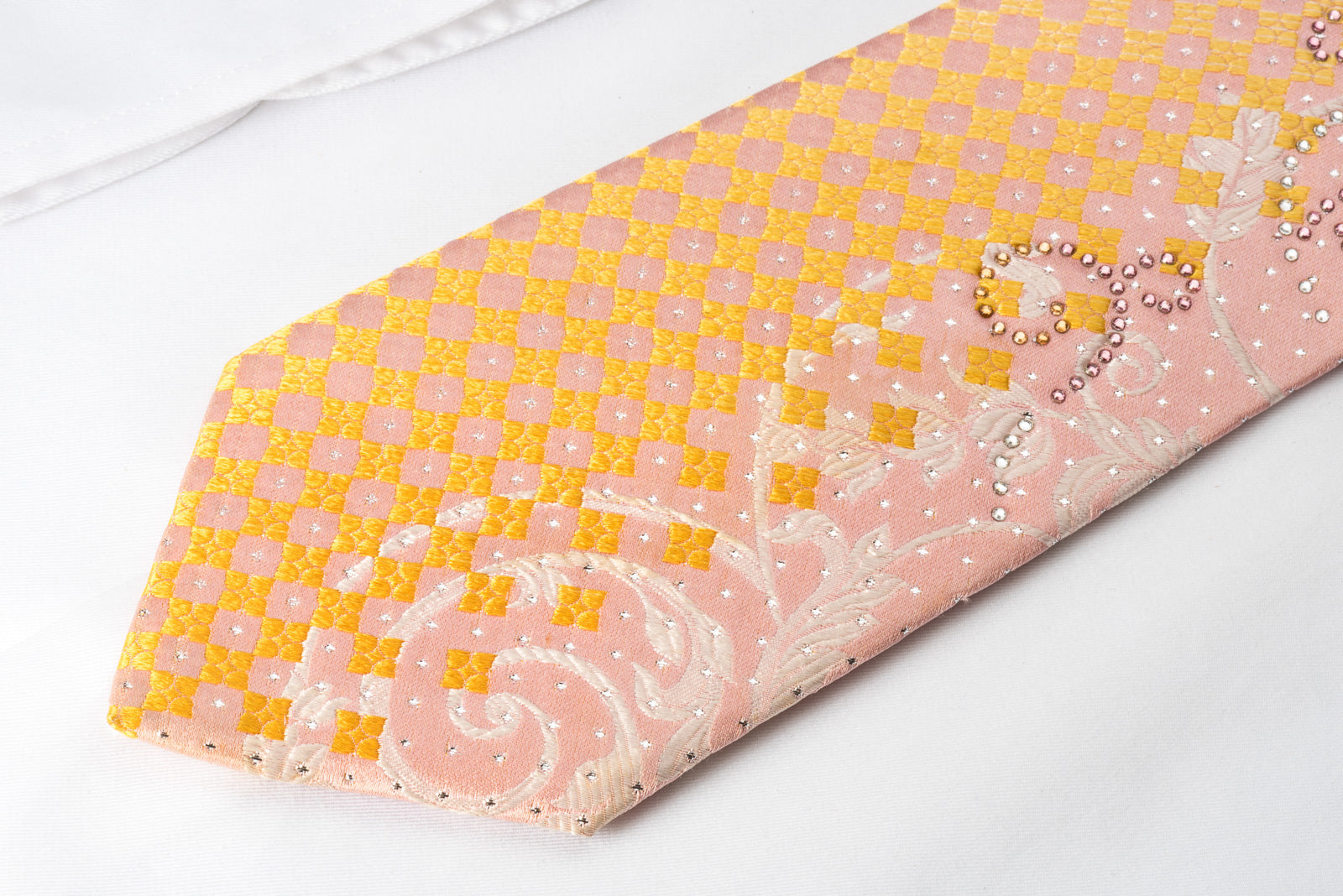 Beautiful handmade men's woven silk rhinestone tie handmade from the finest quality silk by top brand name Louis Quatorze. Presenting a gorgeous Floral with Scrolls design on yellow, pink Checkered silk sparkling with white, yellow, pink crystal Rhinestones and covered with silver sparkles.
