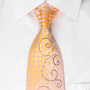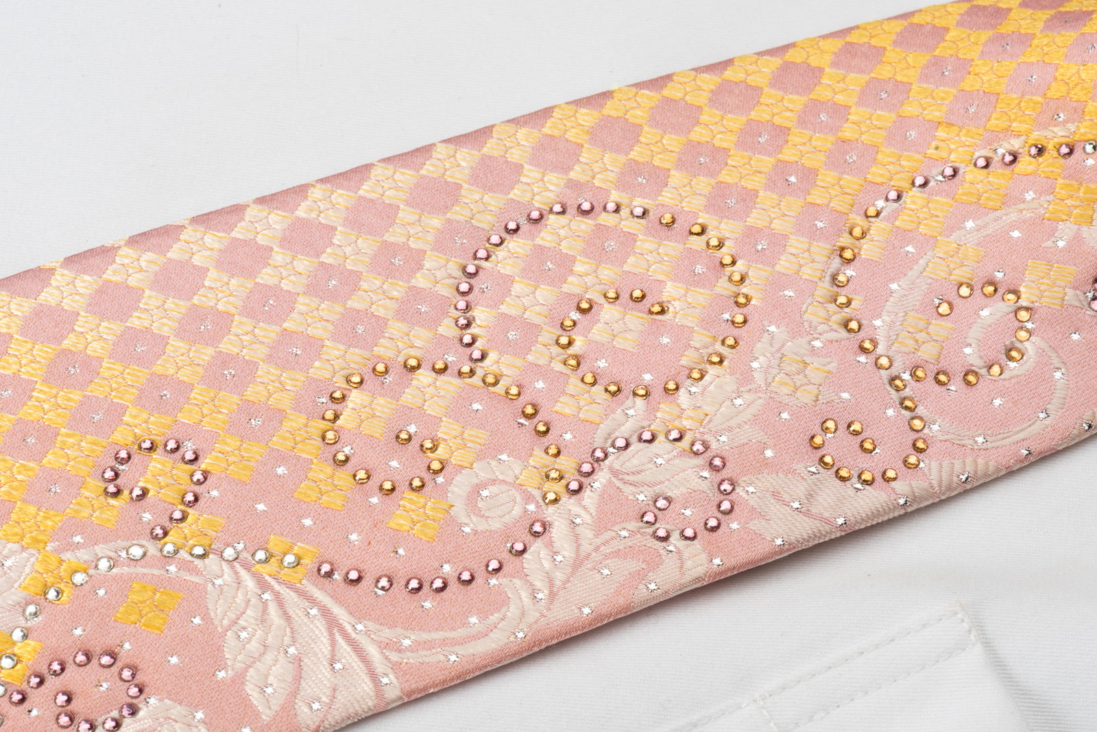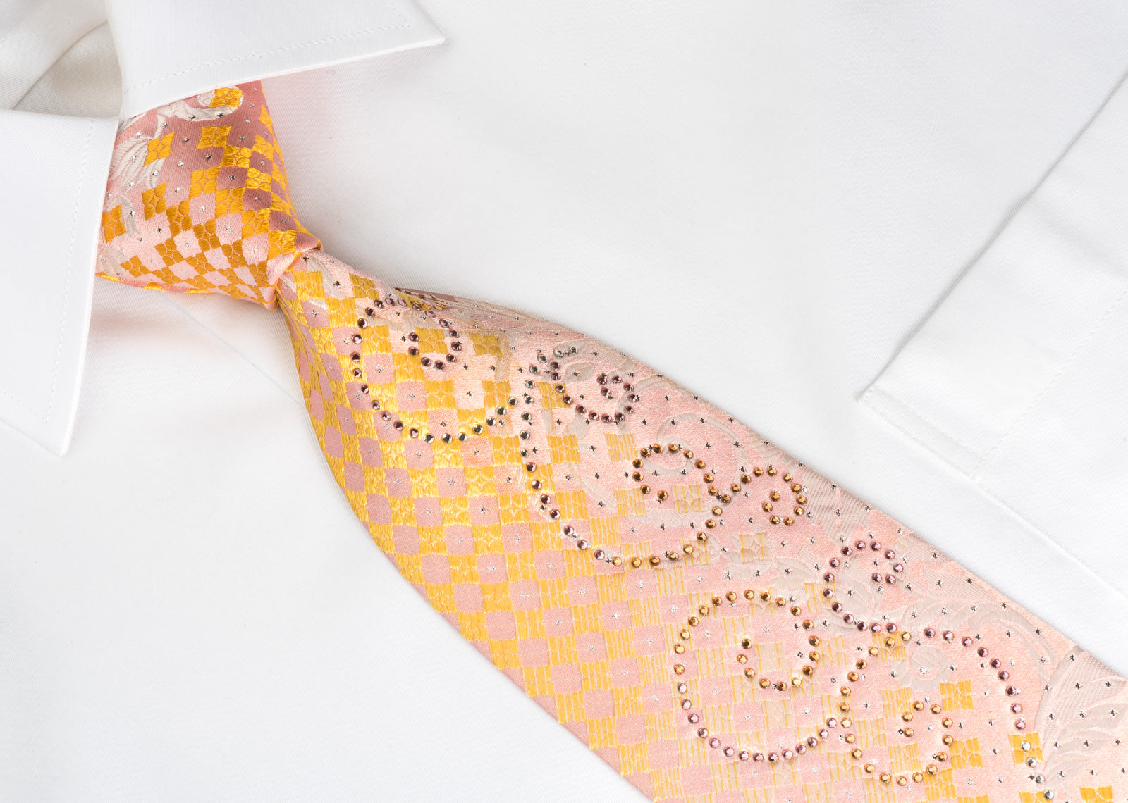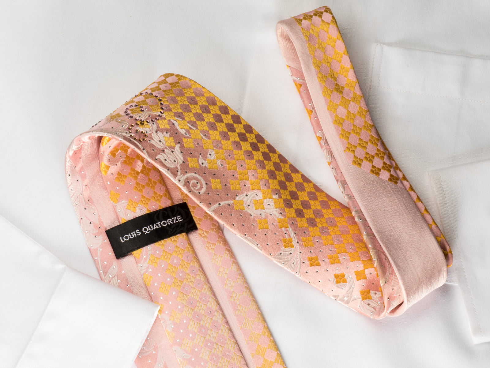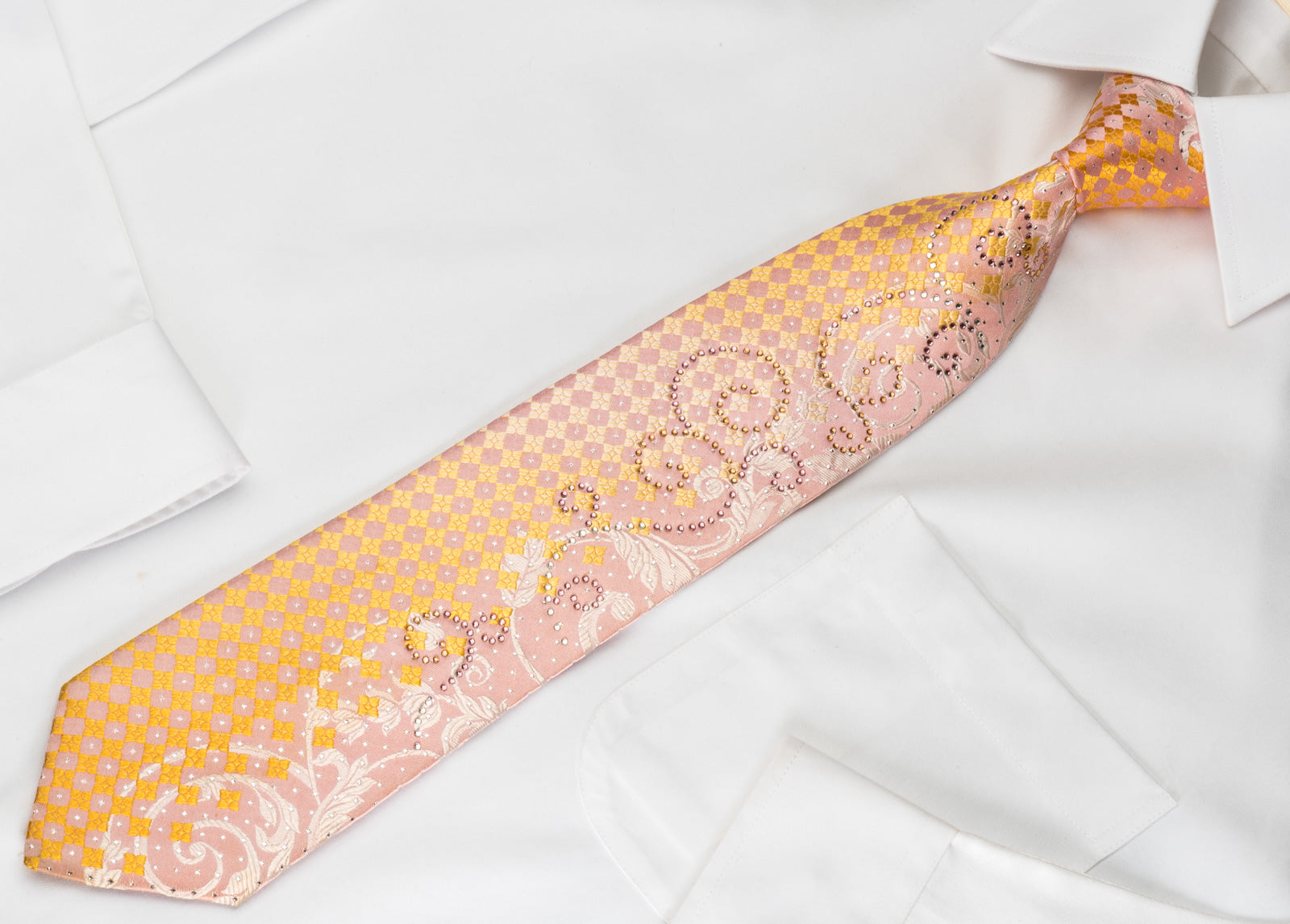 Beautiful handmade men's woven silk rhinestone tie handmade from the finest quality silk by top brand name Louis Quatorze. Presenting a gorgeous Floral with Scrolls design on yellow, pink Checkered silk sparkling with white, yellow, pink crystal Rhinestones and covered with silver sparkles.