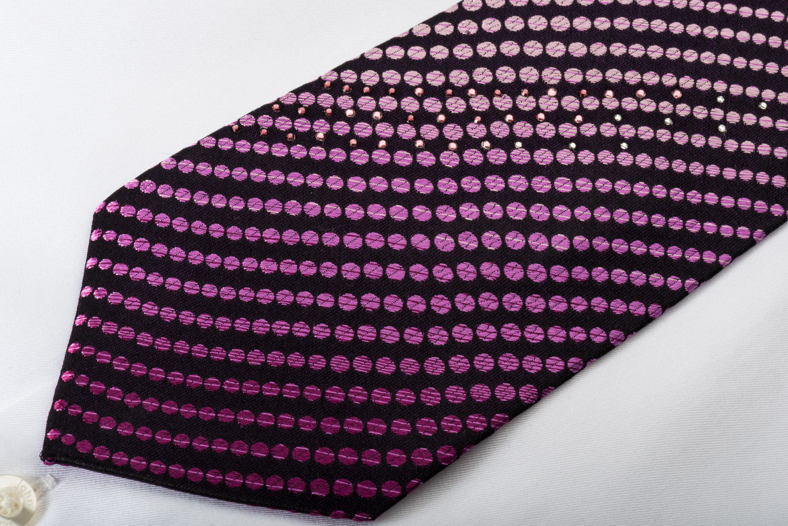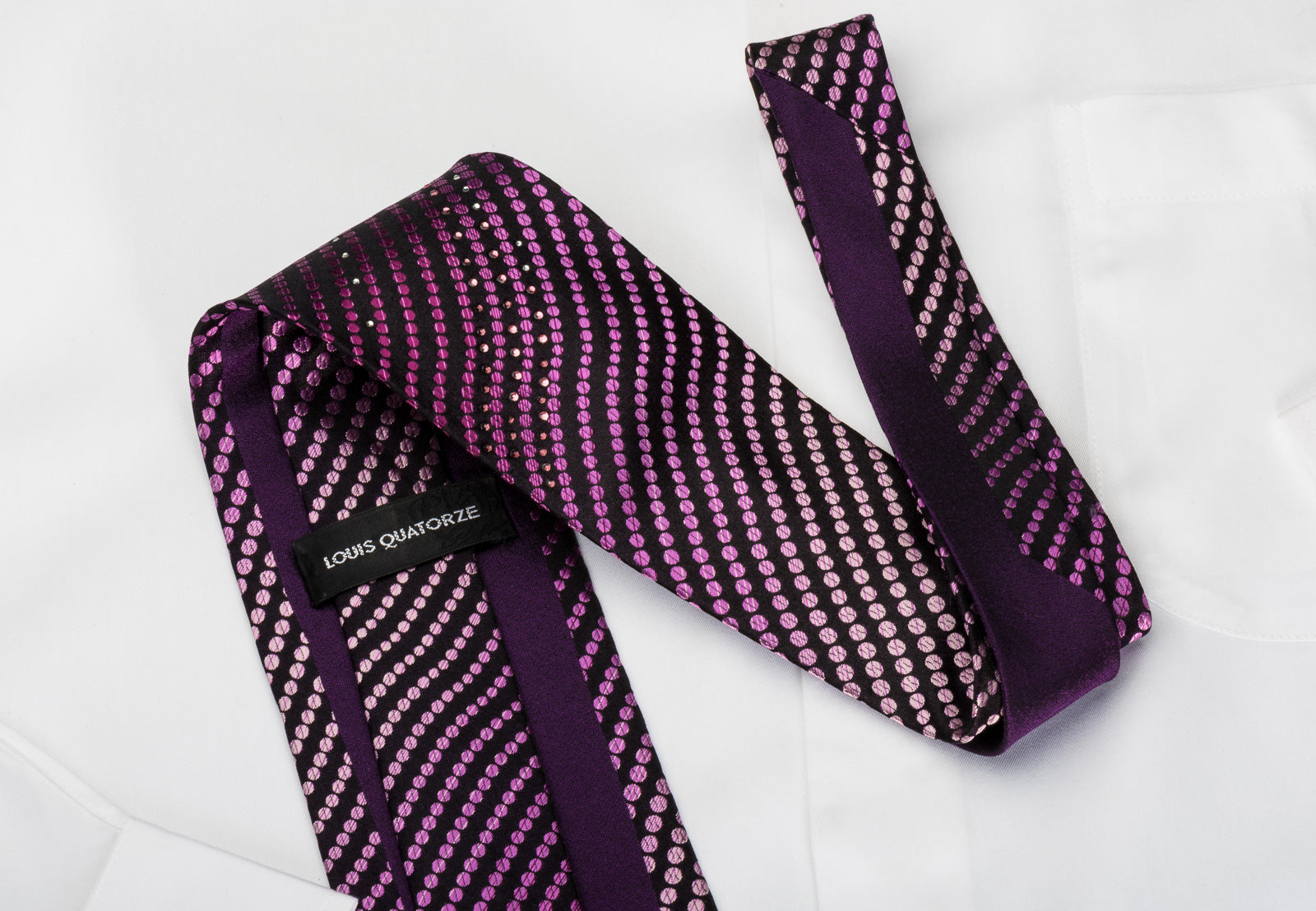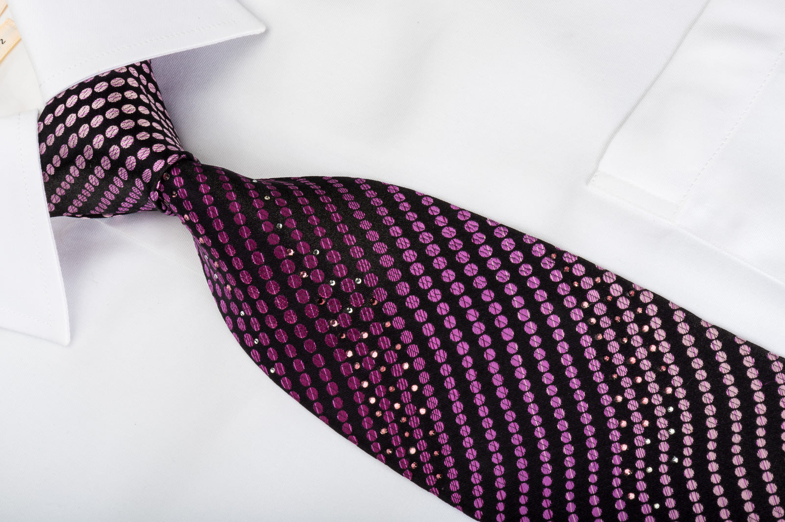 Gorgeous men's woven silk Rhinestone necktie handmade from the finest quality silk and designed by top brand name Louis Quatorze. Presenting a stylish design with Polka Dots on purple silk and sparkling with clear white and purple crystal Rhinestones.