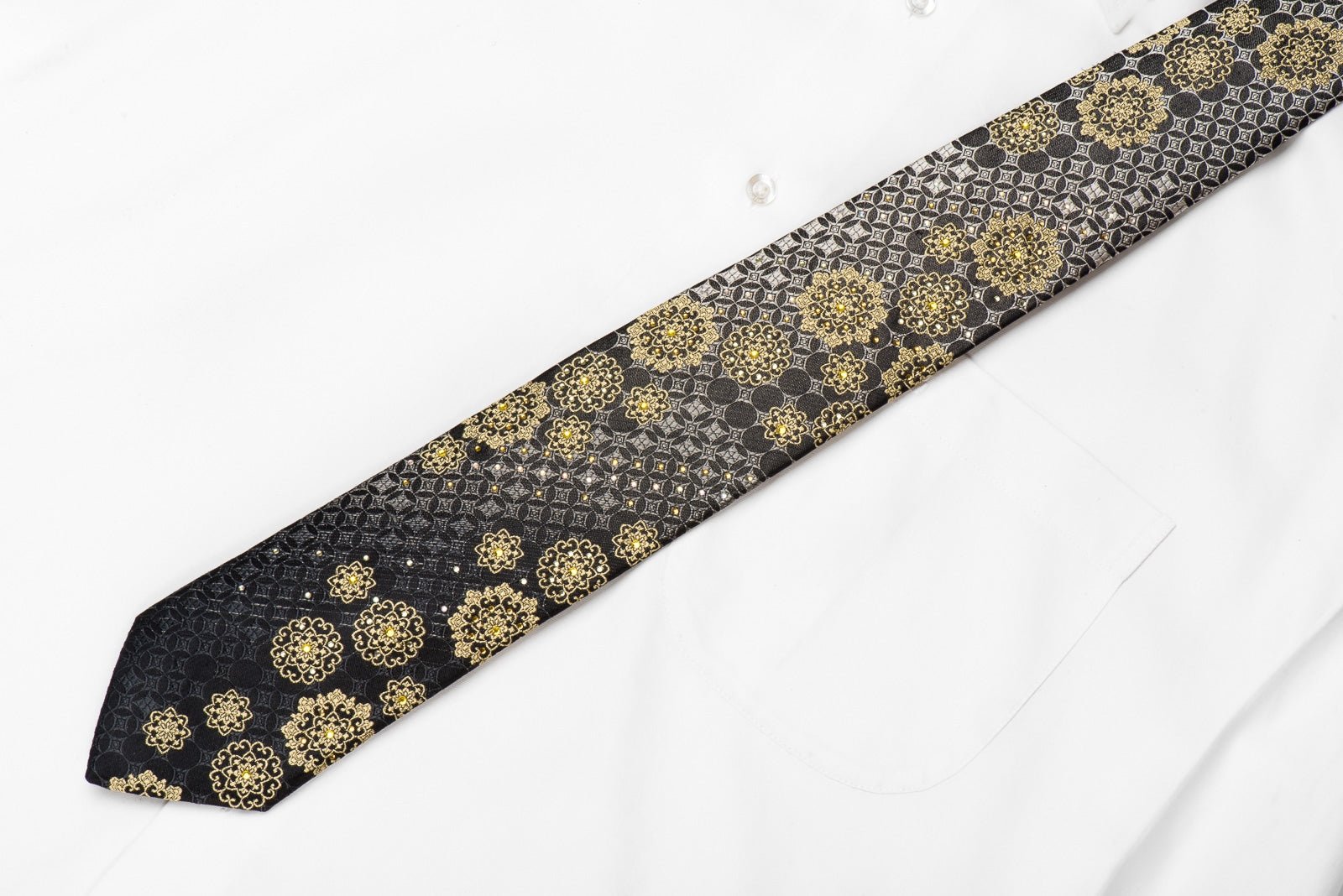 Stylish men's crystal silk tie perfect for every occasion handmade from the finest quality silk and designed by top brand name Avalon. Presenting an elegant woven Gold Medallion and silver Geometric design on black, sparkling with clear yellow and crystal Rhinestones with metallic gold sparkles.