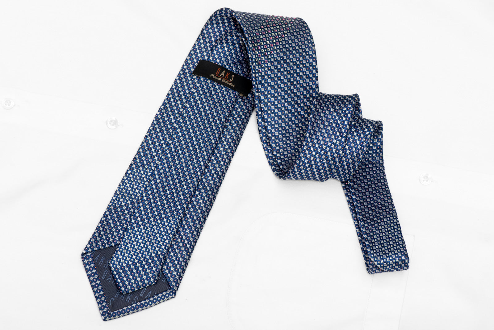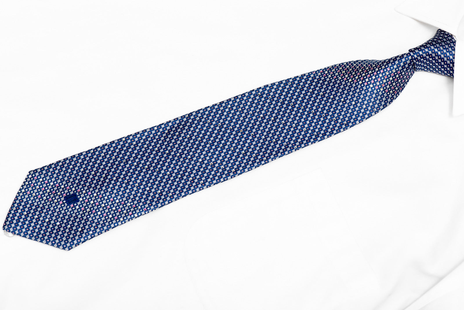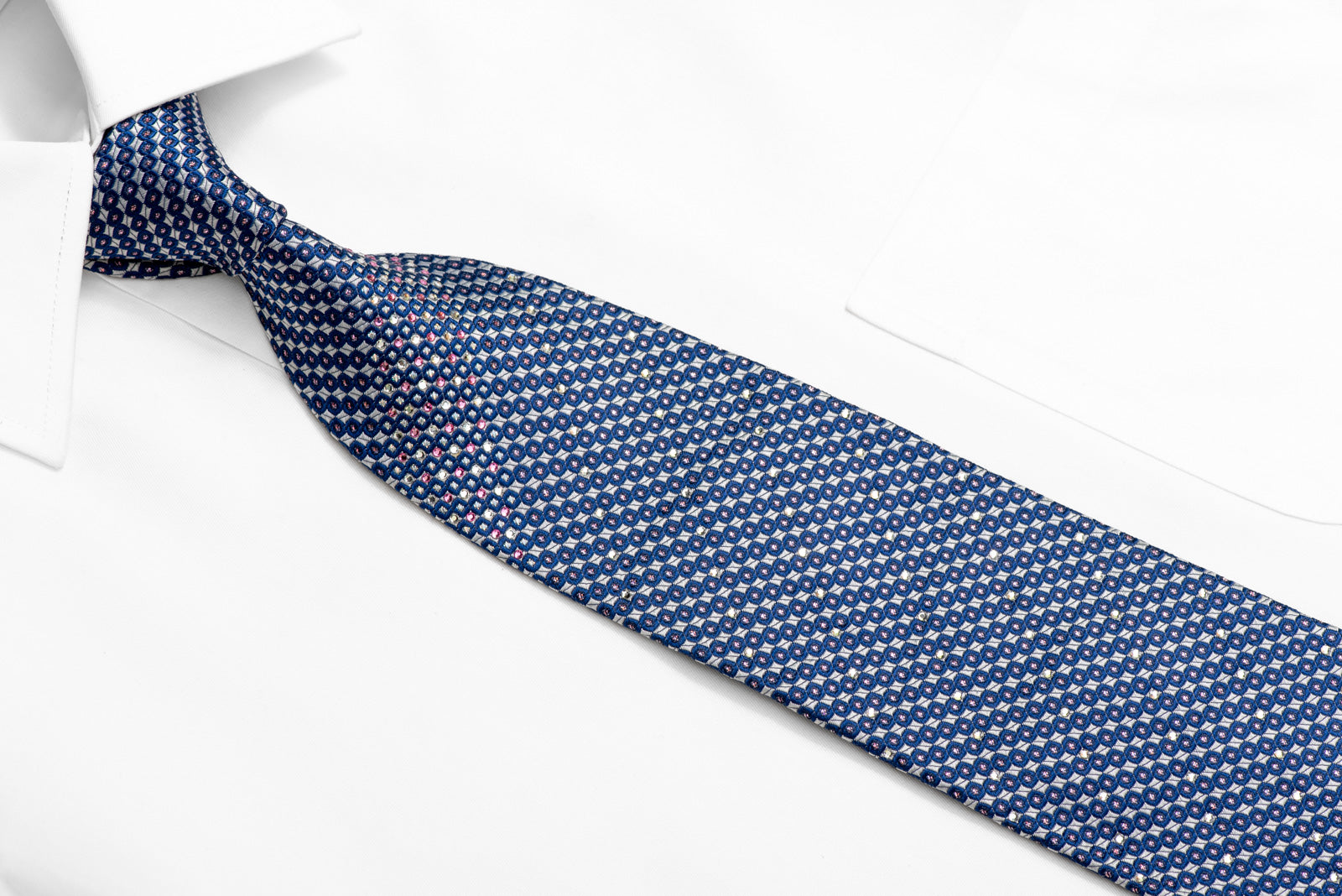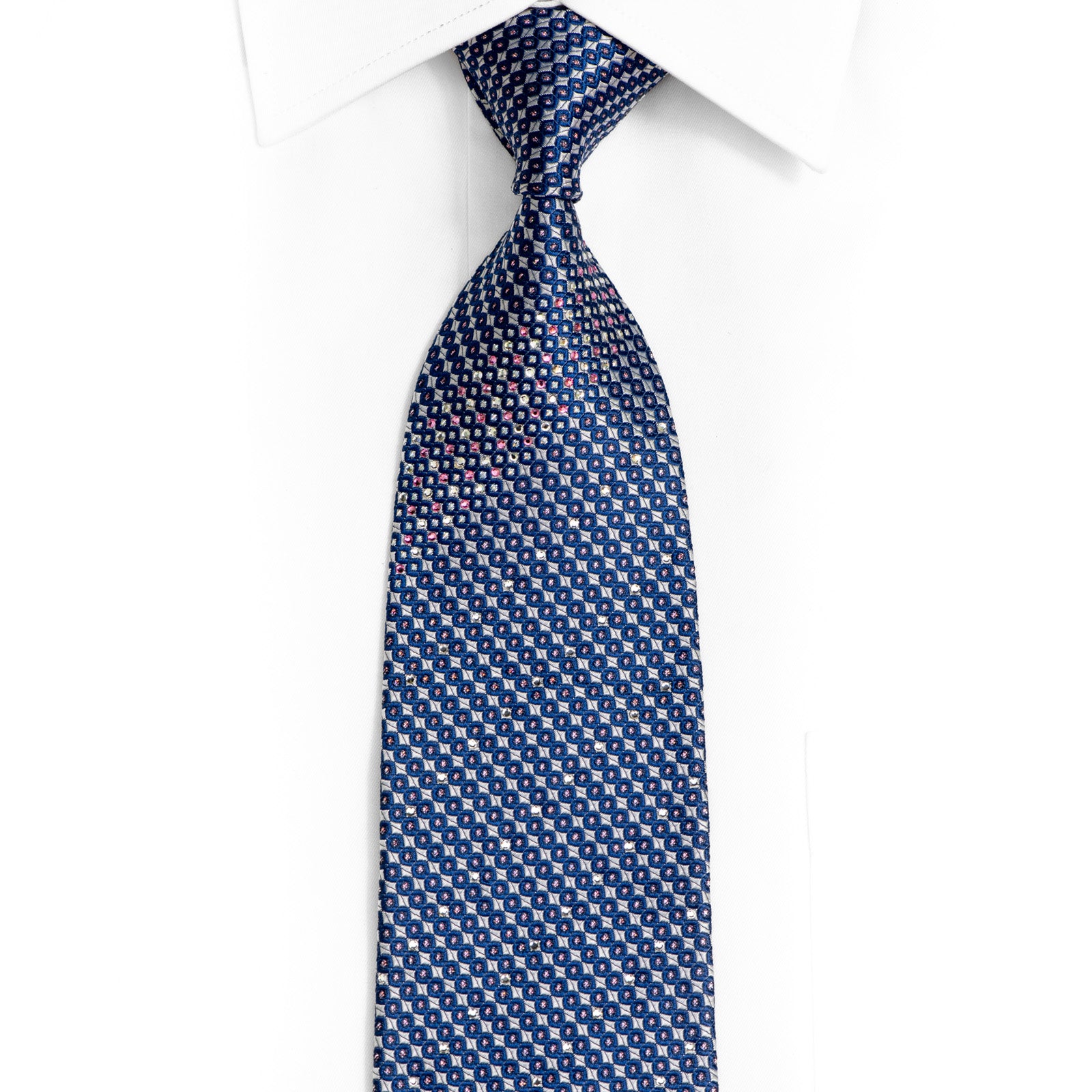 Material - SilkDesign - GeometricColor - Blue. SilverLength - Classic (57 in.-60 in.)(145 cm-153 cm)Width - Classic (3 1/4 in.-3 3/4 in.)(8 cm-9.5 cm)Special Features - Rhinestones, Silver Sparkles