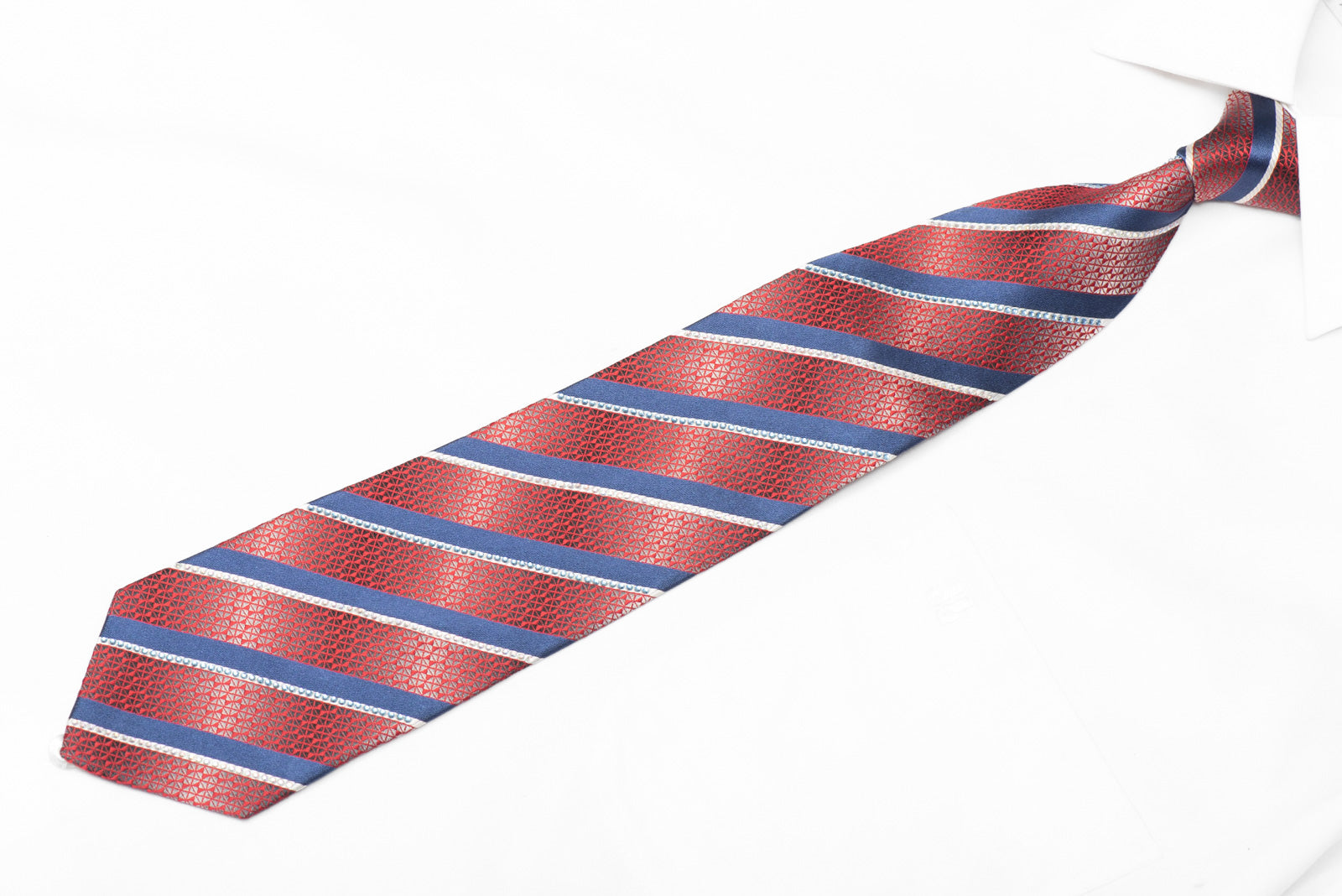 Material - SilkDesign - StripedColor - Blue, Silver, RedLength - Classic (48 in.-60 in.)(145cm-153 cm)Width - Classic (3 1/4 in)( 8.5cm )Special Features - Rhinestones