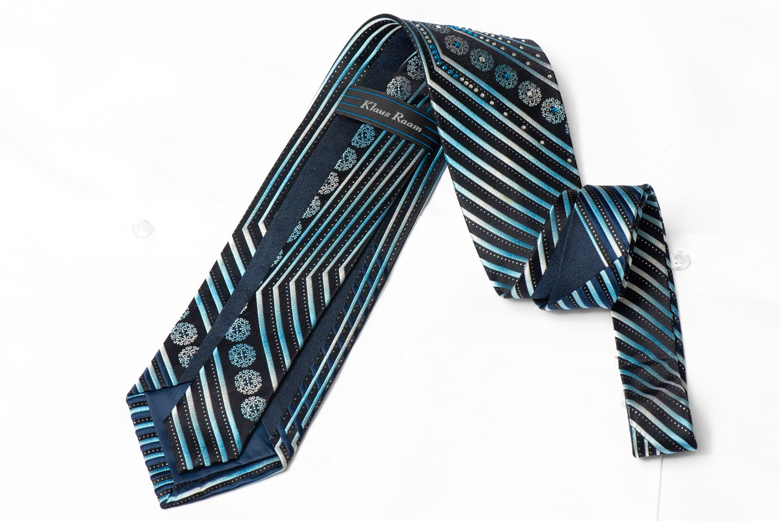 Navy tie featuring elegant blue stripes adorned with dazzling rhinestones and silver sparkles. This sophisticated accessory adds a touch of glamour to any formal outfit while maintaining classic style.