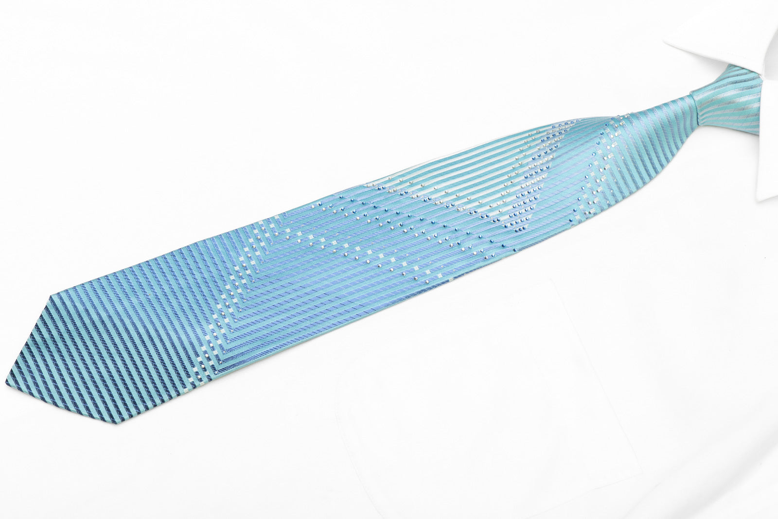 Stylish men's handmade Rhinestone silk necktie. Presenting a woven chevron striped design on blue silk. Sparkling with clear blue and white Rhinestones with metallic silver sparkles.