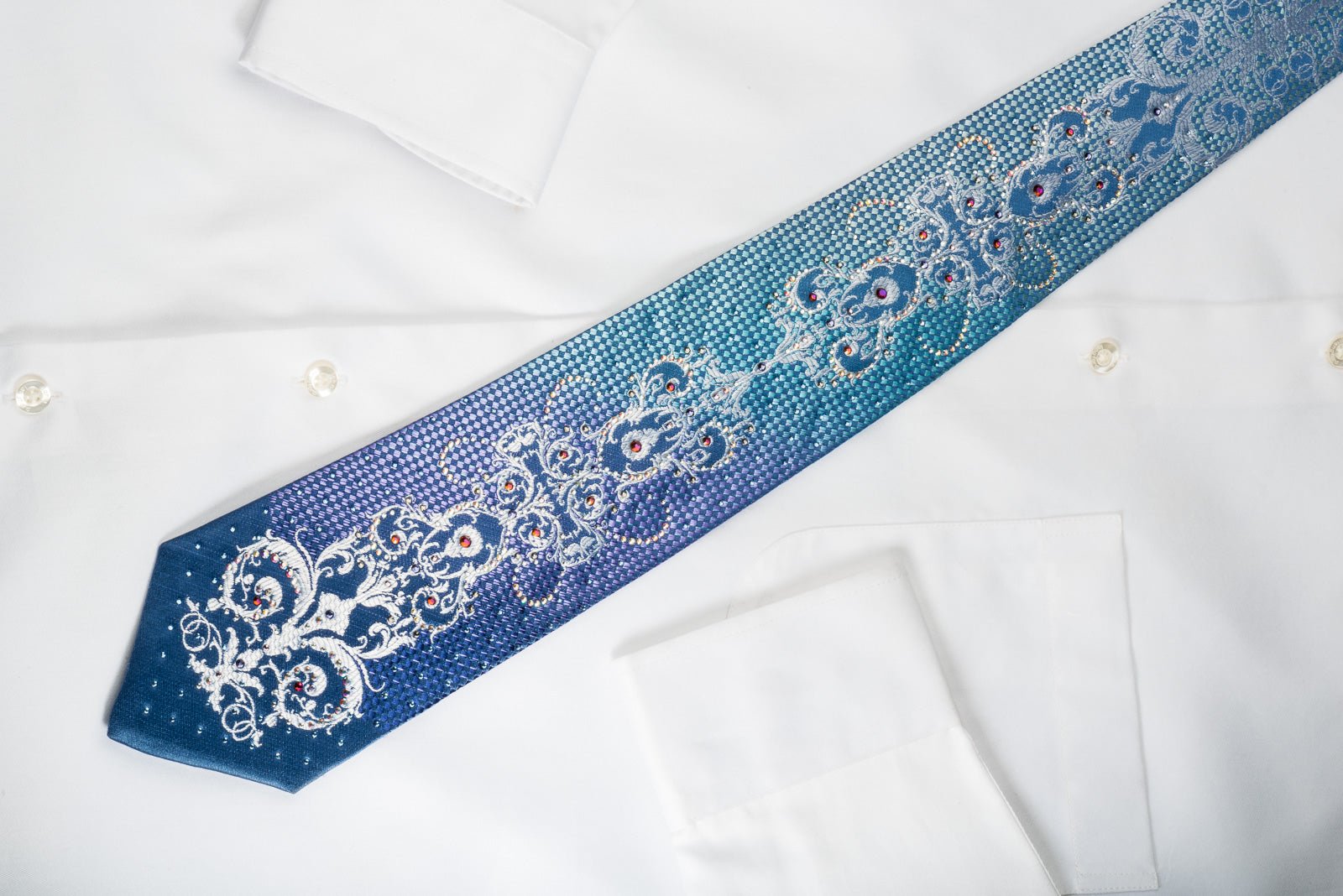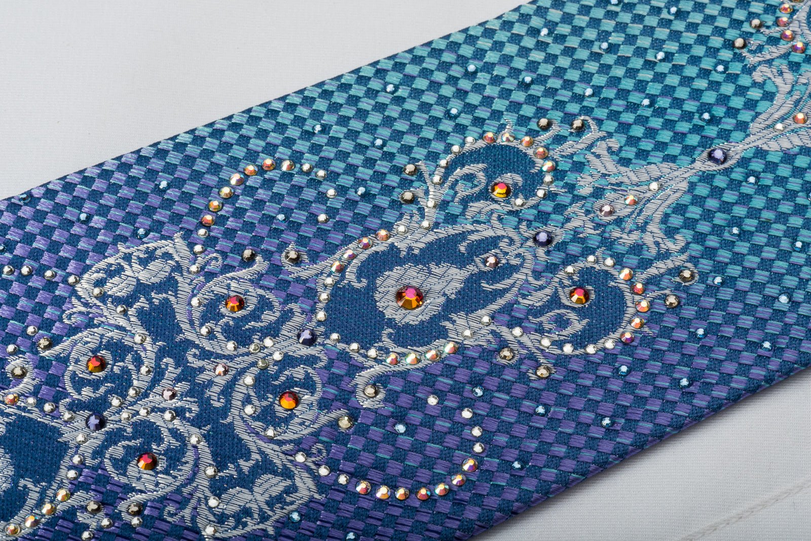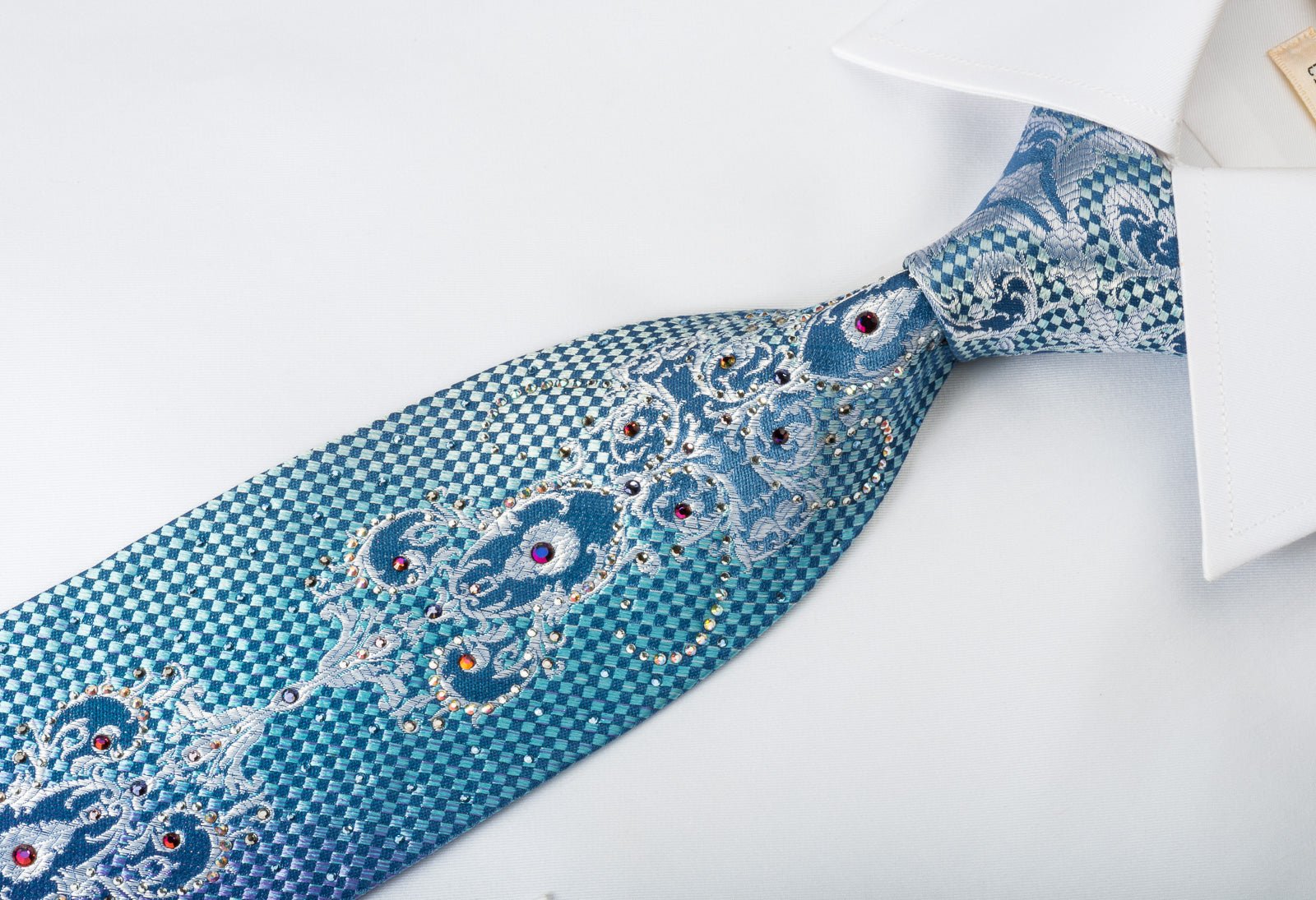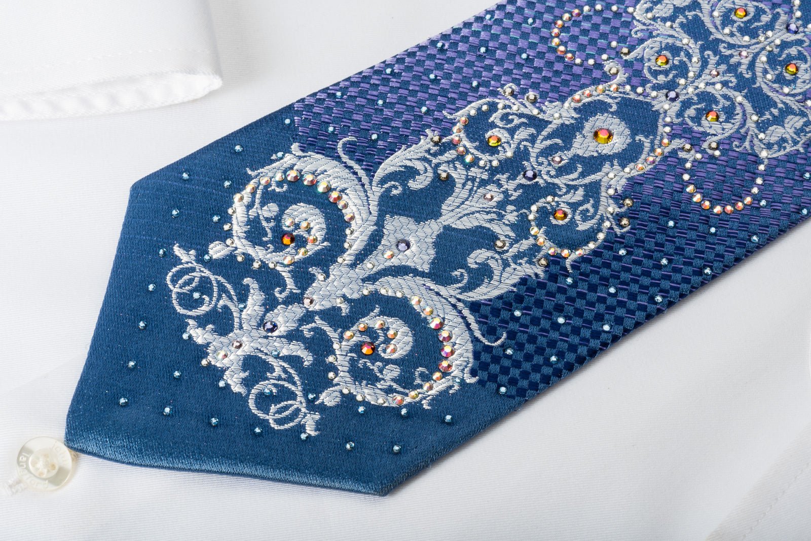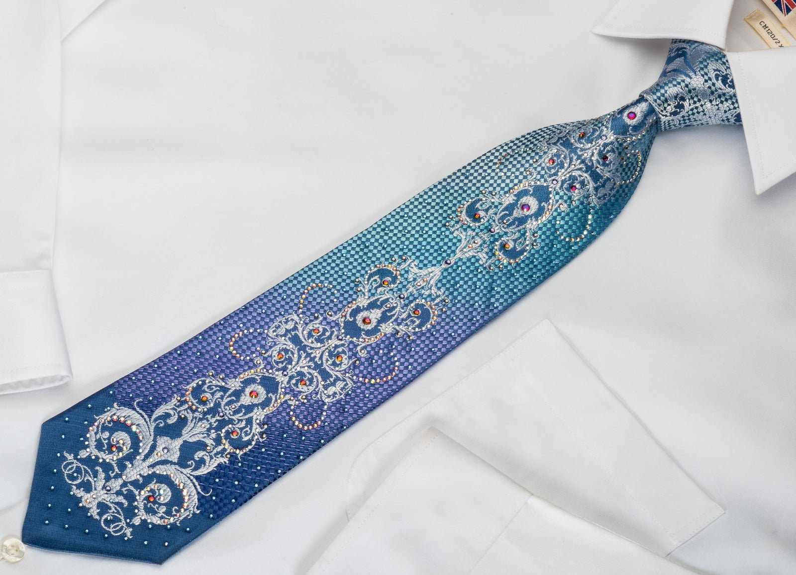 Material - SilkDesign - DamaskColor - Silver, Turquoise, VioletLength - Classic (57 in.-60 in.)(145 cm-153 cm)Width - Classic (3 1/4 in.-3 3/4 in.)(8 cm-9.5 cm)Special Features - Orange Rhinestones, Red Rhinestones, White Rhinestones