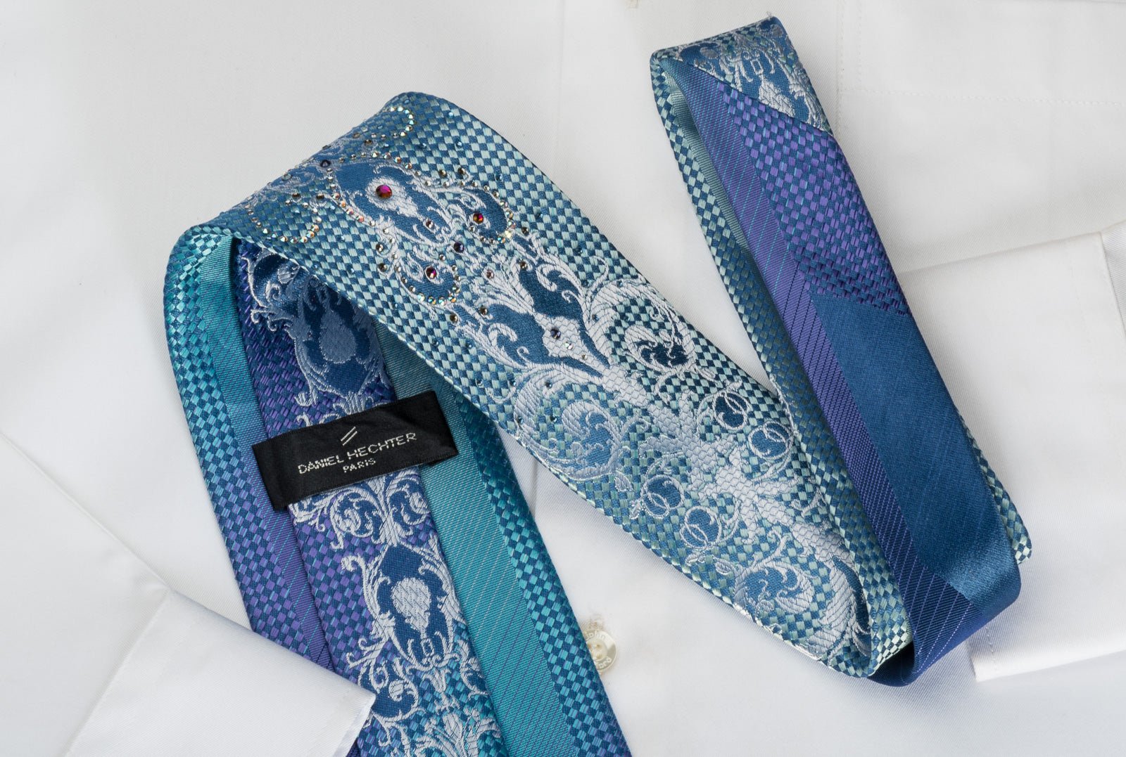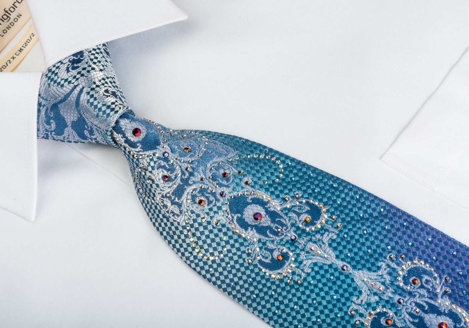 Stand out in a crowd wearing this gorgeous silk tie, hand made from the finest quality woven silk and designed by top brand name Daniel Hechter. Presenting an amazing silver Damask design on turquoise, violet silk and covered with sparkling clear, red, orange crystal Rhinestones.