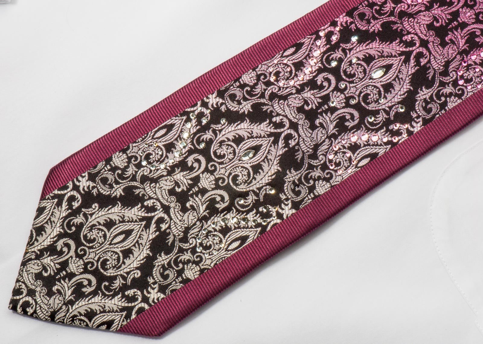 Material - SilkDesign - DamaskColor - Black, Purple, SilverLength - Classic (57 in.-60 in.)(145 cm-153 cm)Width - Classic (3 1/4 in.-3 3/4 in.)(8 cm-9.5 cm)Special Features - Pink Rhinestones, White Rhinestones