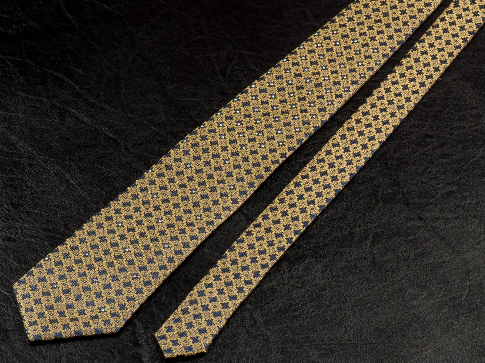 Beautiful hand made silk neck tie by brand name Daniel Heckter with gorgeous yellow trellis design on dark blue with silver micro sparkles and perfectly complemented with clear white Rhinestones.
