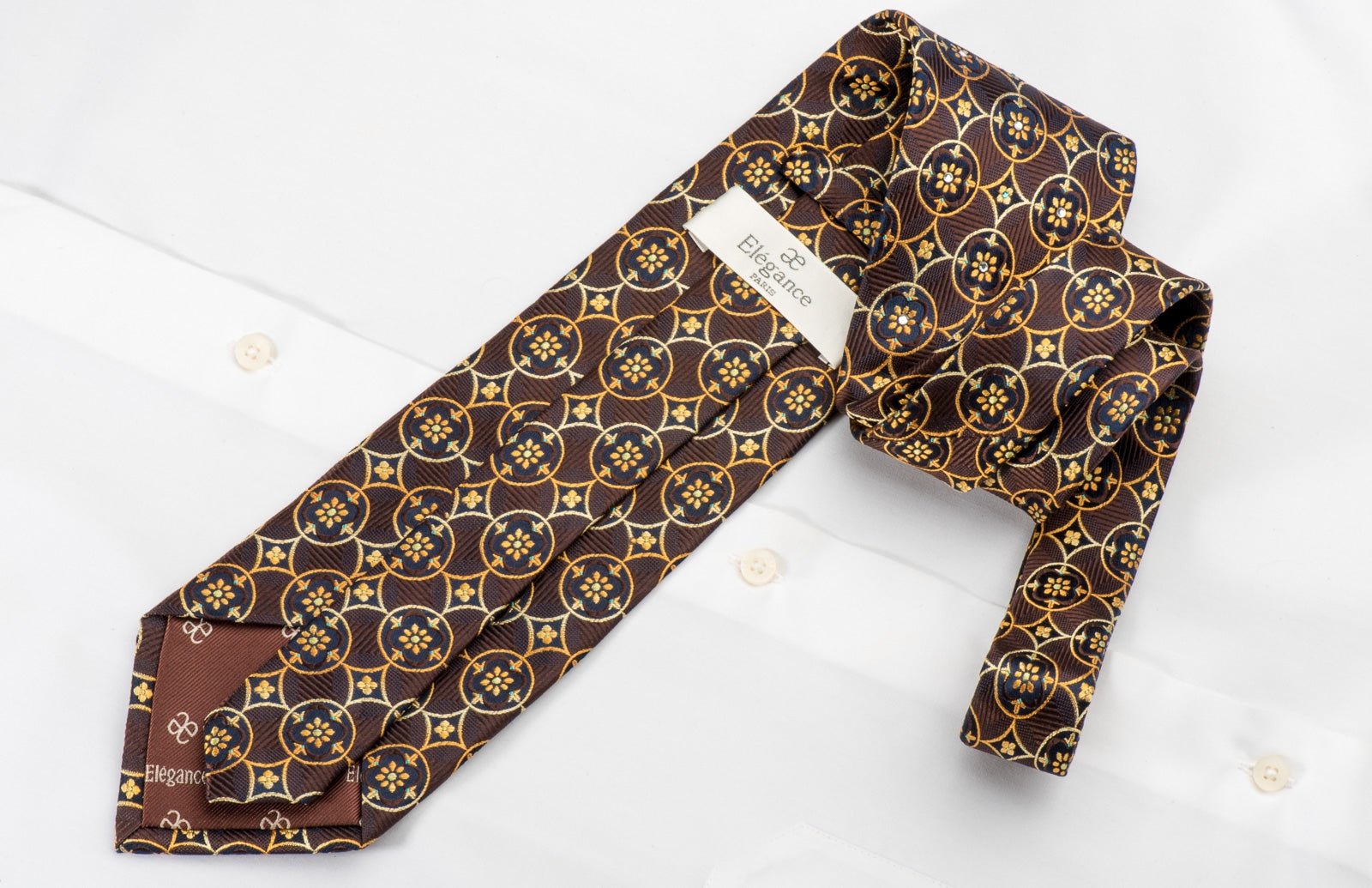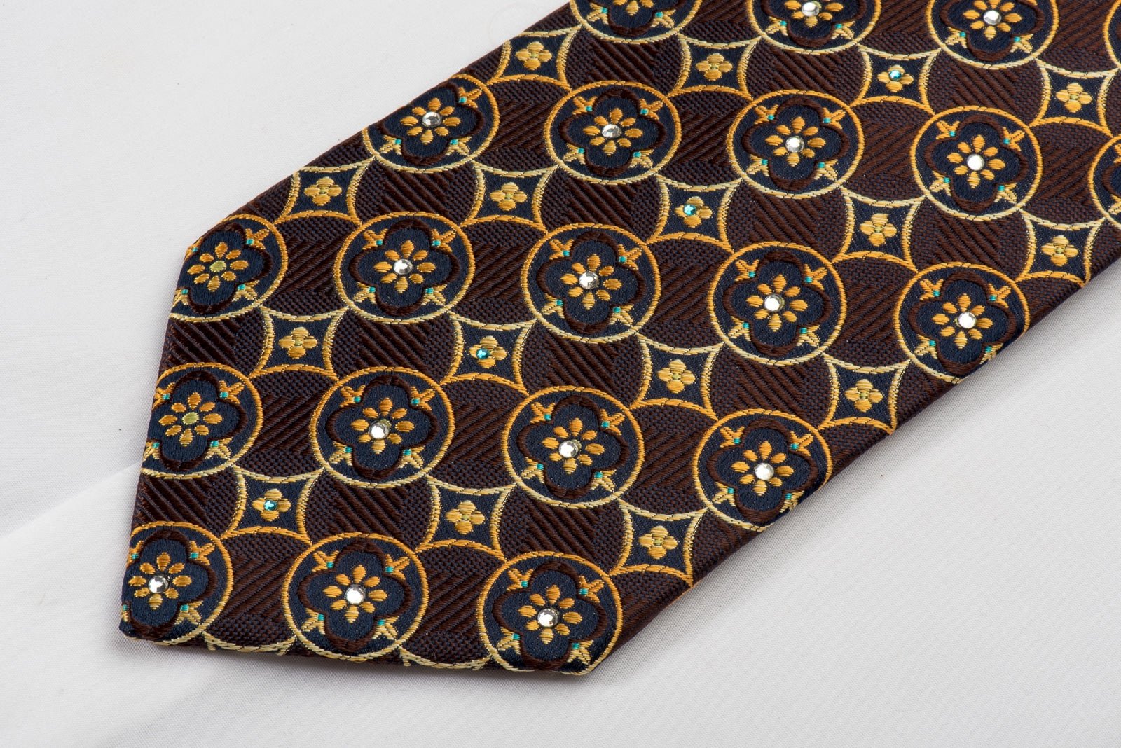 Stylish mens rhinestone tie perfect on every occasion handmade and designed by top brand name Elegance. Presenting an elegant design with orange geometric Interlocking Circles on woven brown silk, sparkling with crystal Rhinestones.