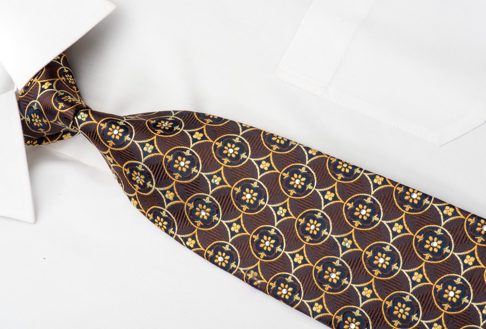 Elegance Mens Rhinestone Tie Orange Interlocking Circles On Brown Silk