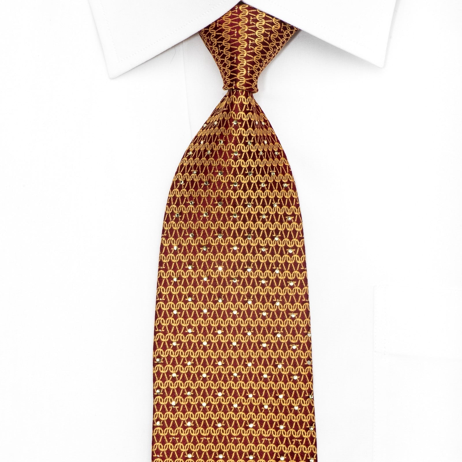 Men's Sparkle Necktie Golden Chain Mail On Burgundy Silk With Rhinestones