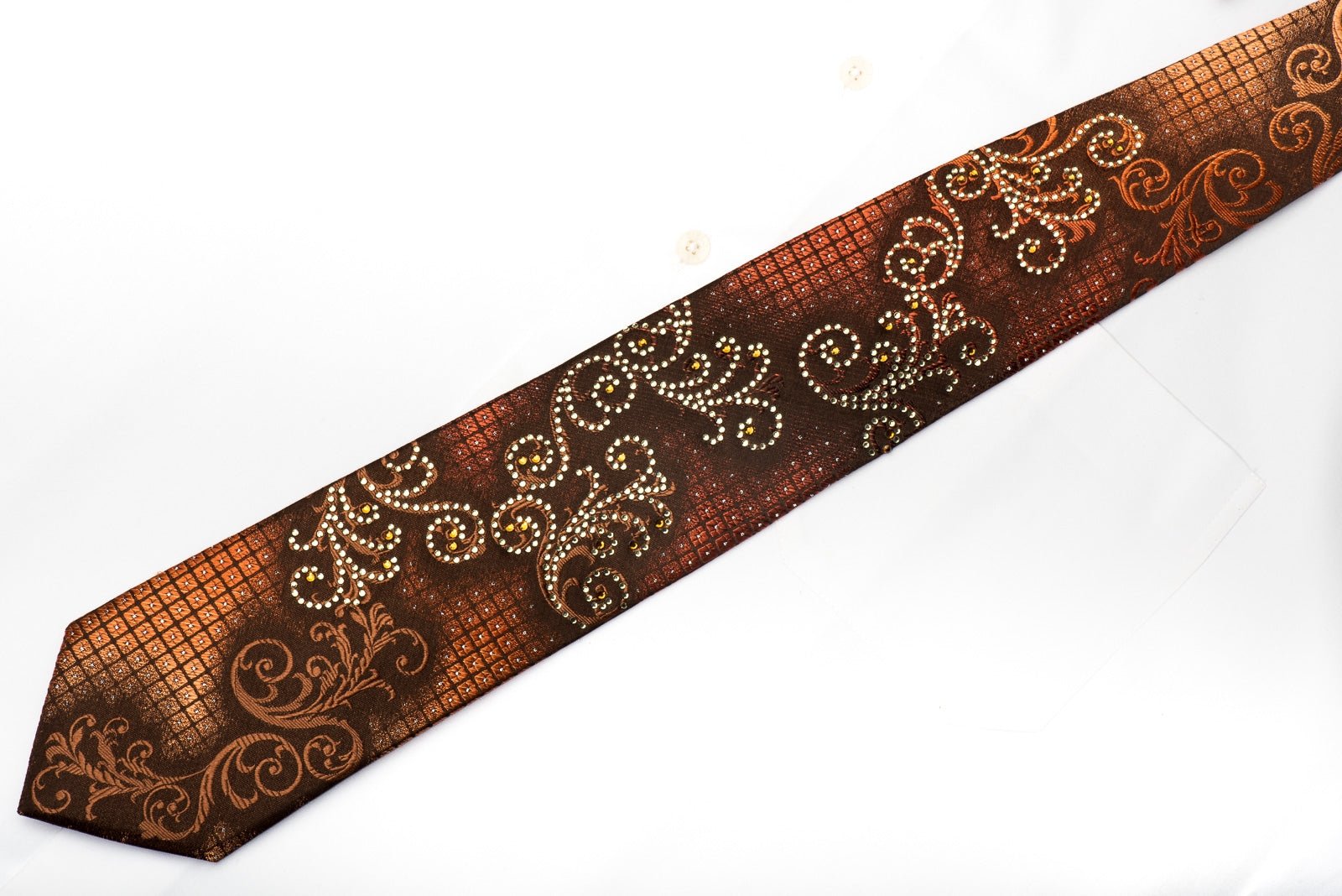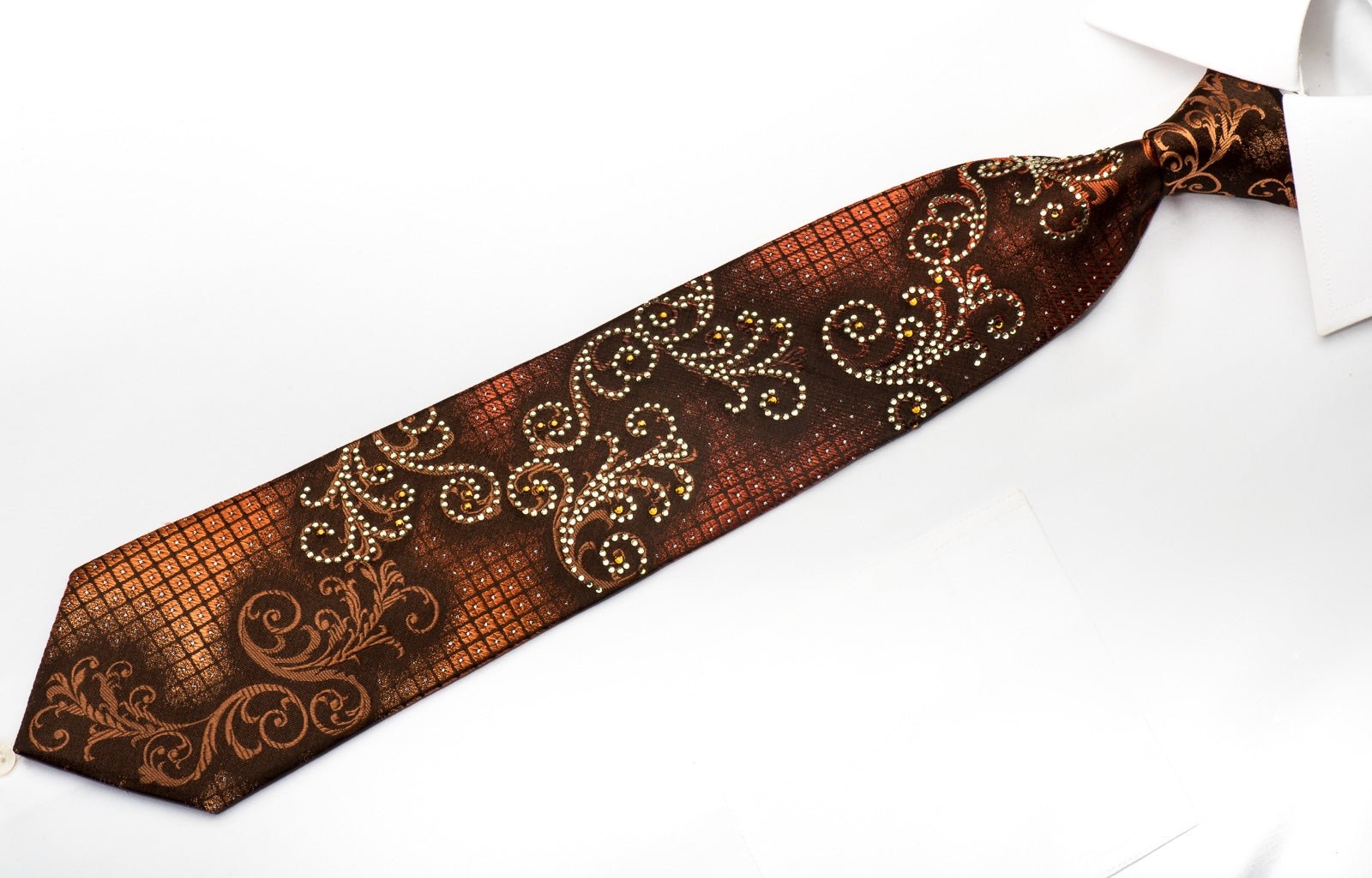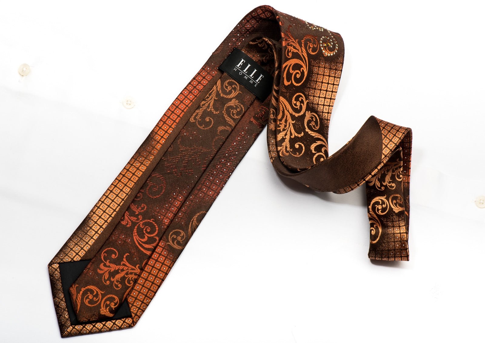 Elle Homme Men's Rhinestone Silk Tie Orange Scrolls On Brown With Silver Sparkles - San-Dee