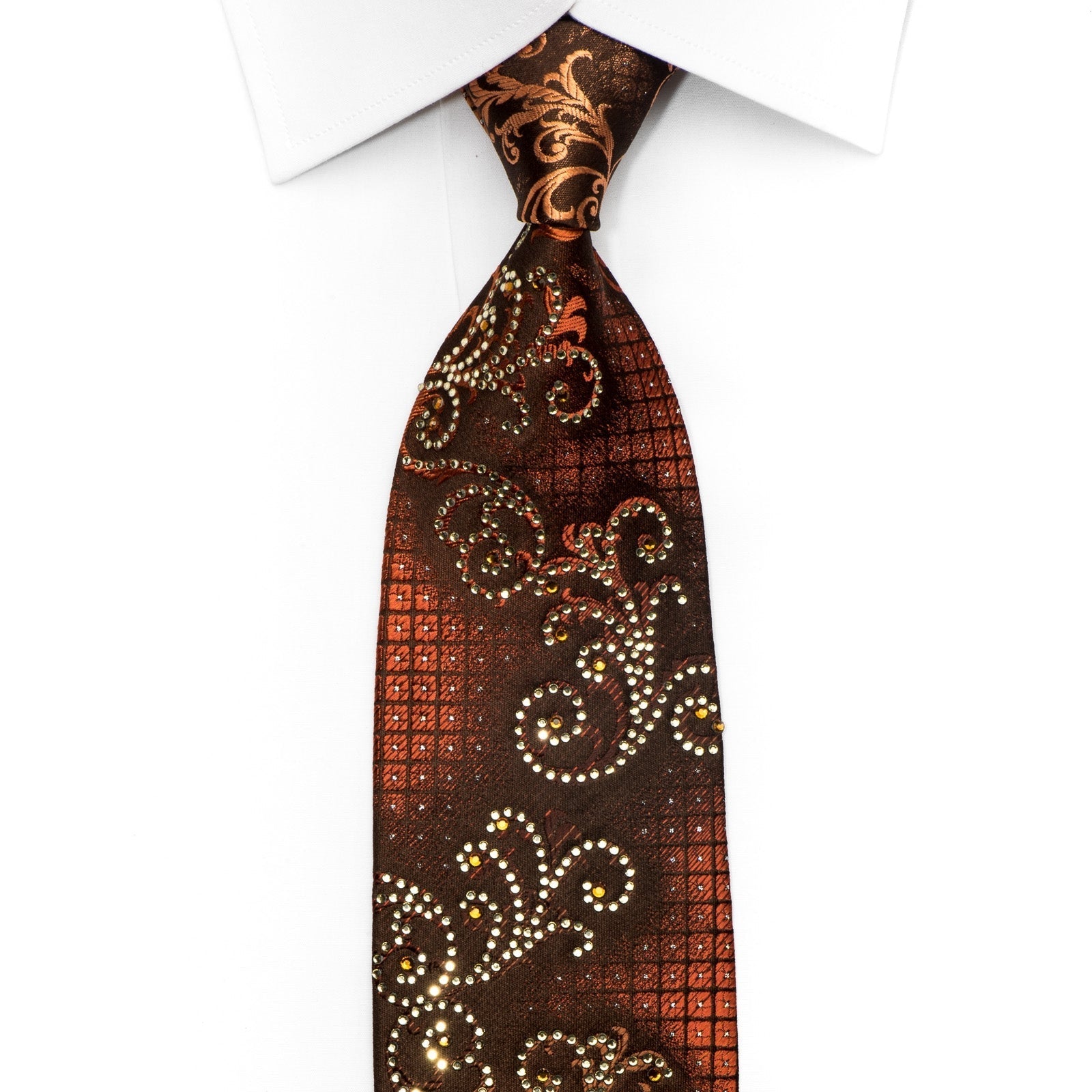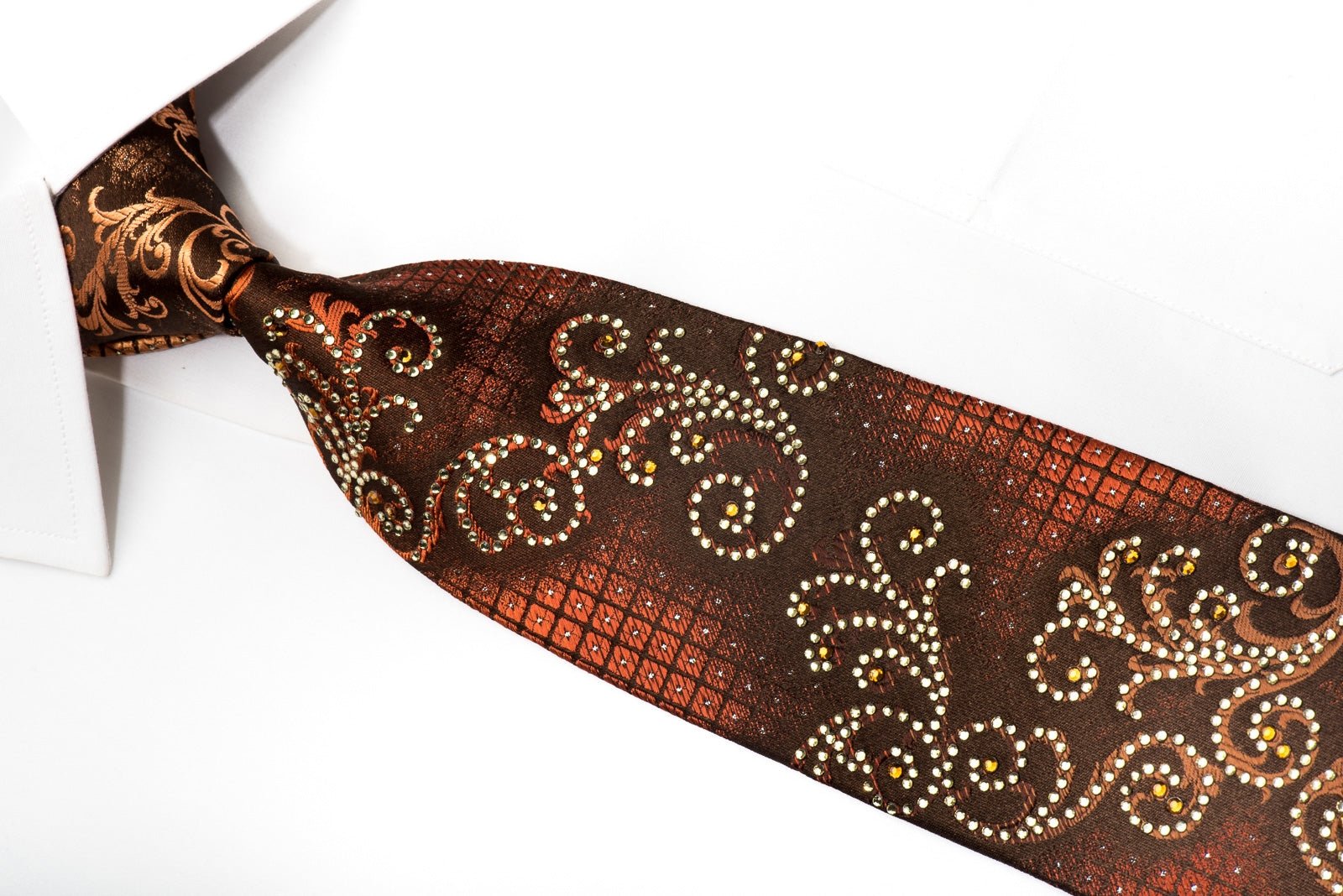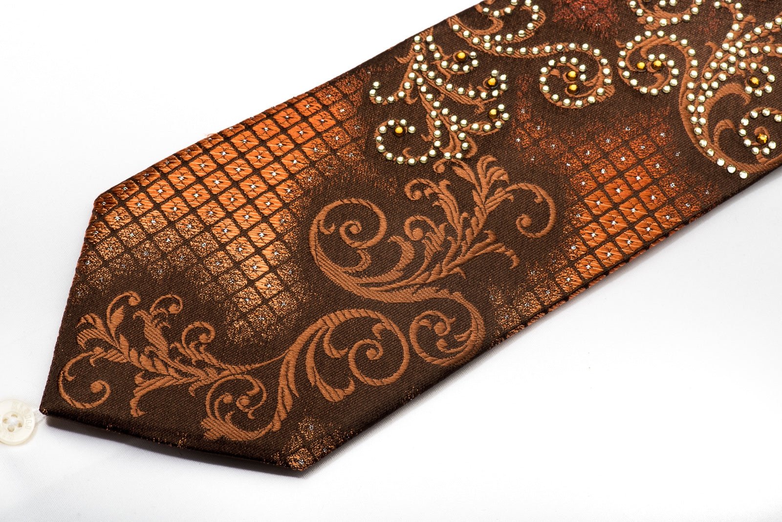 This is a beautiful men's Rhinestone necktie handmade from the finest quality silk and designed by top brand name Elle Homme. Presenting a wonderful orange Scrolls and Checkered design on dark brown, sparkling with clear white and orange crystal Rhinestones with silver sparkles.