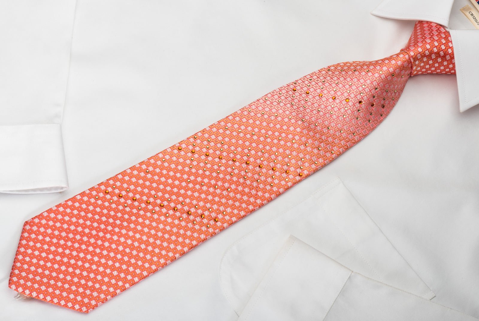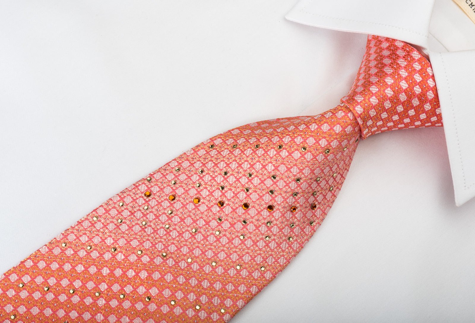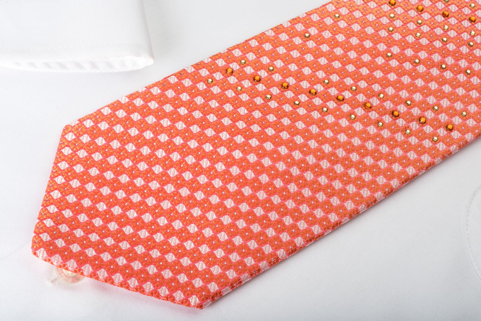 This is a stylish Rhinestone tie perfect for every occasion, handmade and designed by top brand name Elle Homme. Presenting an elegant Checkered design on orange silk and sparkling with white, orange Rhinestones and silver sparkles.