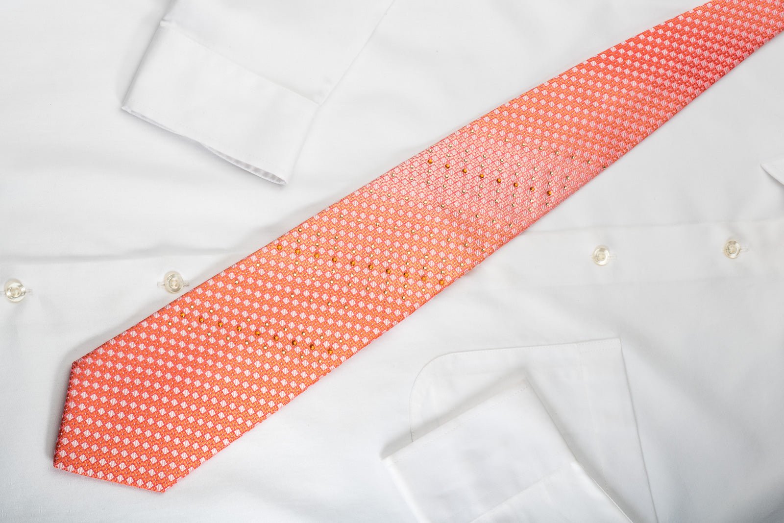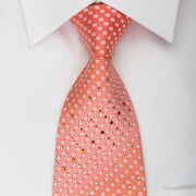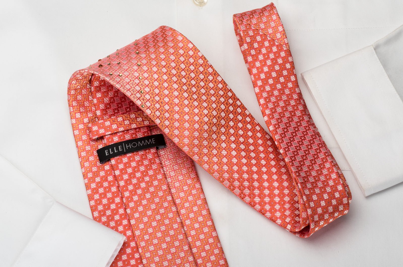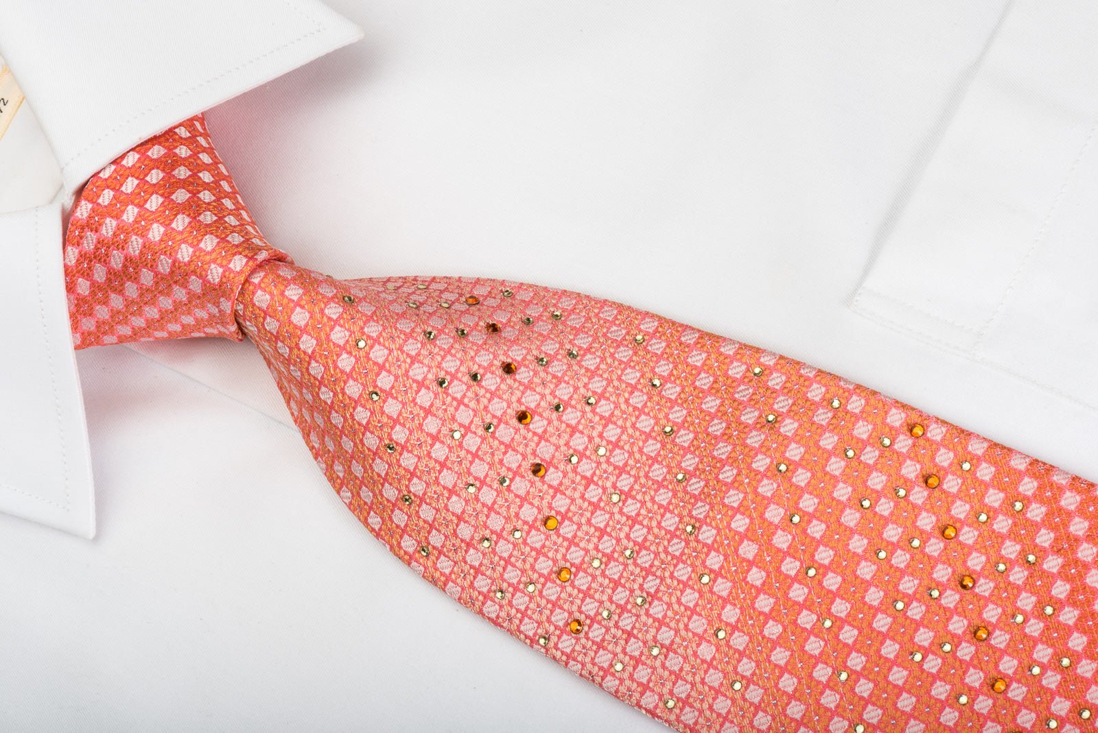 This is a stylish Rhinestone tie perfect for every occasion, handmade and designed by top brand name Elle Homme. Presenting an elegant Checkered design on orange silk and sparkling with white, orange Rhinestones and silver sparkles.