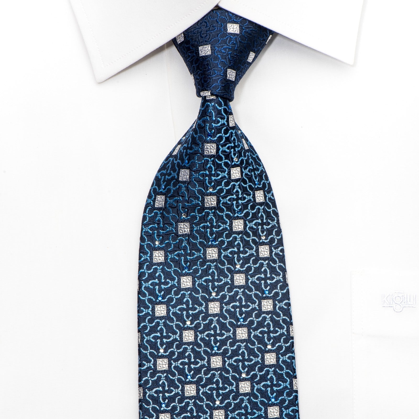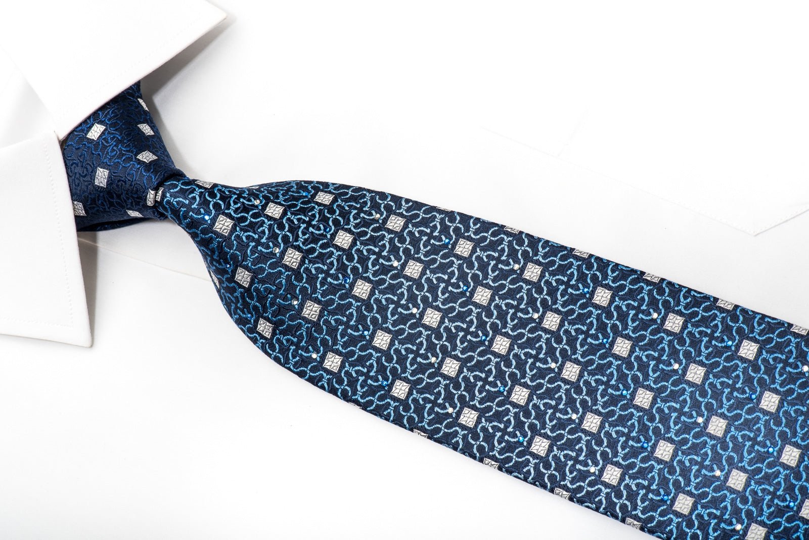 Emprise Mens Silk Necktie Geometric On Blue Sparkling With Rhinestones - San-Dee