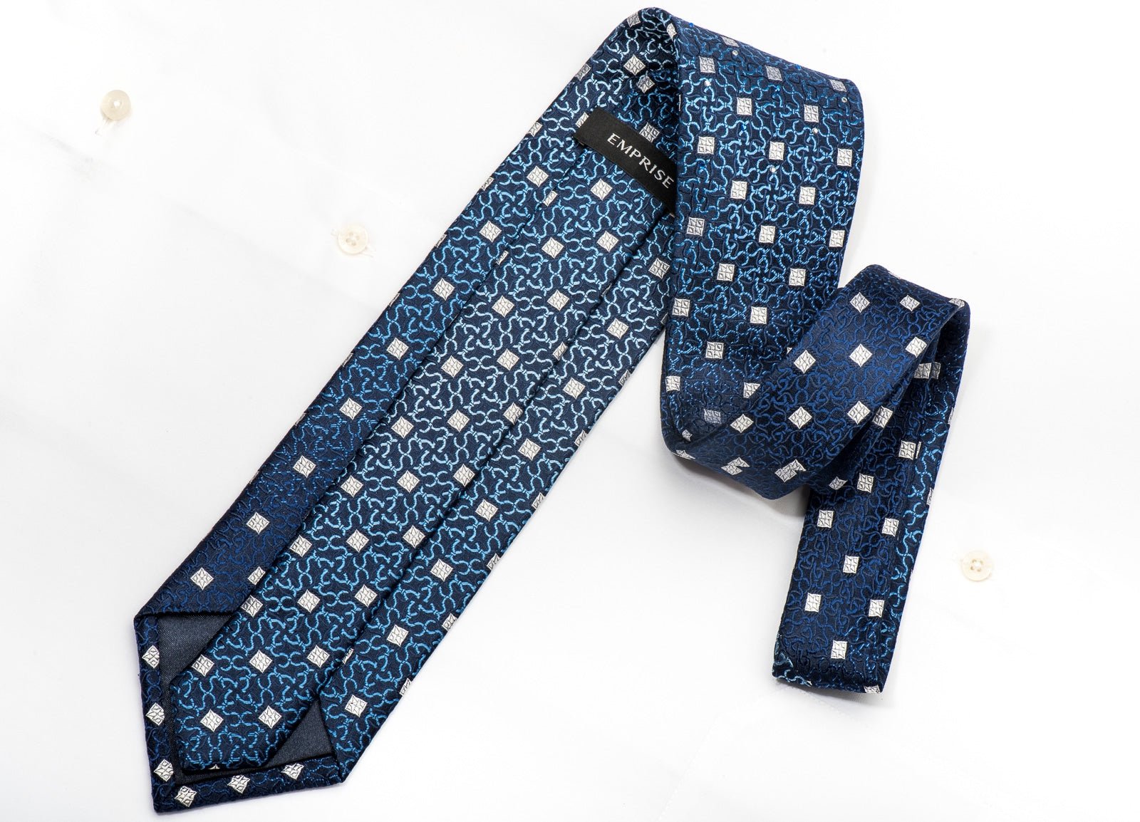 Stylish men's necktie perfect for every occasion handmade from the finest quality silk and designed by Emprise. Presenting an elegant geometric design on blue, sparkling with clear white and blue crystal Rhinestones.