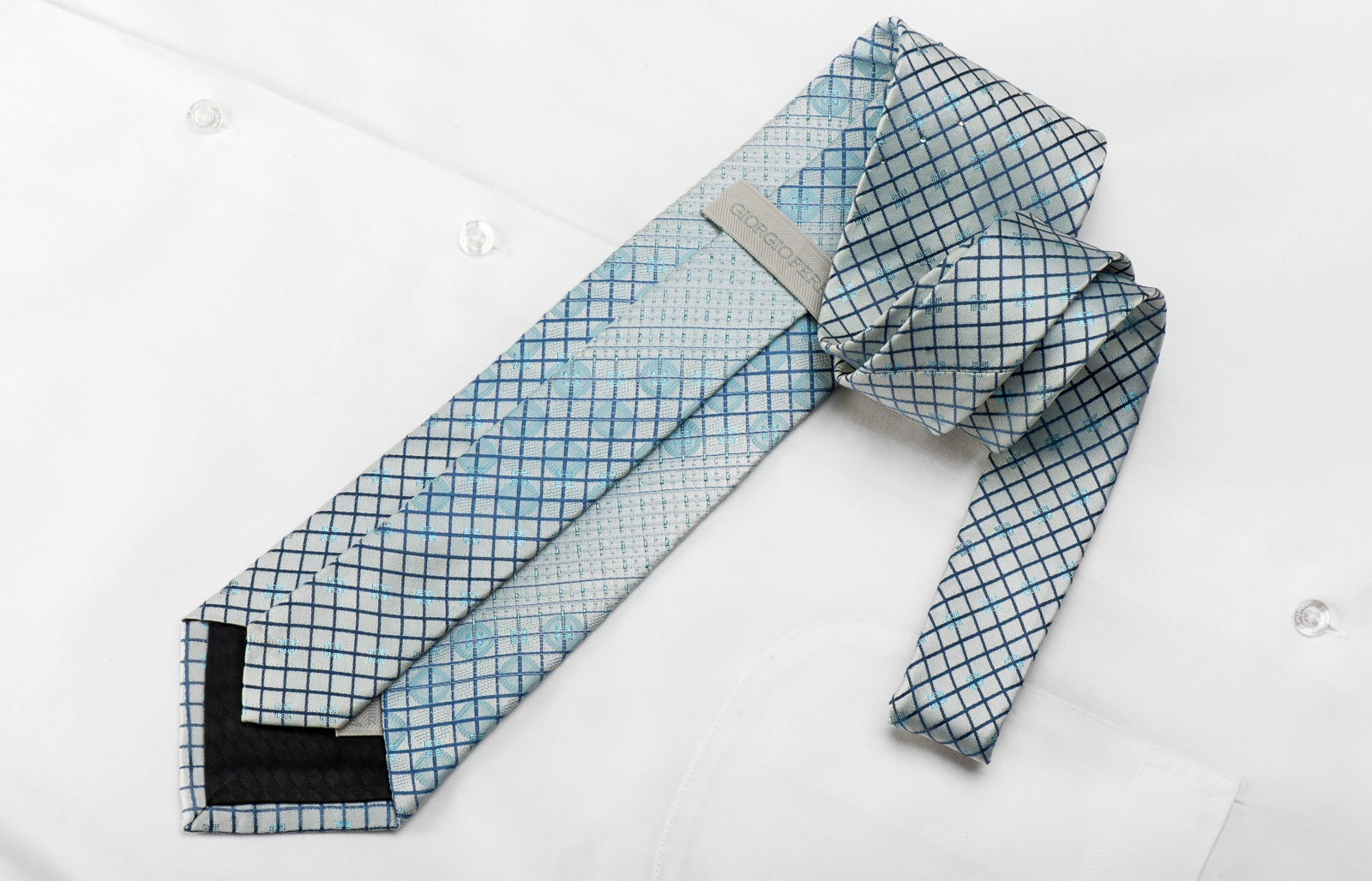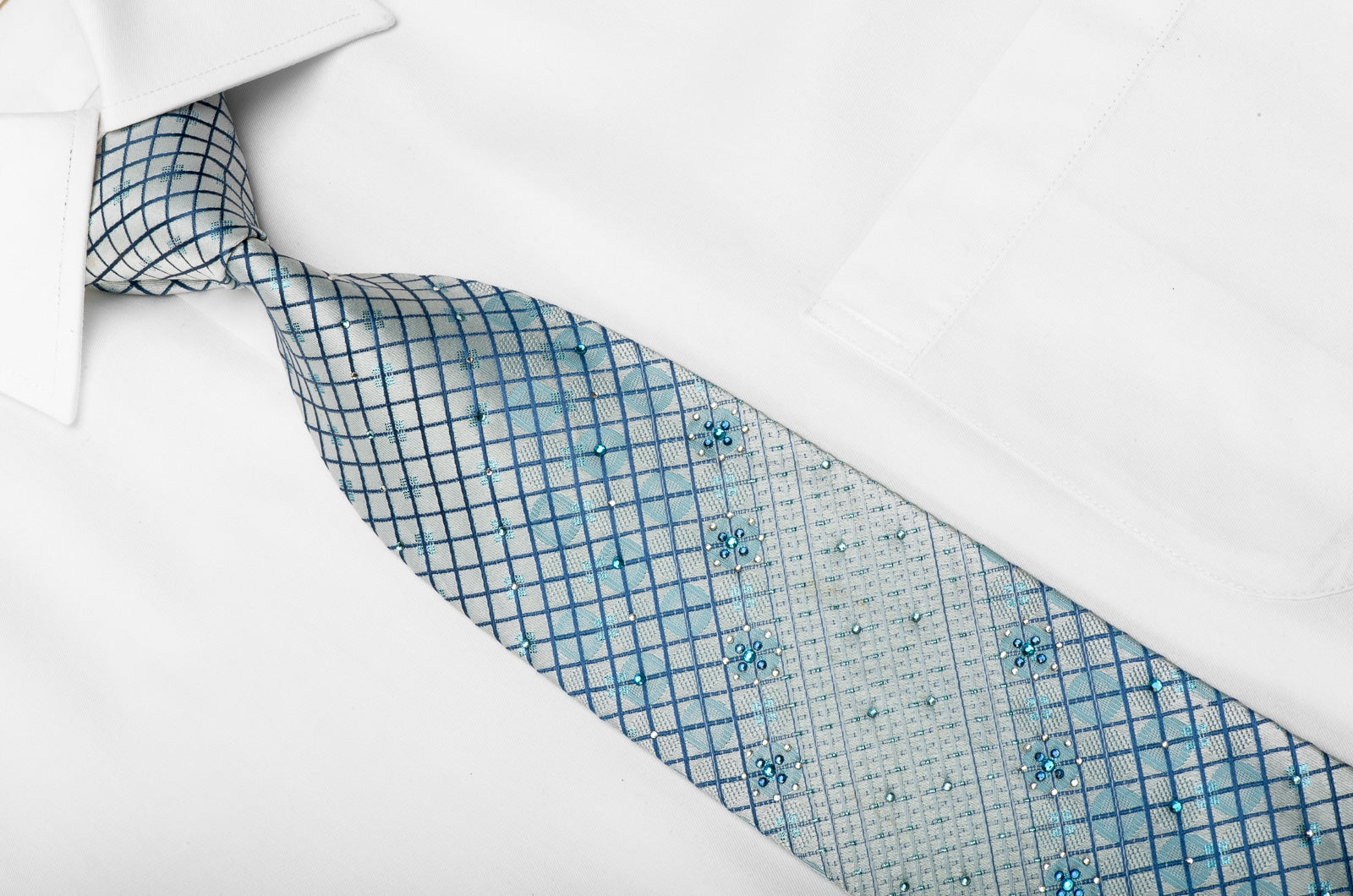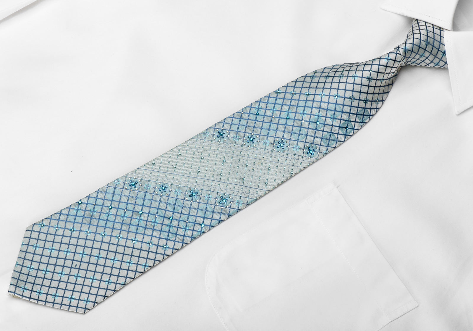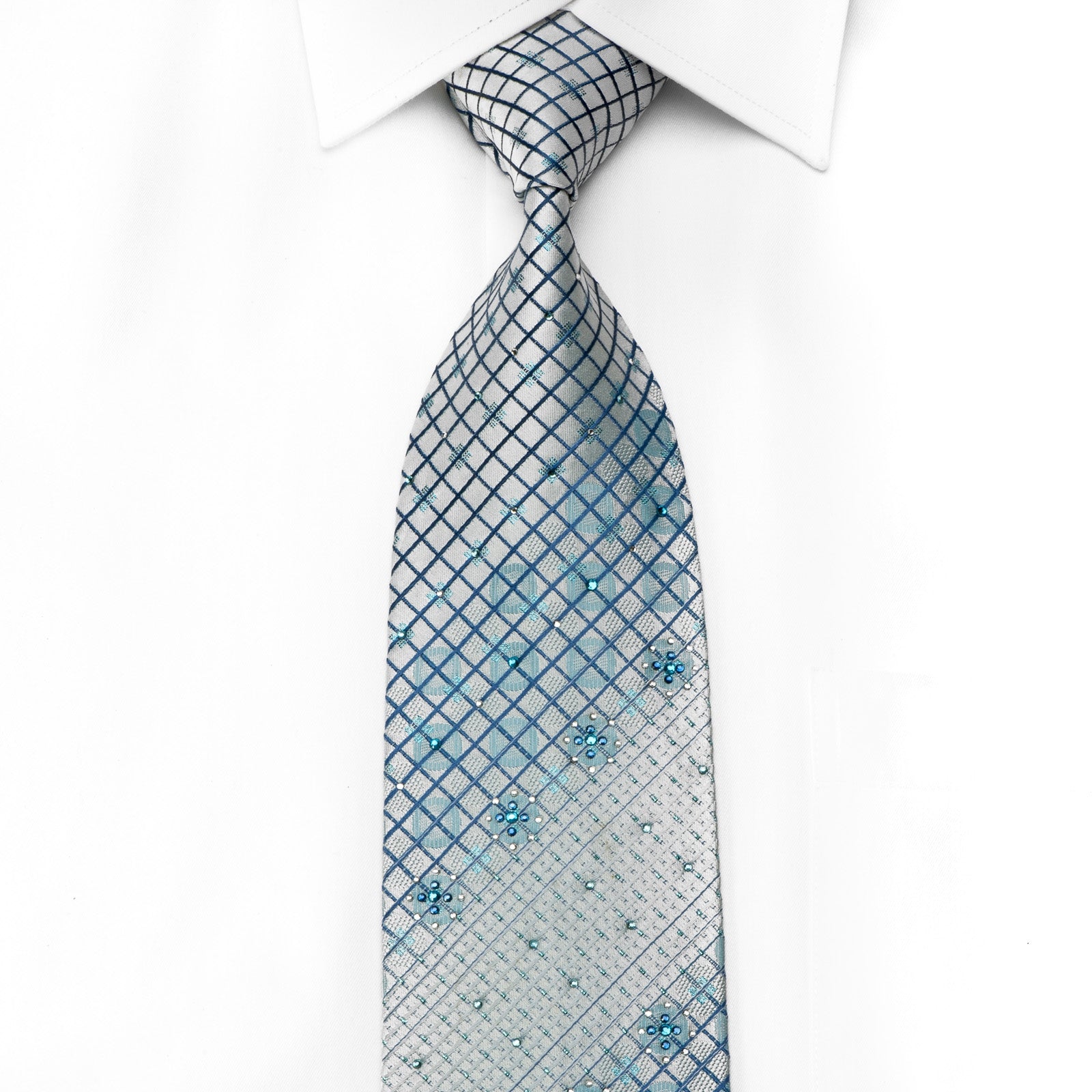 Stylish men's crystal Rhinestone silk necktie perfect on every occasion handmade and designed by top brand name Giorgio Ferri. Presenting an elegant woven Trellis design on light blue silk, sparkling with clear white, blue crystal Rhinestones and blue sparkles.