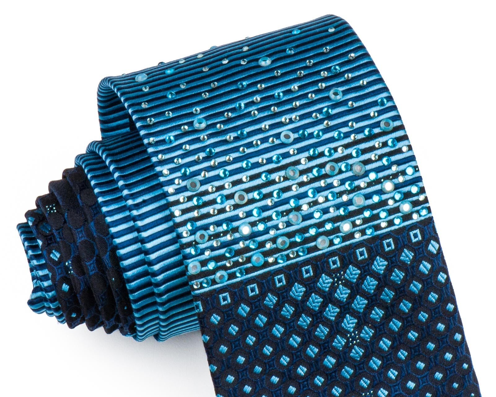 Gorgeous hand made men's silk necktie by brand name Grang Cia with amazing design presenting light blue horizontal stripes and geometric dots design on dark blue with metallic blue sparkles, complemented with beautiful blue and clear white Rhinestones and micro mirrors.