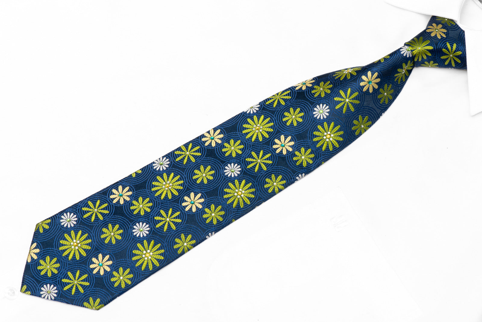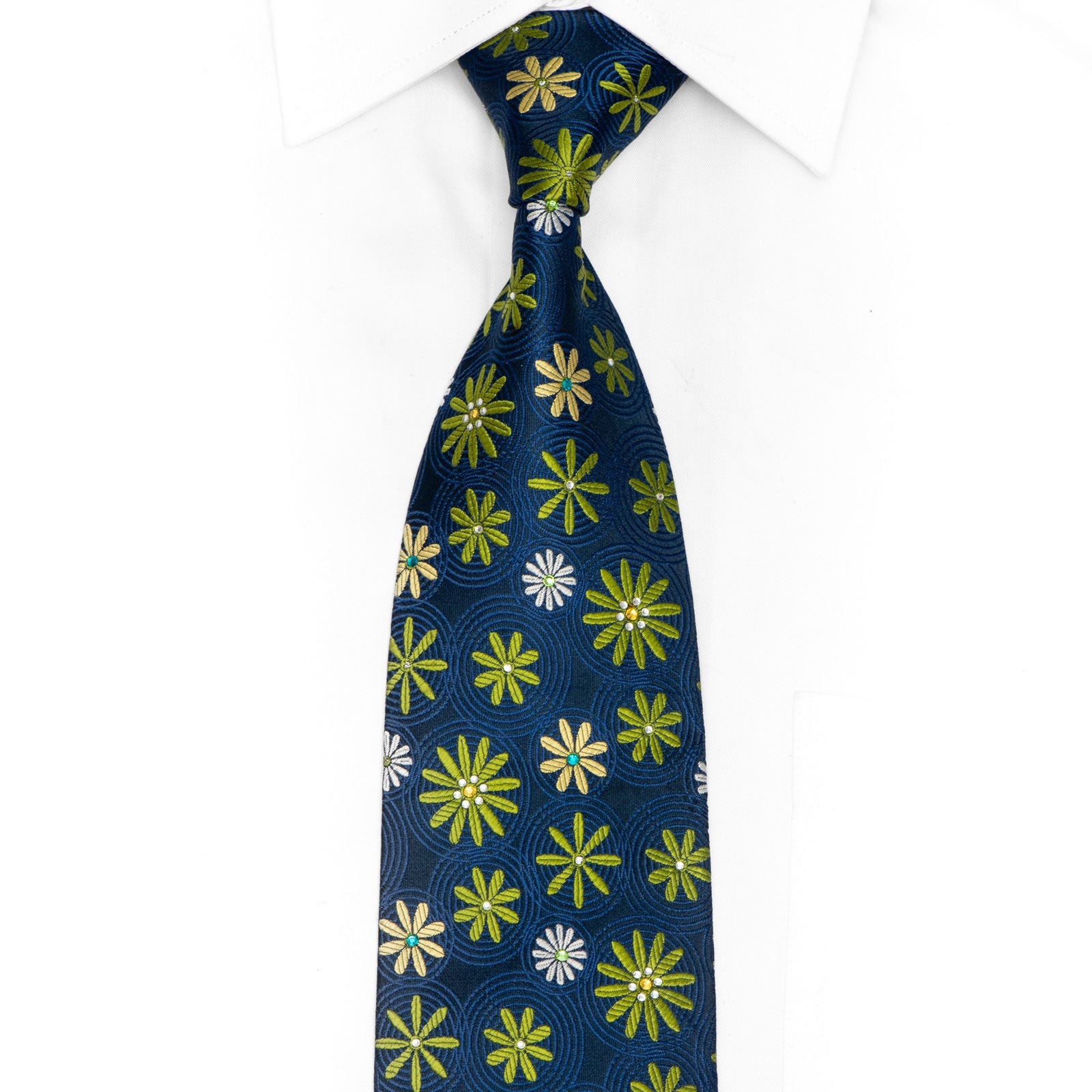 Silk necktie in navy blue featuring a refined green floral pattern enhanced with delicate rhinestone embellishments.