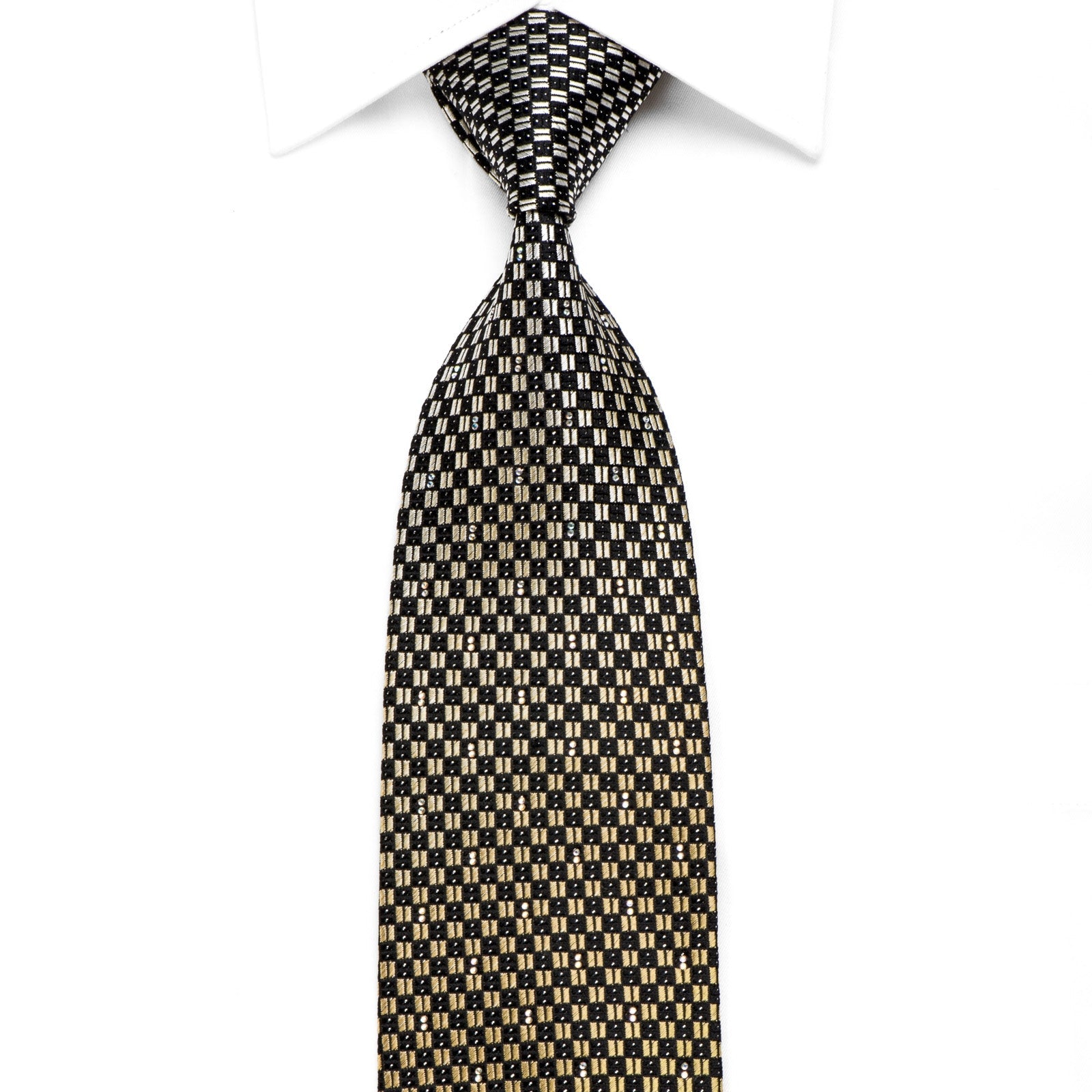 Material - SilkDesign - CheckeredColor - Black, Gold, SilverLength - Classic (57 in.-60 in.)(145 cm-153 cm)Width - Classic (3 1/4 in.-3 3/4 in.)(8 cm-9.5 cm)Special Features - AB Rhinestones, Silver Sparkles