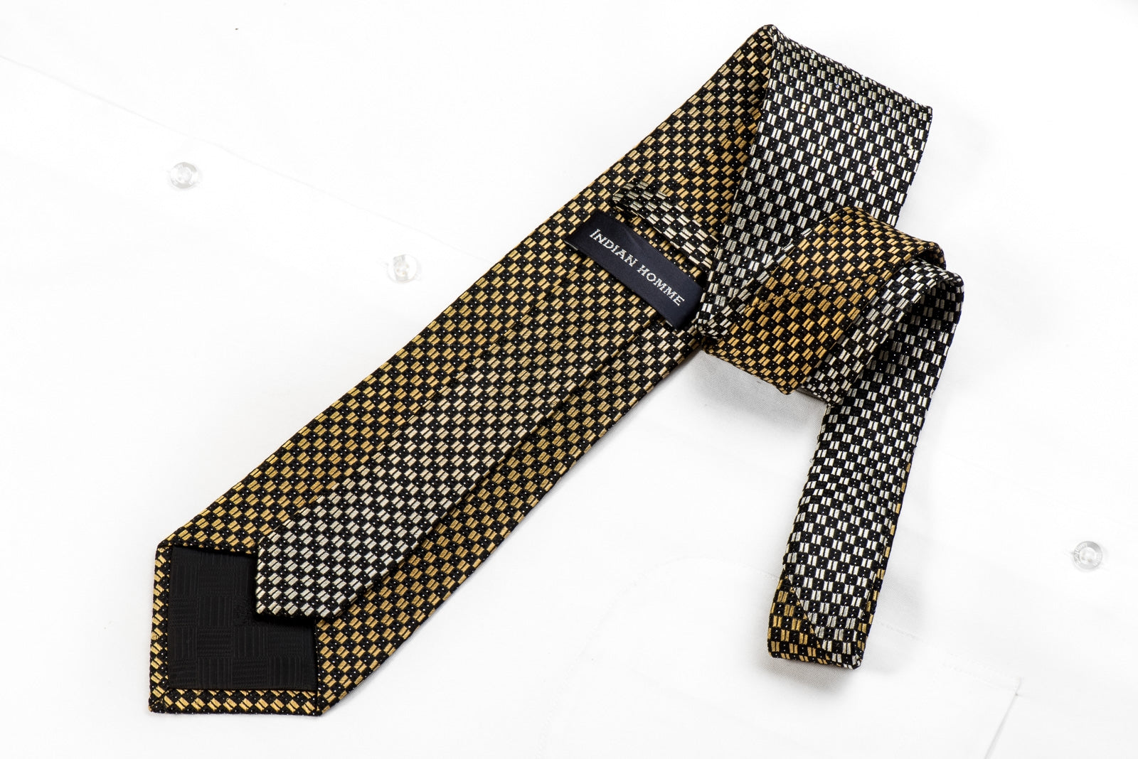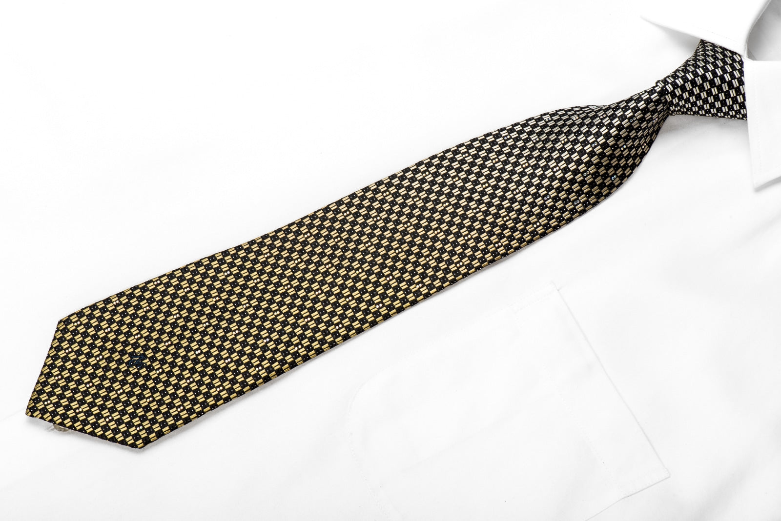 Stylish men's crystal necktie perfect for every occasion handmade from the finest quality silk and designed by top brand name Indian Homme. Presenting an elegant woven silver, gold, black Checkered design, sparkling with crystal AB Rhinestones and embellished with metallic silver sparkles.